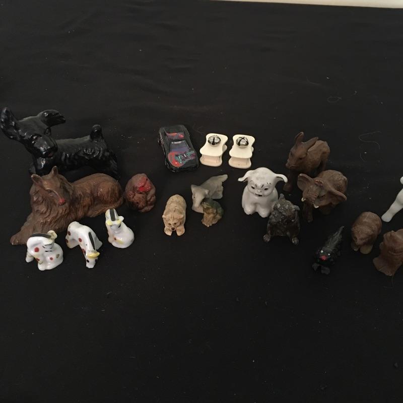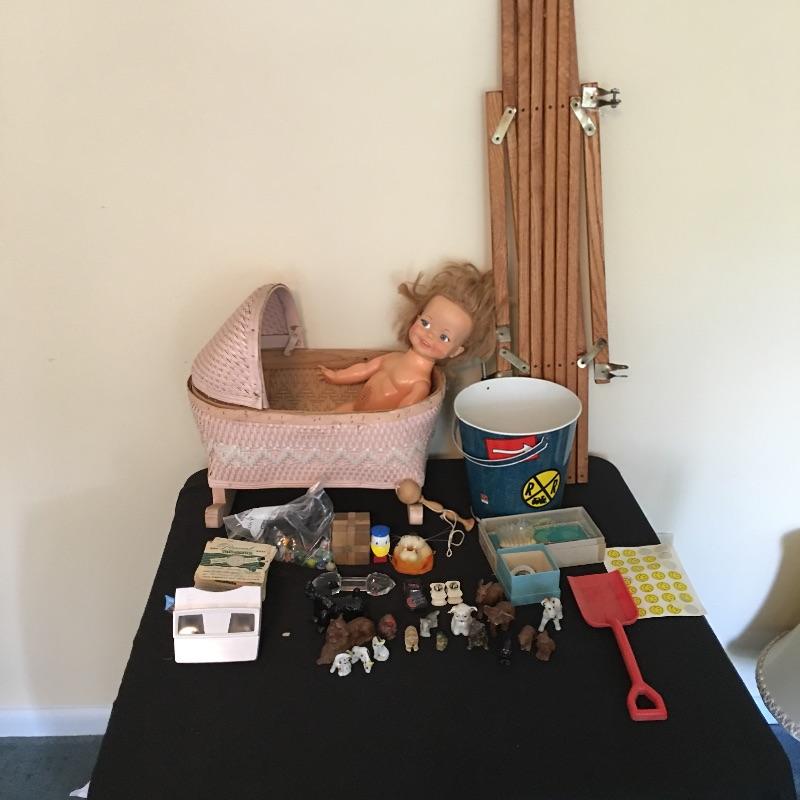 This collection of toys will bring back memories of a carefree childhood. Lot includes marbles, View-Master, wooden block, doll, doll bed, Lullaby sterling baby brush and comb, sterling rattle, animal figures in a variety of materials including ceramic, plastic and metal, child gate and Balboa Baby sling.