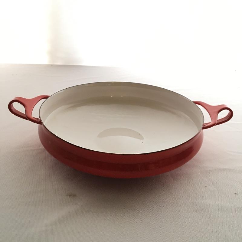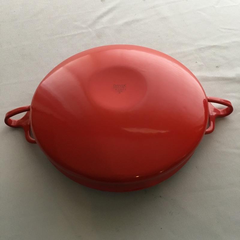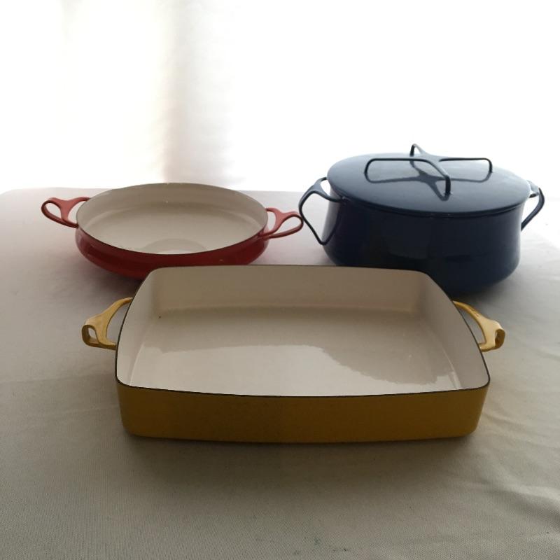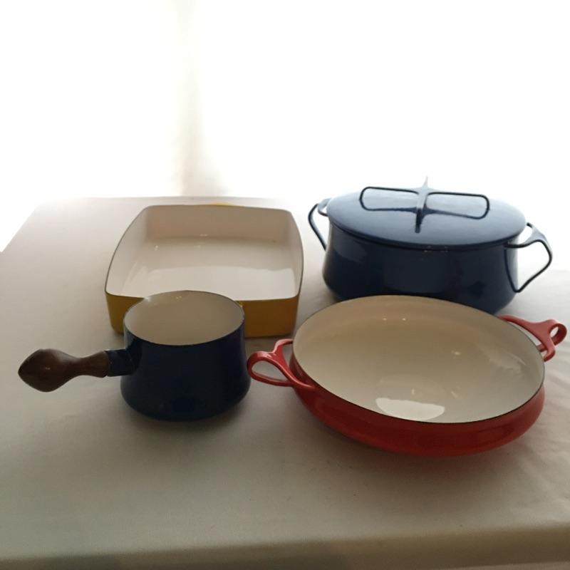 Dansk Kobenstyle Enamel covered service ware. Lot includes casserole dish, Dutch oven, sauce pot with spout and paella pan. Dutch oven measures 10”D x 6.25” tall. These pieces seem barely used. Shipping available.