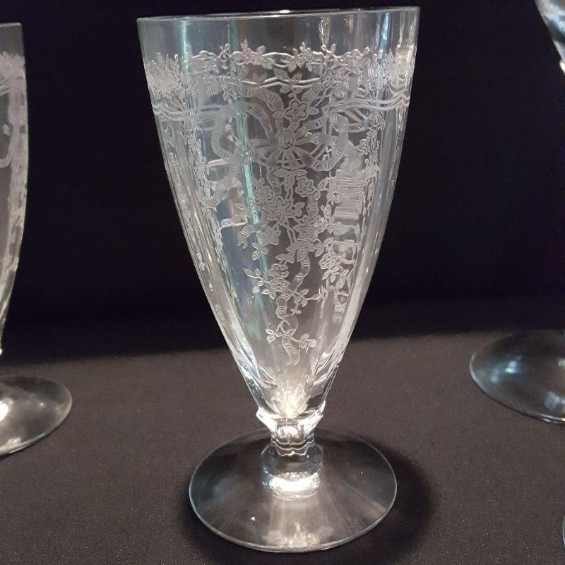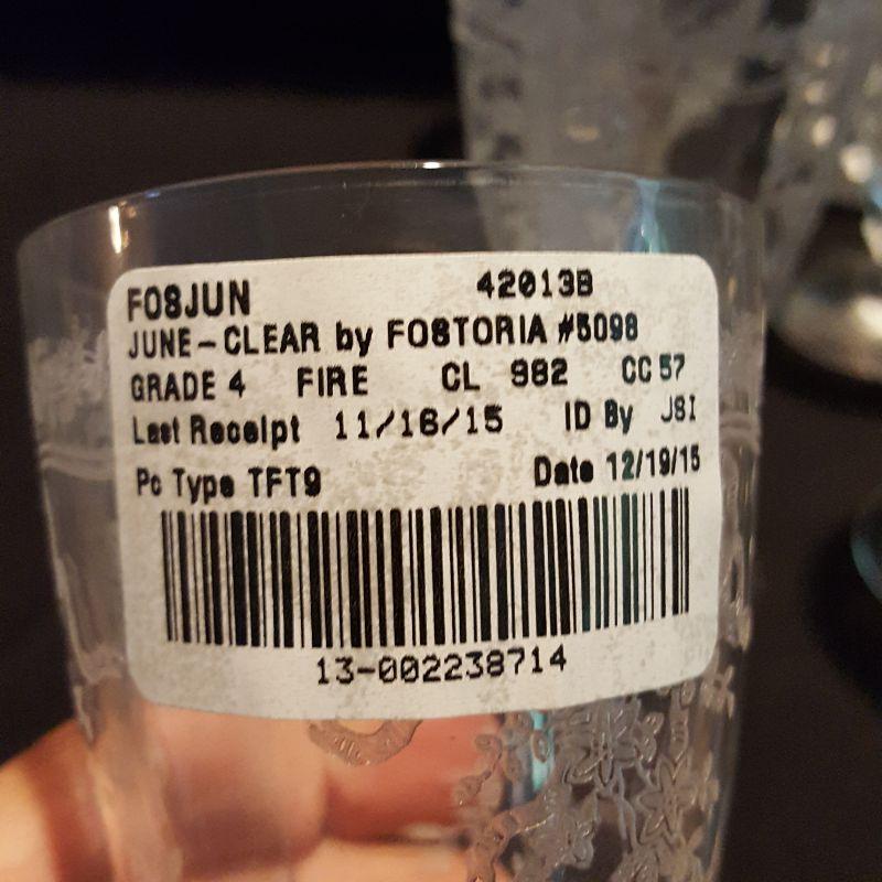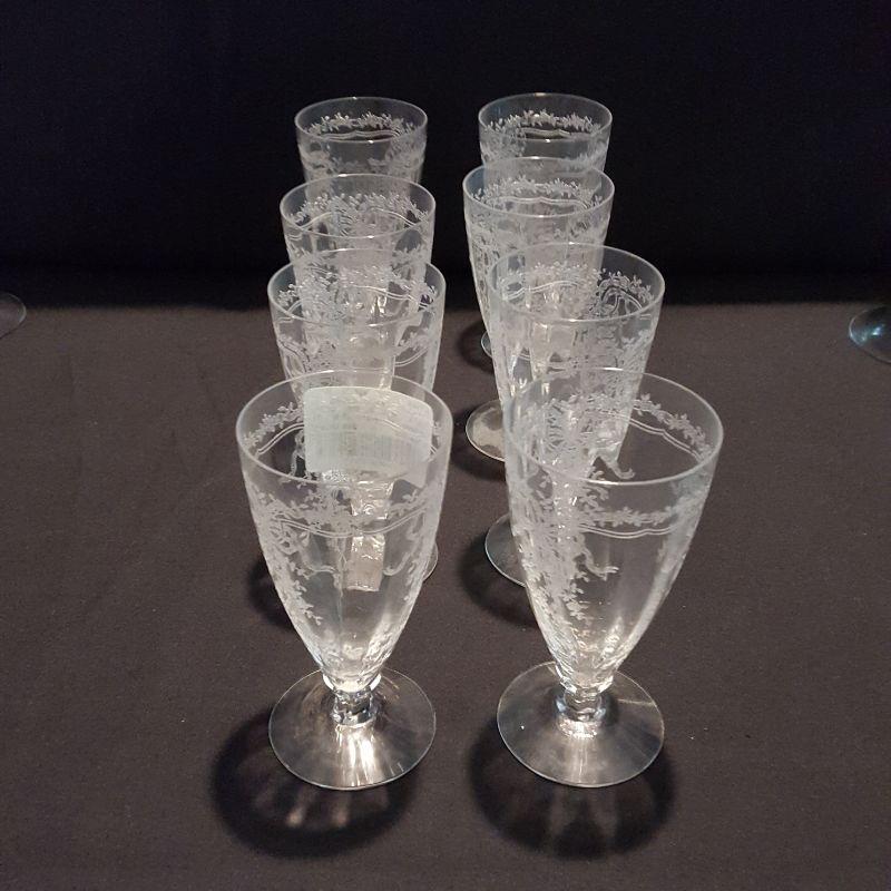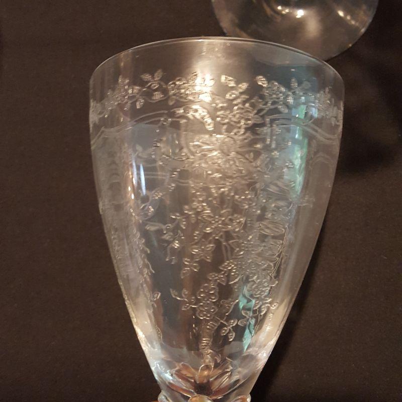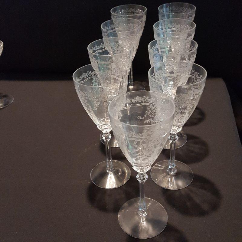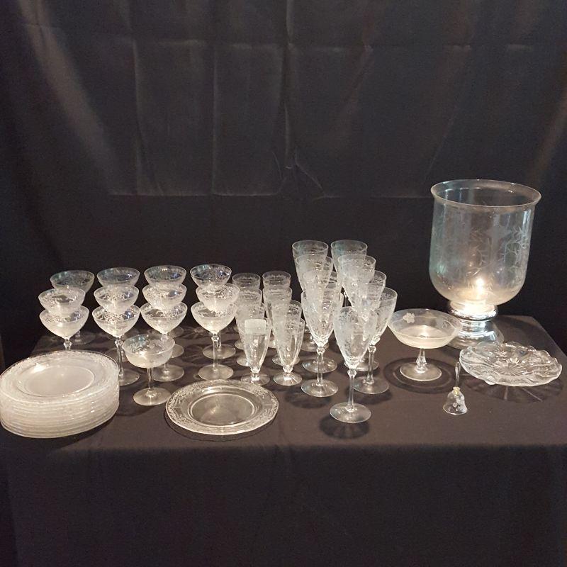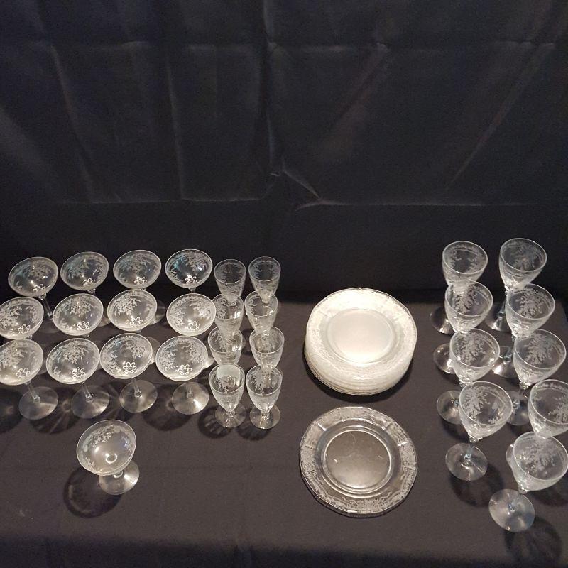 This is a lot of clear, gorgeous glassware!! 12 small 9 inch salad plates, 12 champagne 6 inch glasses, 9 larger 8 1/4 inch glasses, 8 smaller 5 1/4 inch glasses that are all part of a set called June by Fostoria.
