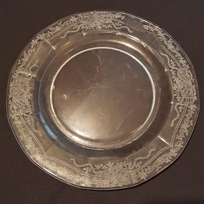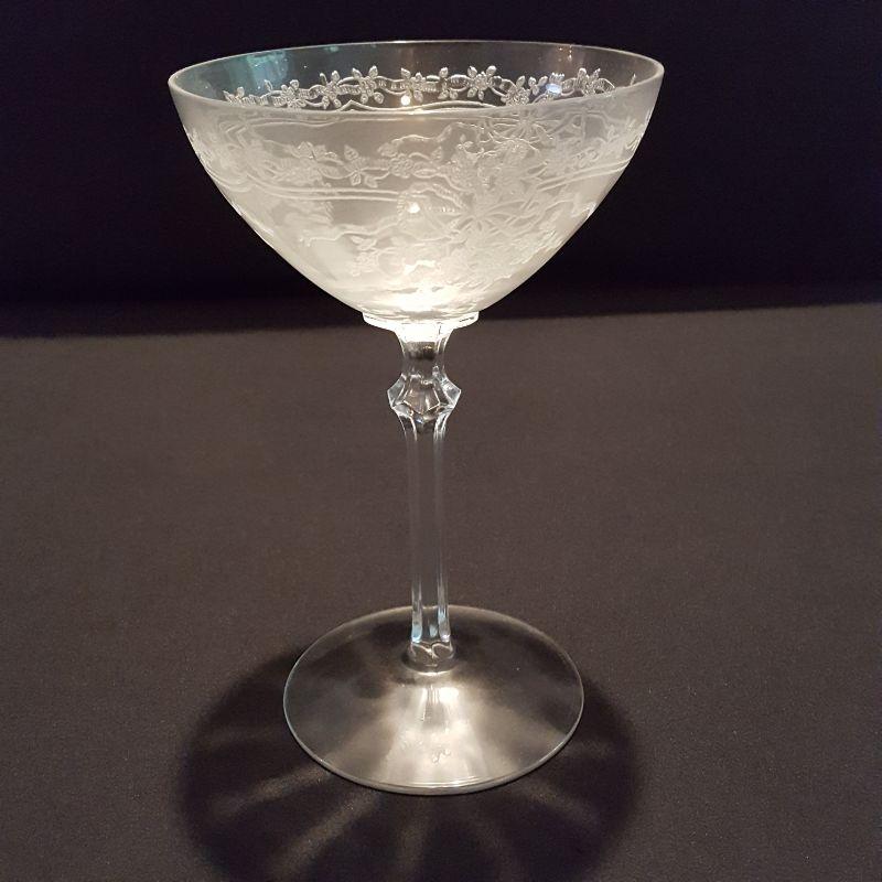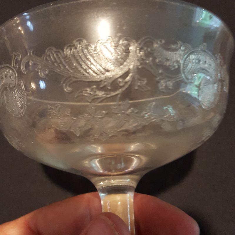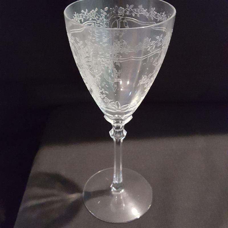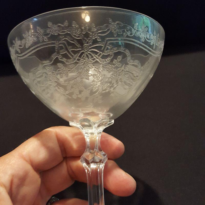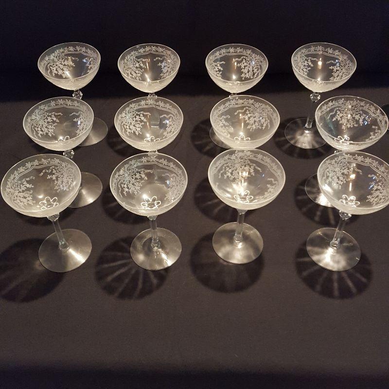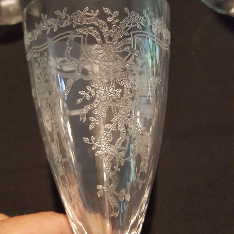 This is a lot of clear, gorgeous glassware!! 12 small 9 inch salad plates, 12 champagne 6 inch glasses, 9 larger 8 1/4 inch glasses, 8 smaller 5 1/4 inch glasses that are all part of a set called June by Fostoria.