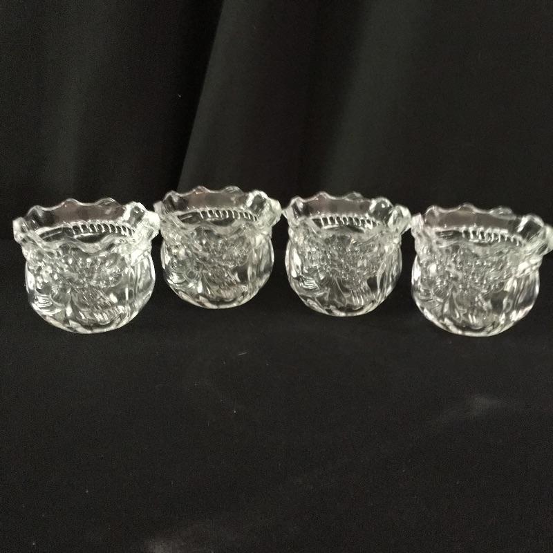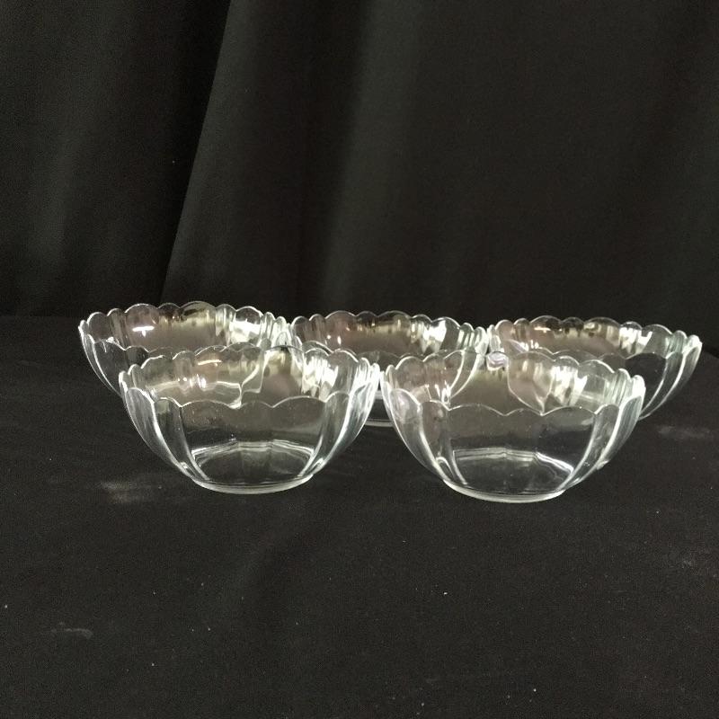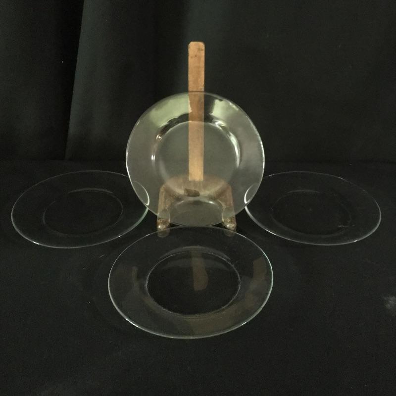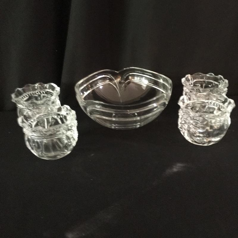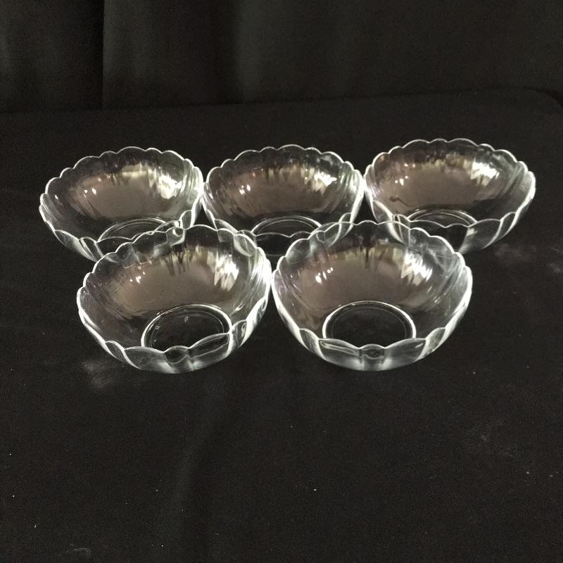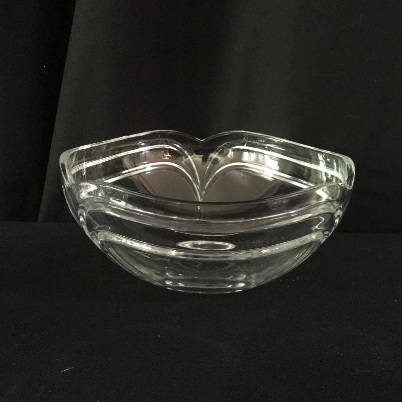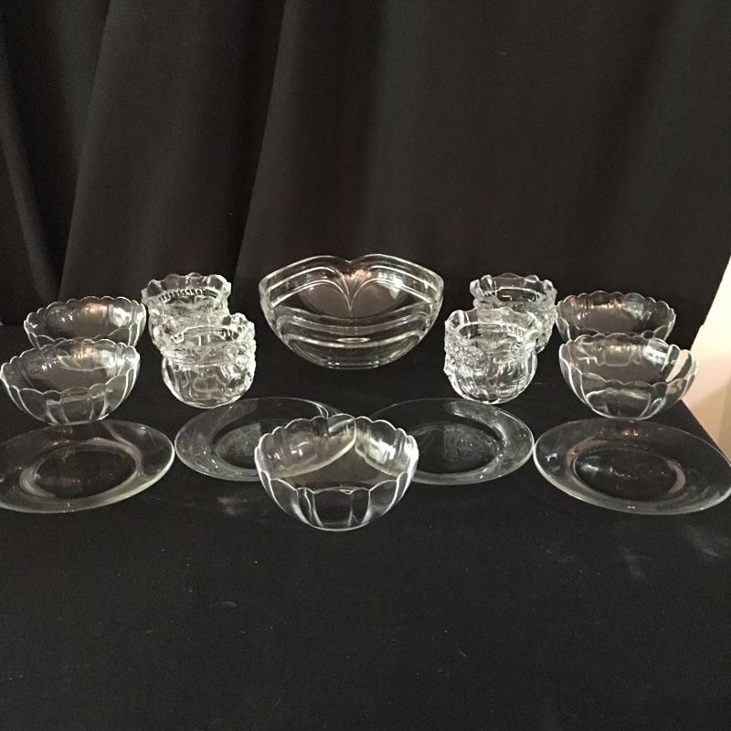 A lovely selection of unique glass bowls and plates that includes four small bowls, five medium bowls, one large bowl and four small plates. Largest bowl measures 9.5”D x 4.25” tall.
