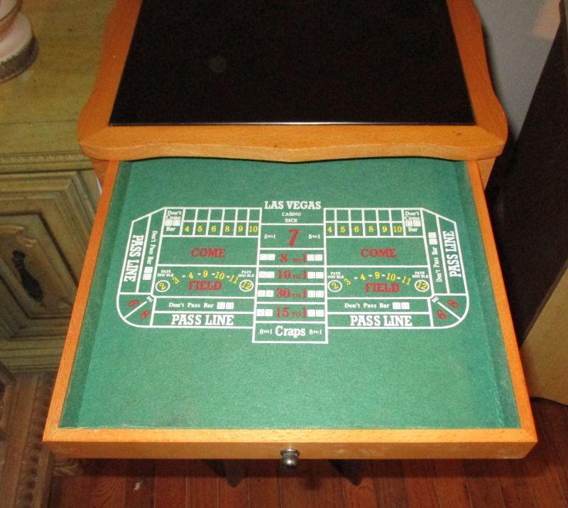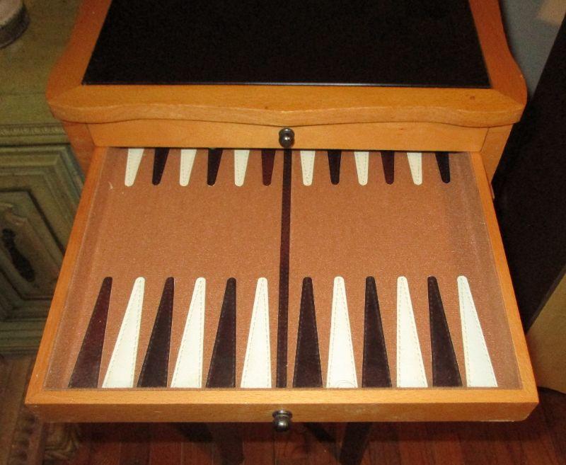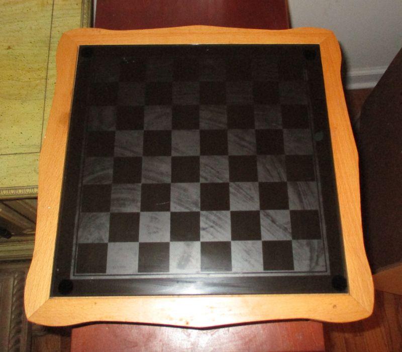 The top is a black glass checker/chess board that comes off and then you can pull out the drawers and set them on top. The pieces (backgammon chips, chess pieces, checkers) are not included/found. 13.75" square.