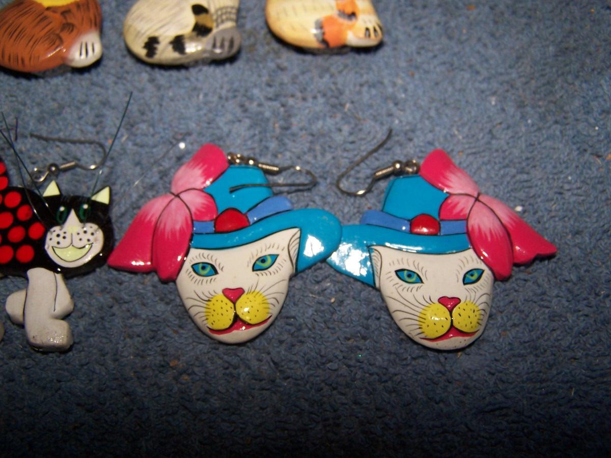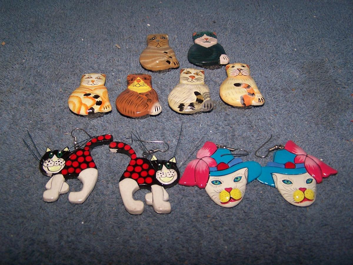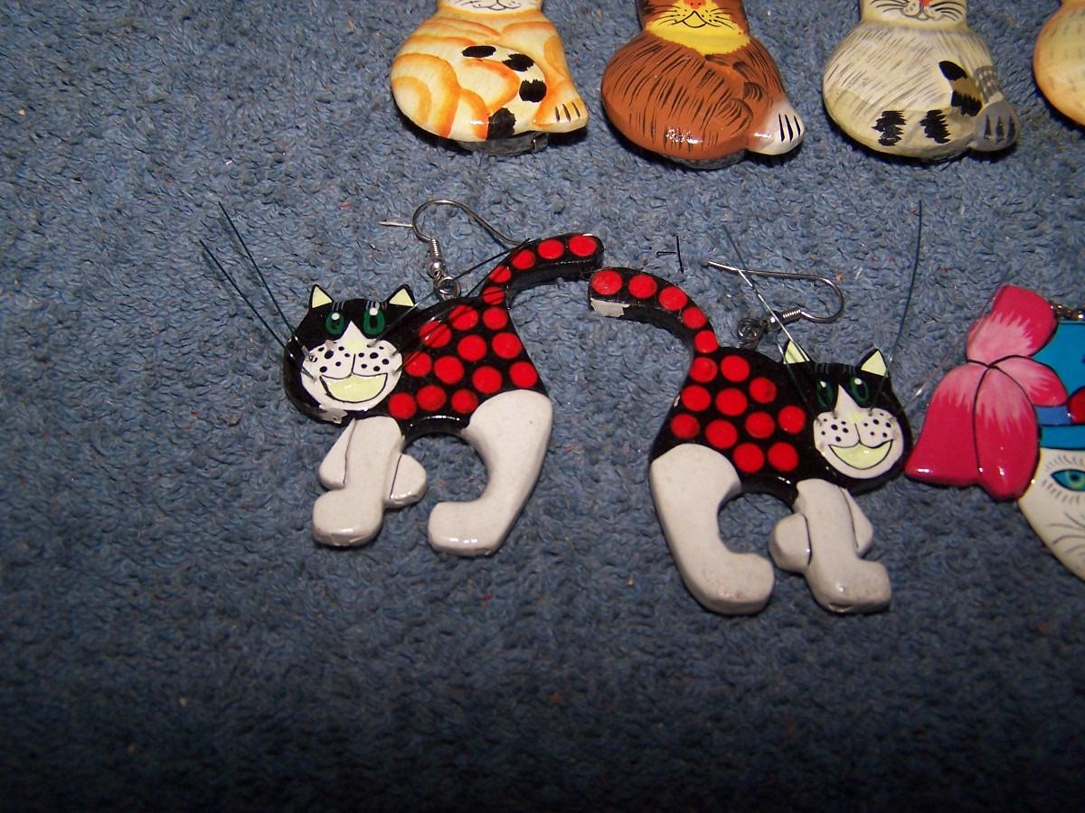 THIS IS SOME GREAT PAINTED WOOD CAT JEWELRY!!! EARRINGS & BUTTON COVERS-1 5/8'' ACROSS.. SLIGHT WEAR..