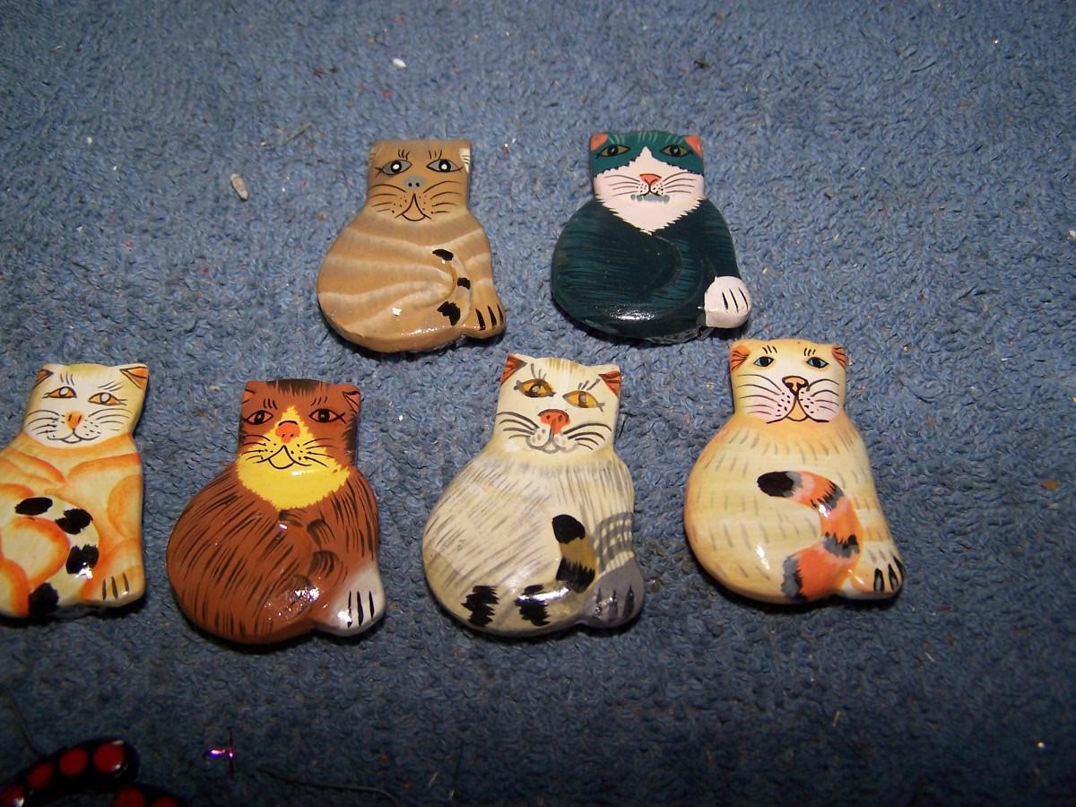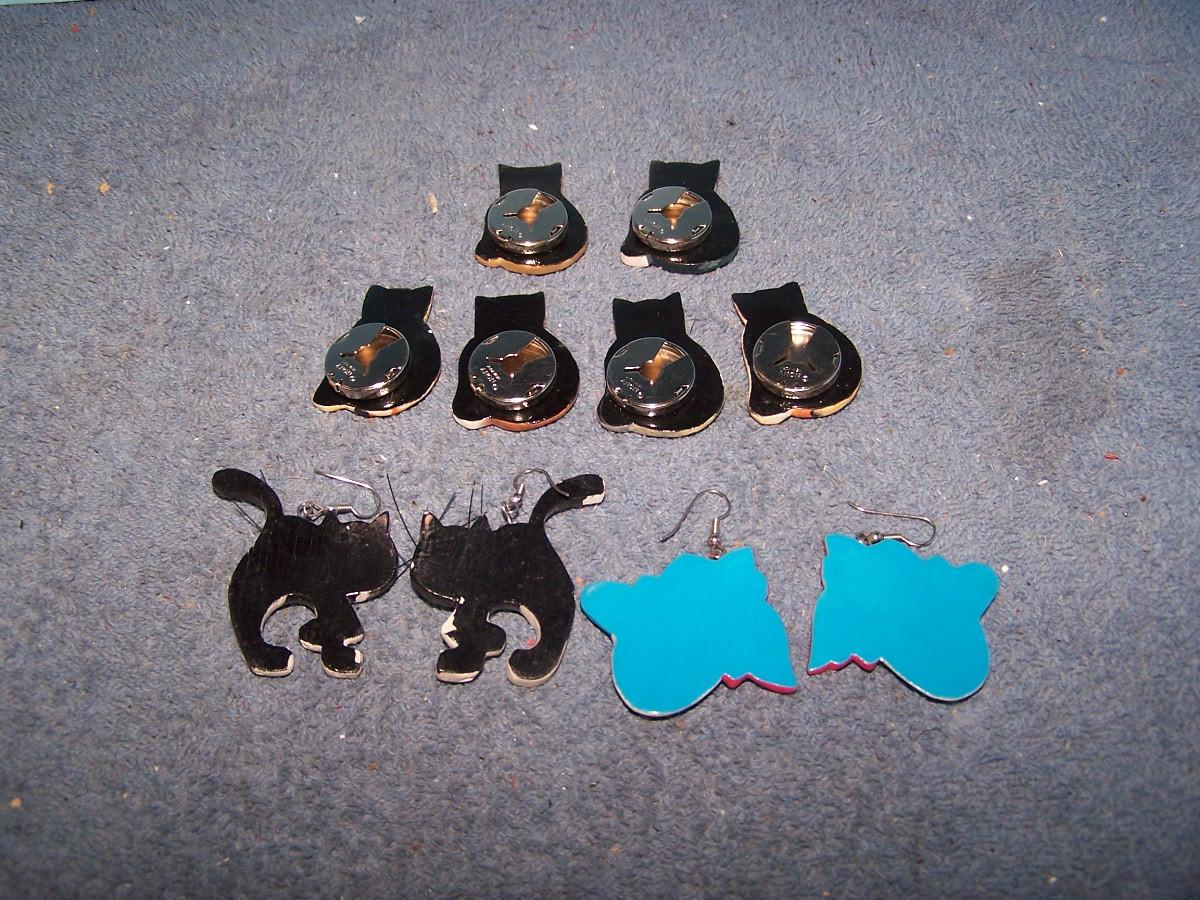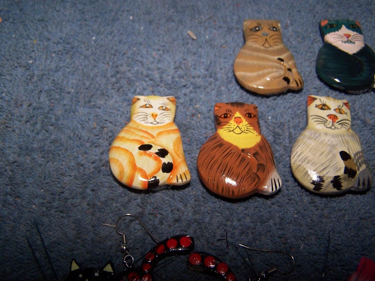 THIS IS SOME GREAT PAINTED WOOD CAT JEWELRY!!! EARRINGS & BUTTON COVERS-1 5/8'' ACROSS.. SLIGHT WEAR..