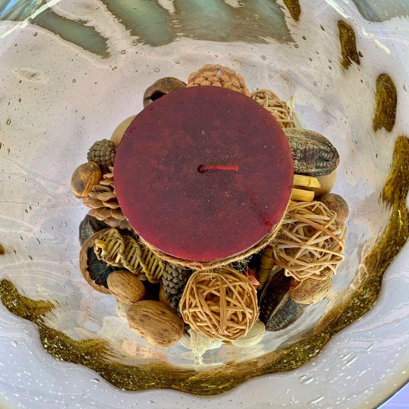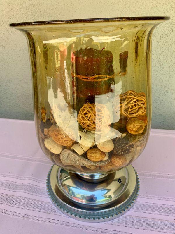 Amber color clear glass urn fits into metal base. Filled with a thick candle and natural elements.