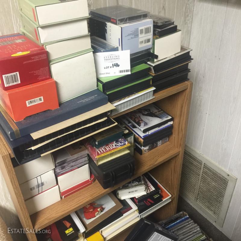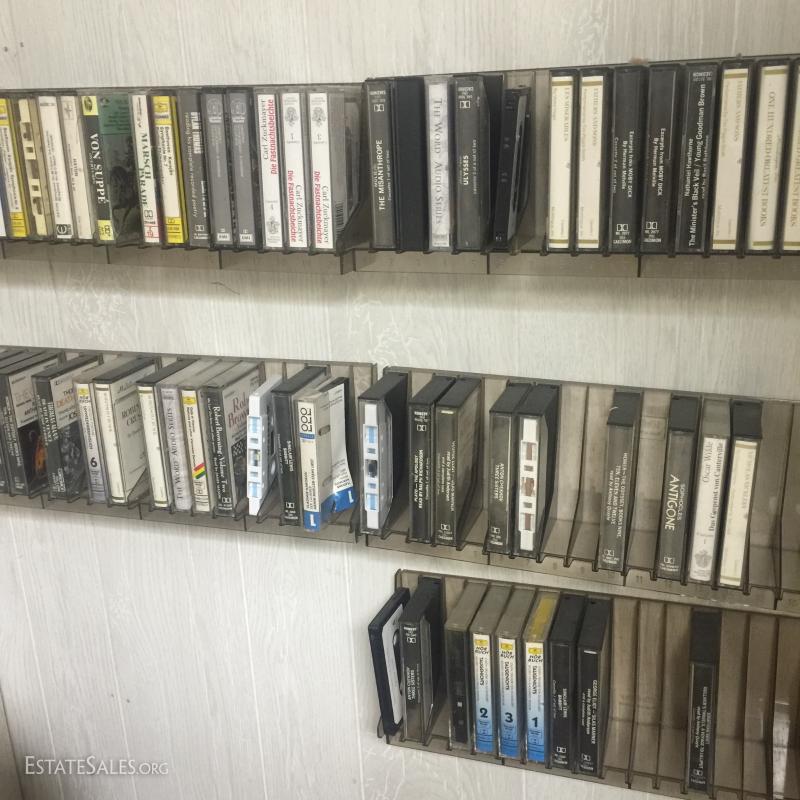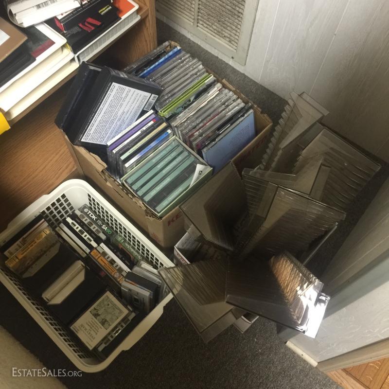 Large lot of CD's and tapes. Includes books on tape. Shelf unit, cassette tape holders and bins included.
