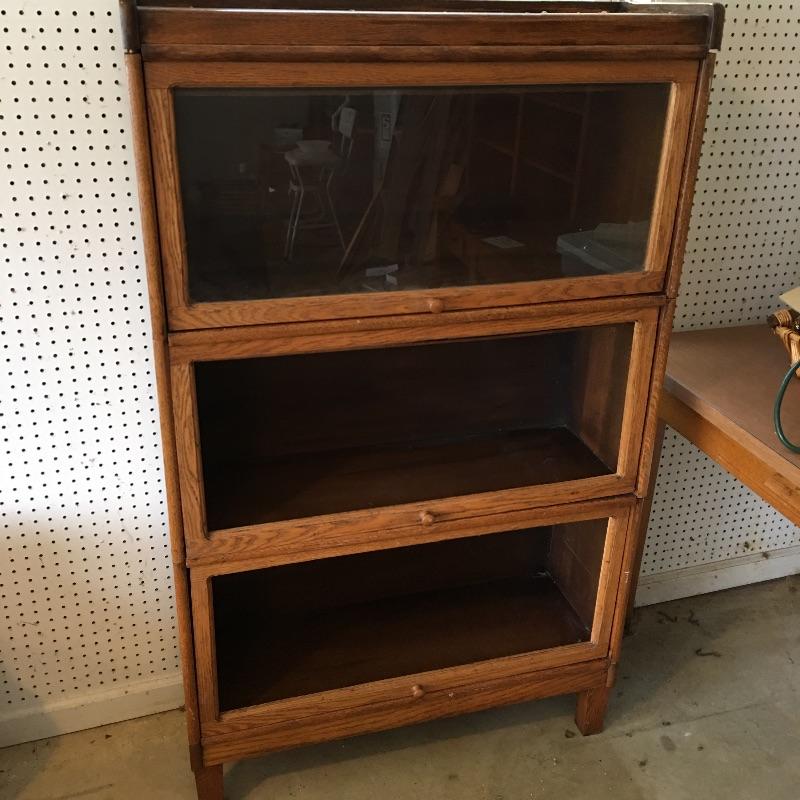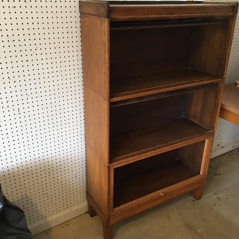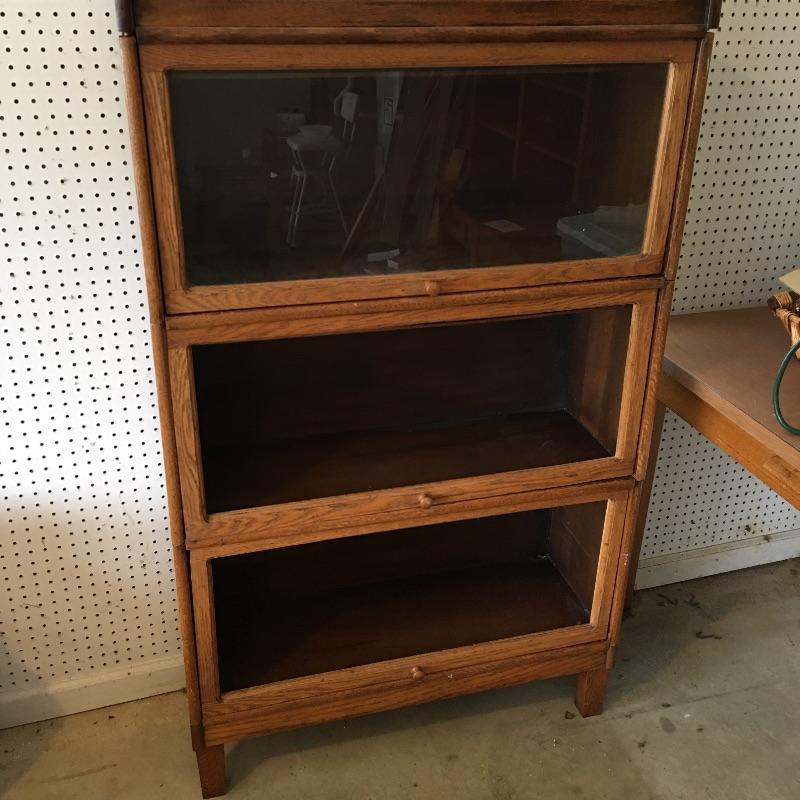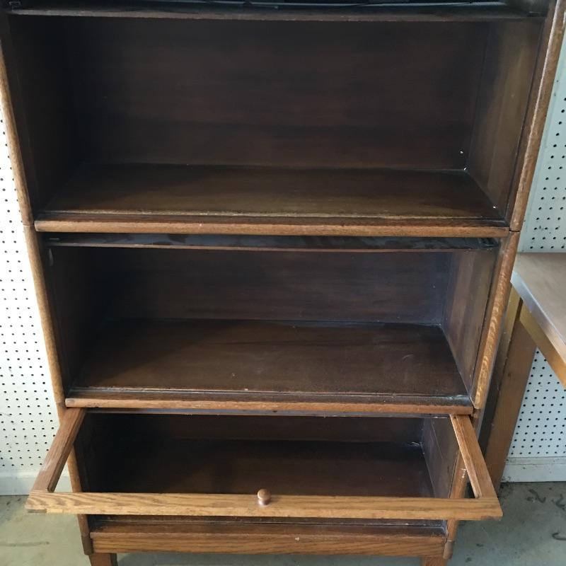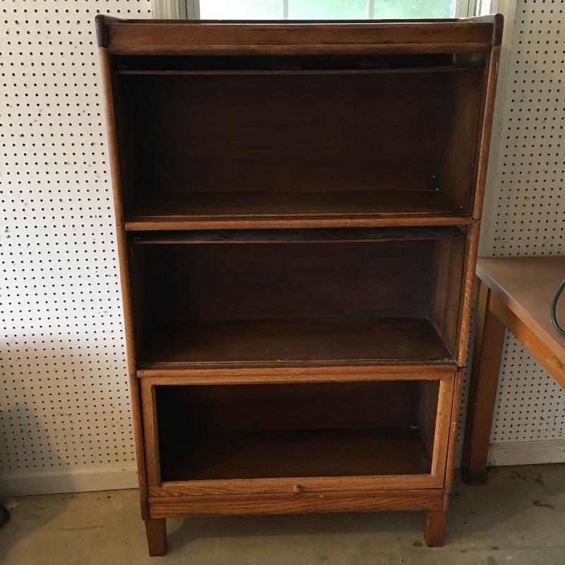 This lawyers bookcase has three separate cases with front doors of wood and glass with a base and a top. Two doors are missing glass and two have been removed from bookcase, see pictures. Bookcase measures 12” x 34” x 56.5”. Bookshelf as a whole is slightly worn and appears wobbly, but overall it’s a great piece, especially if you have some time to work on it.