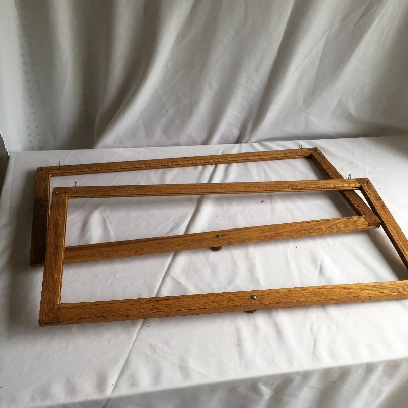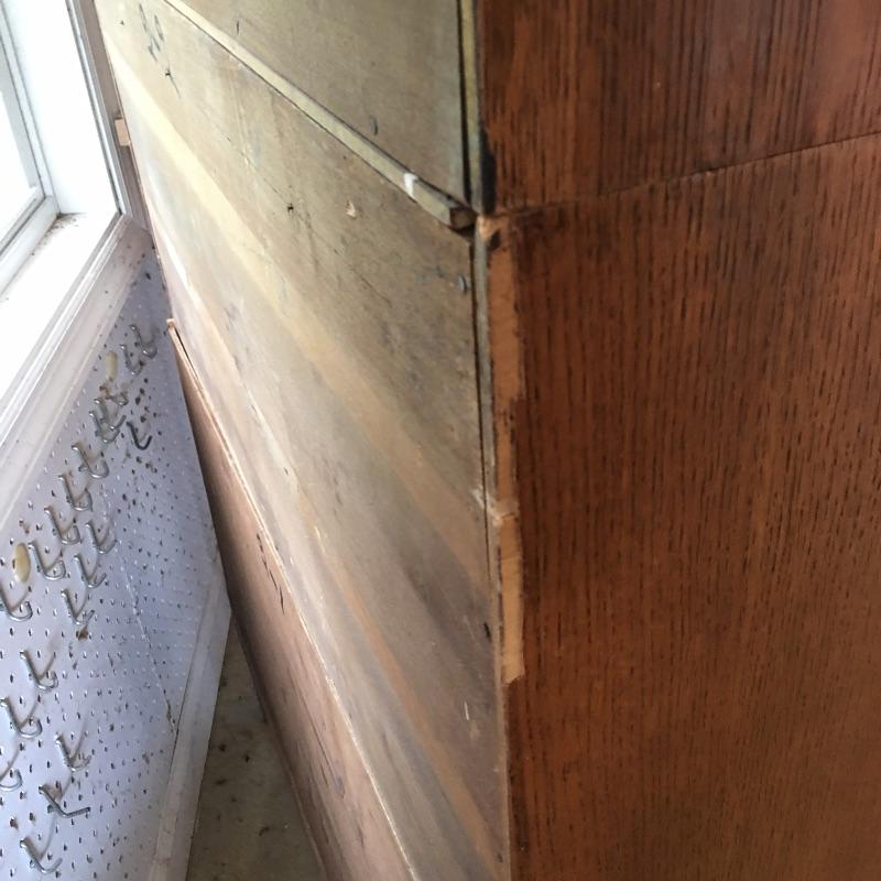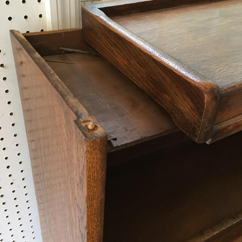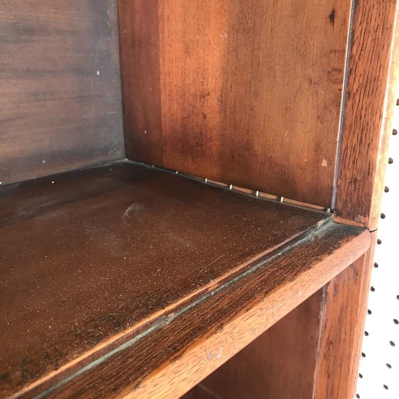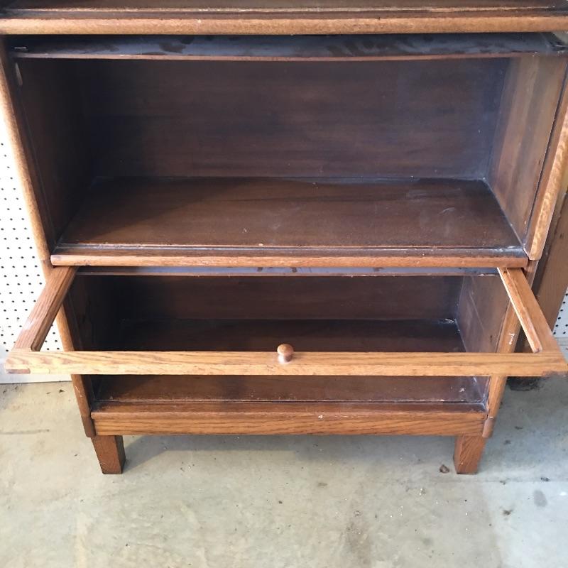 This lawyers bookcase has three separate cases with front doors of wood and glass with a base and a top. Two doors are missing glass and two have been removed from bookcase, see pictures. Bookcase measures 12” x 34” x 56.5”. Bookshelf as a whole is slightly worn and appears wobbly, but overall it’s a great piece, especially if you have some time to work on it.