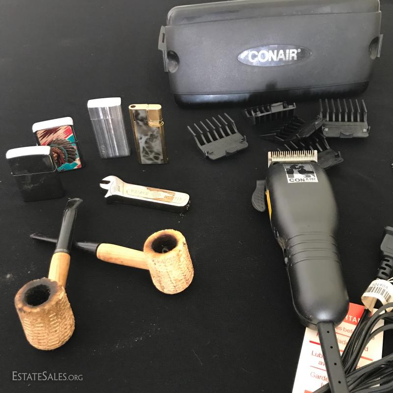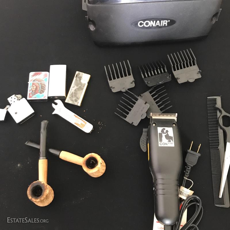 Five lighters including a Zippo, two corn cob pipes and a Conair Hair Clipper Set. Set includes attachments #2, 3, 4, 9 & 10. Also includes carrying case. Shipping or local pick up in Mills River, NC.