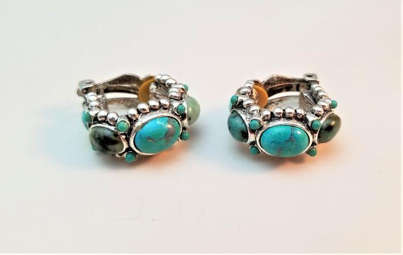 Cute little Mexican Silver lot - enhancer featuring the Mexican folk figure Kokopelli and a pair of clip earrings (not sterling) featuring natural turquoise. Enhancer is 2 inches long.