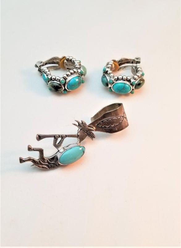 Lot #146  Mexican Sterling Kokopelli Enhancer and Pair of Clip Earrings - Turquoise