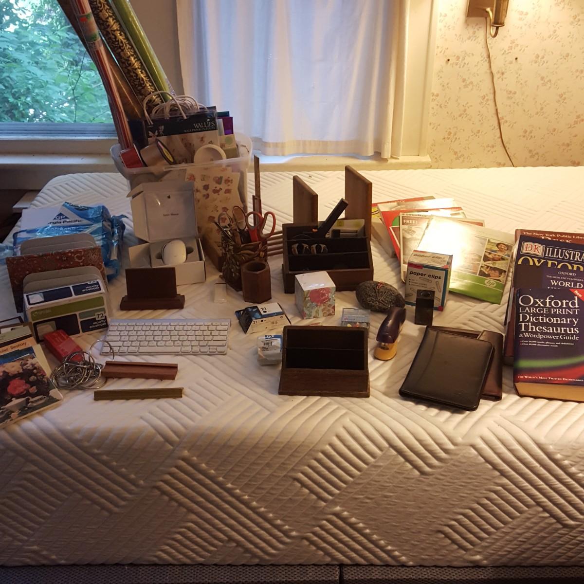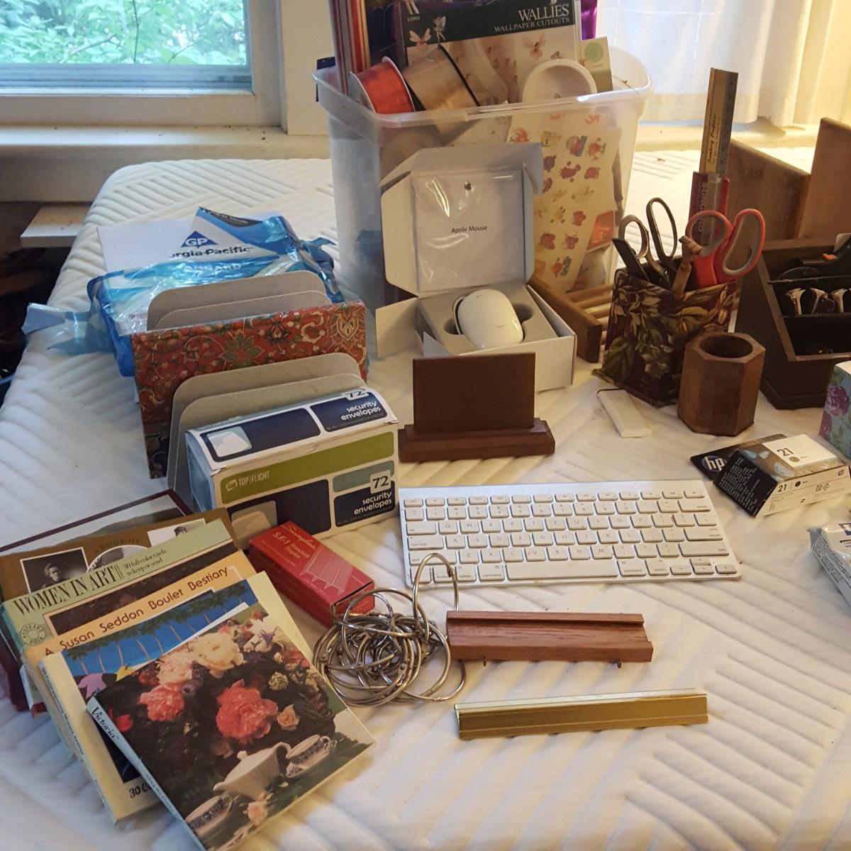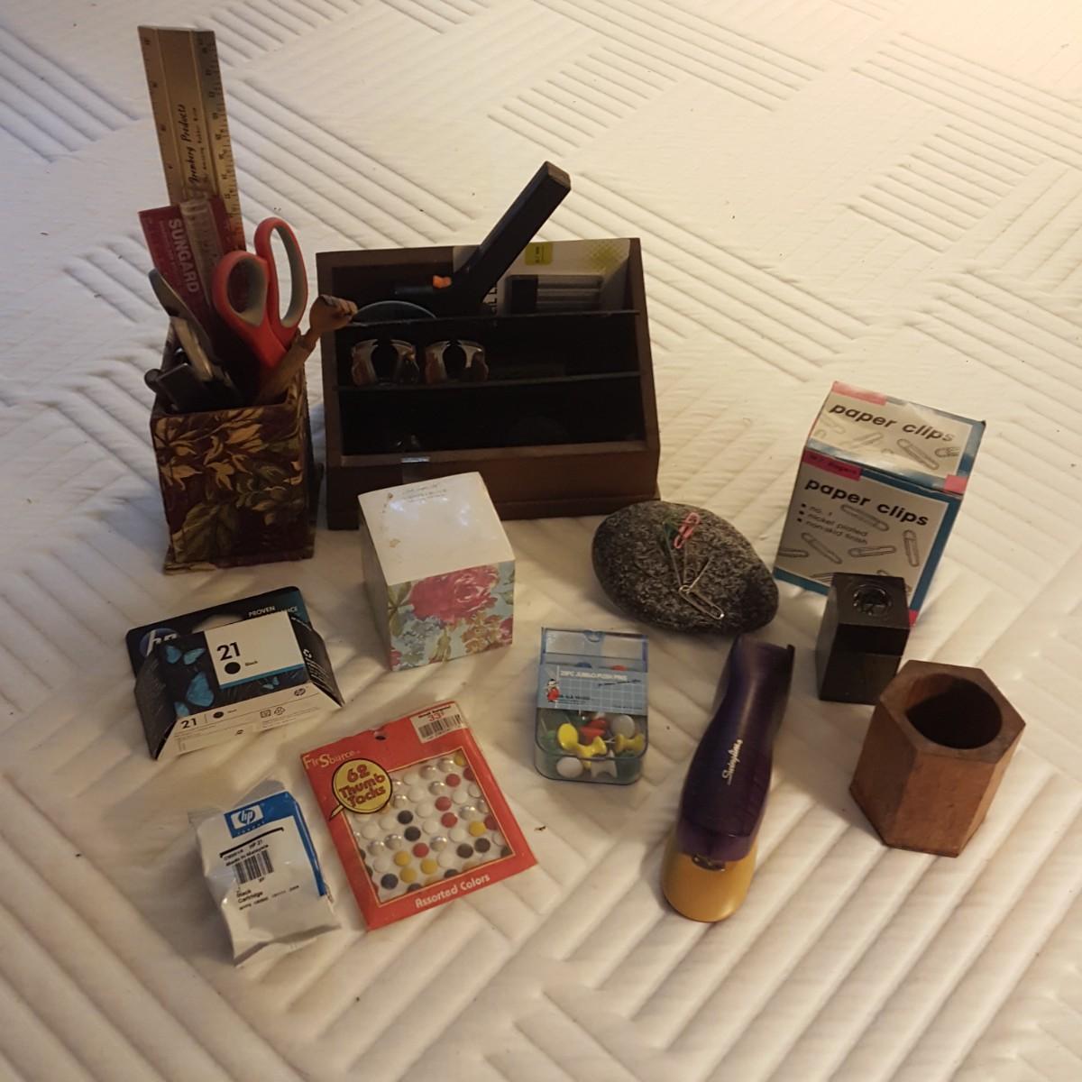 This large office lot contains everything you would need on your desk and more! This has all the essentials such as, paper, paper clips, organizational racks, staplers, scissors, dictionaries and so much more. See pictures for details. There is an Apple keyboard and Apple Mouse. There is also a box filled with ribbons, gift bags, stickers and 4 rolls of gift paper. Local pick up only.