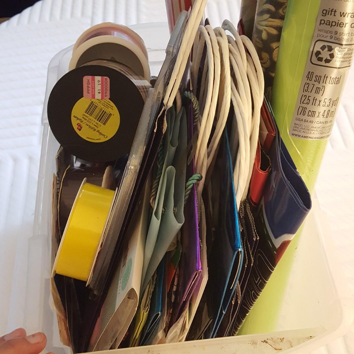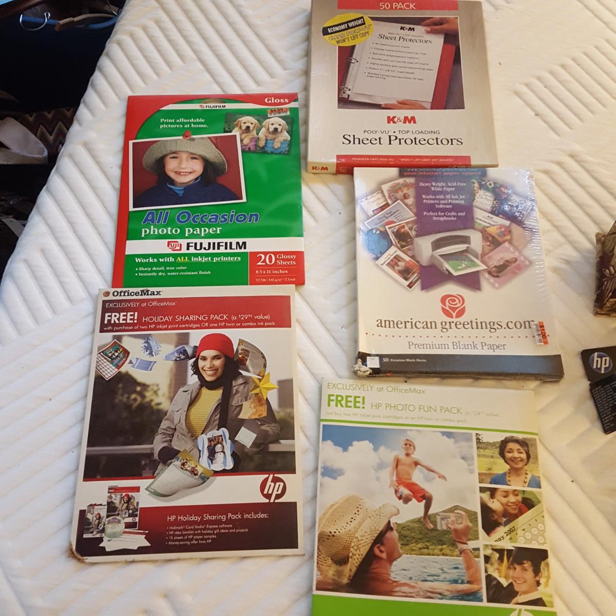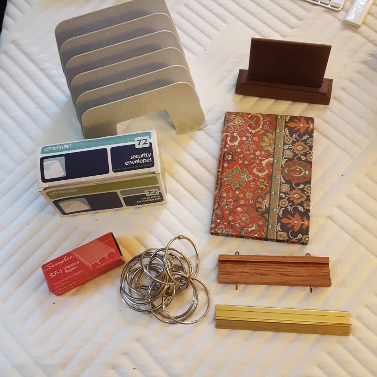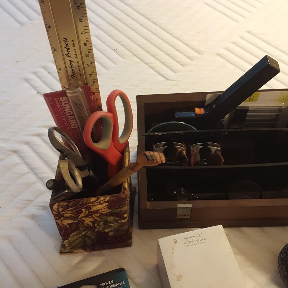 This large office lot contains everything you would need on your desk and more! This has all the essentials such as, paper, paper clips, organizational racks, staplers, scissors, dictionaries and so much more. See pictures for details. There is an Apple keyboard and Apple Mouse. There is also a box filled with ribbons, gift bags, stickers and 4 rolls of gift paper. Local pick up only.
