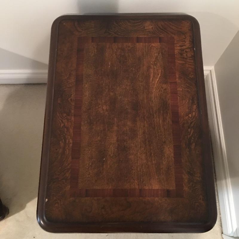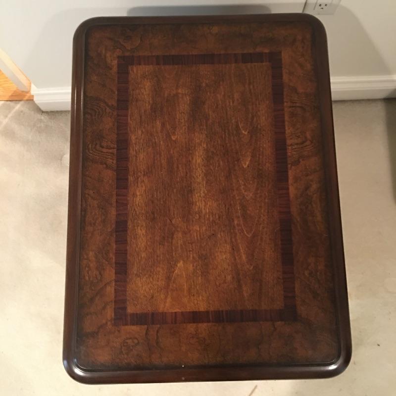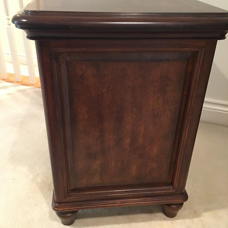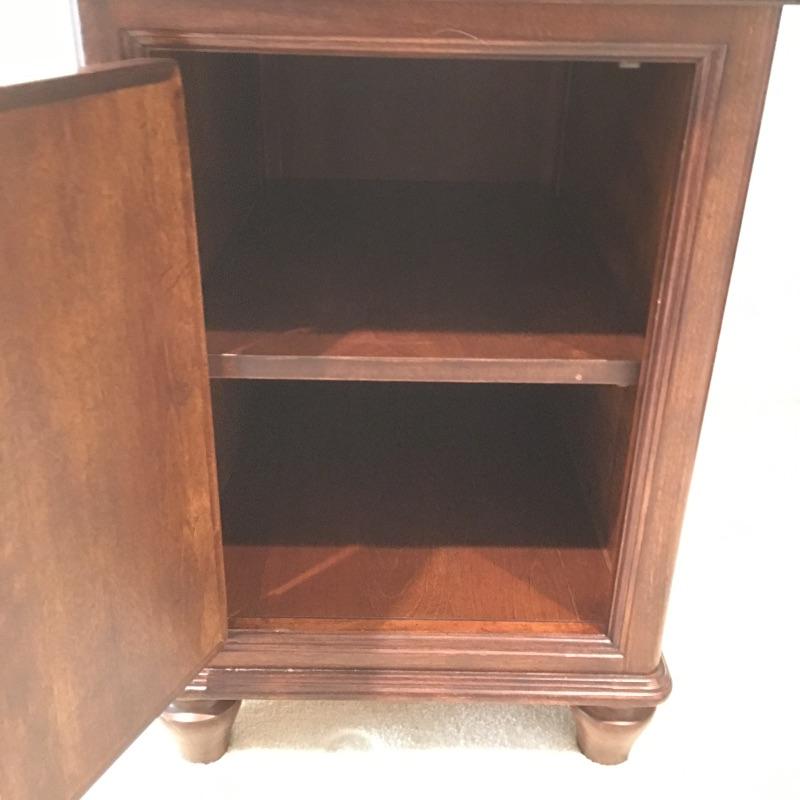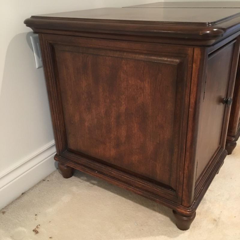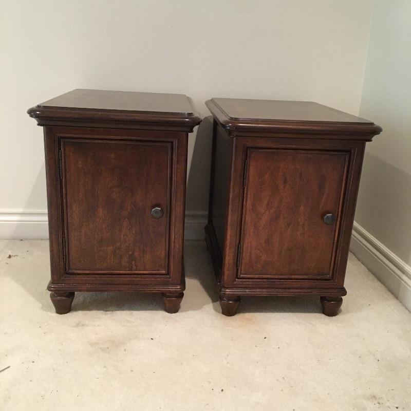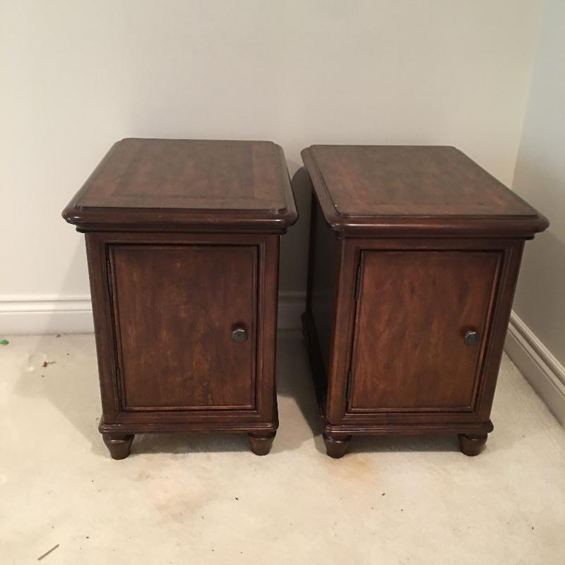 Pair of end tables with two shelves and a door. A handsome pair of end tables for your living room or your bedroom. Tables have a few nicks, see pictures. Table measures 28” x 52” x 18”. Matches lot 145.