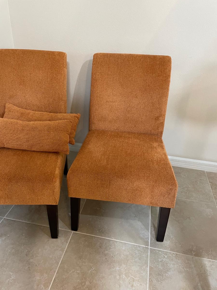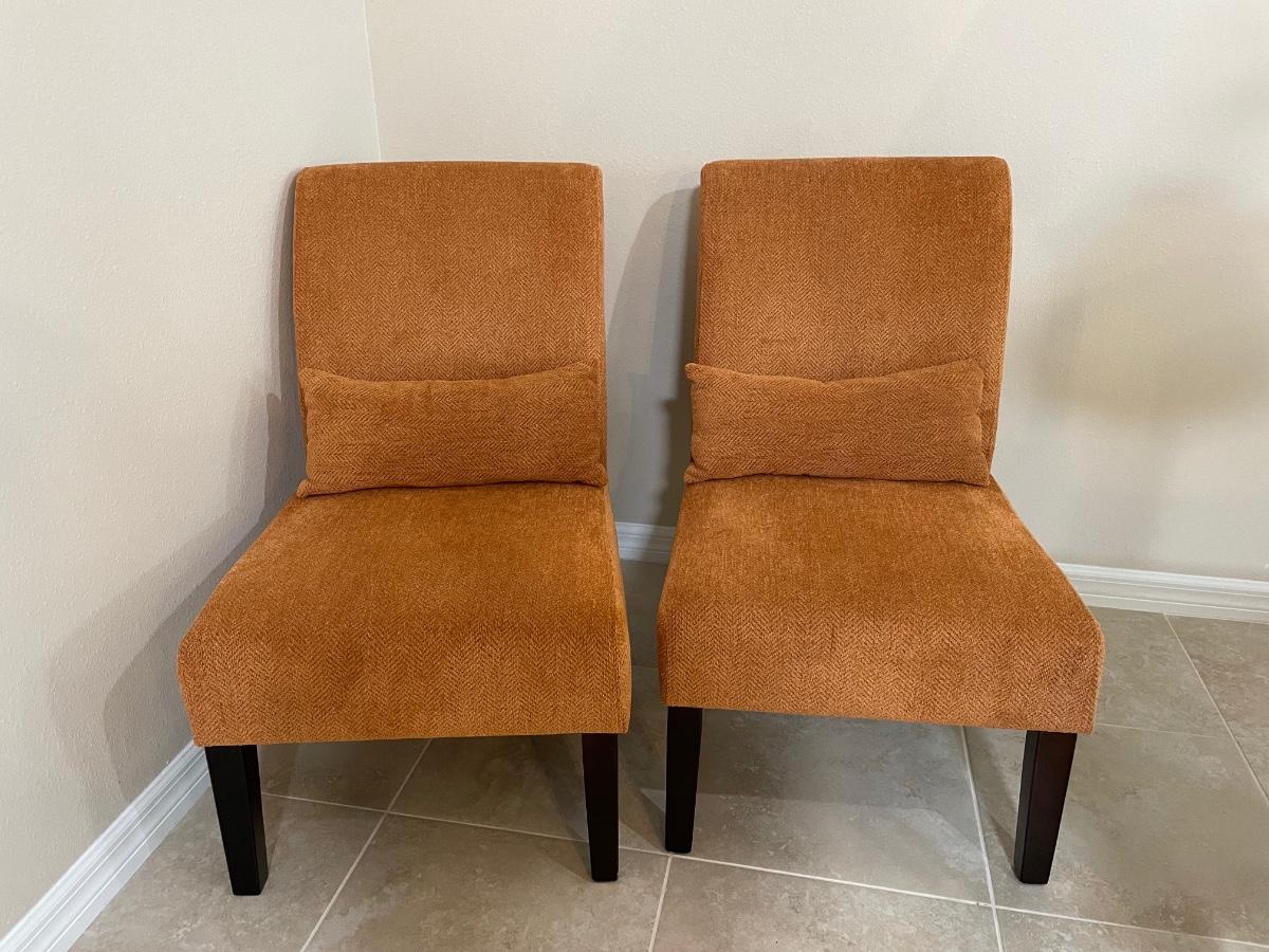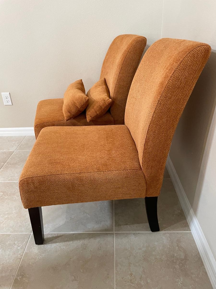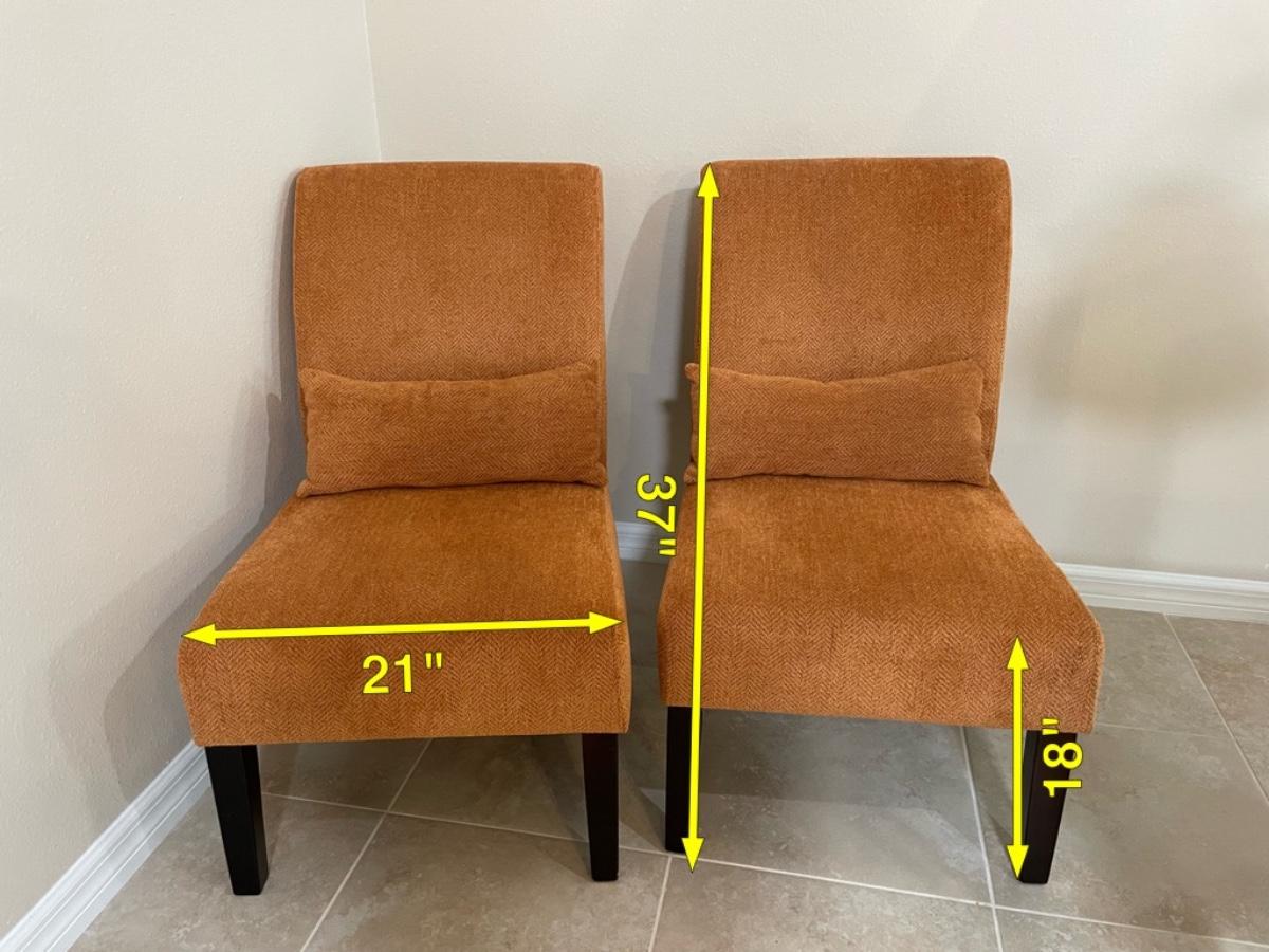 Two armless chairs upholstered in orange chenille fabric. Measurements are in the photos. very nice condition