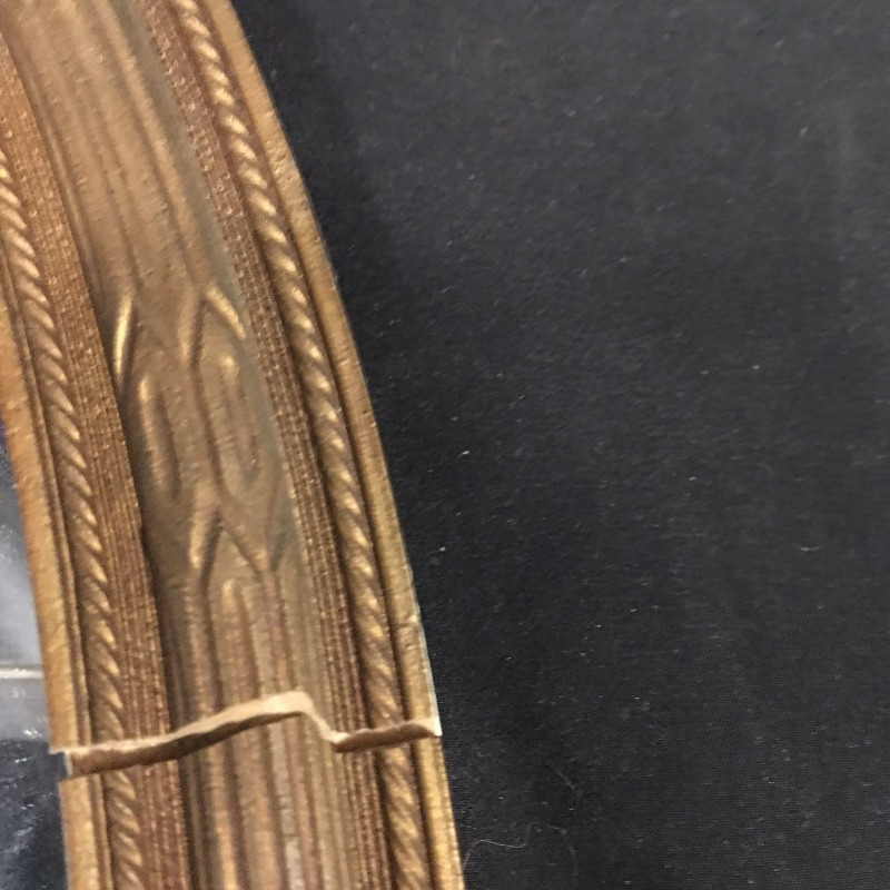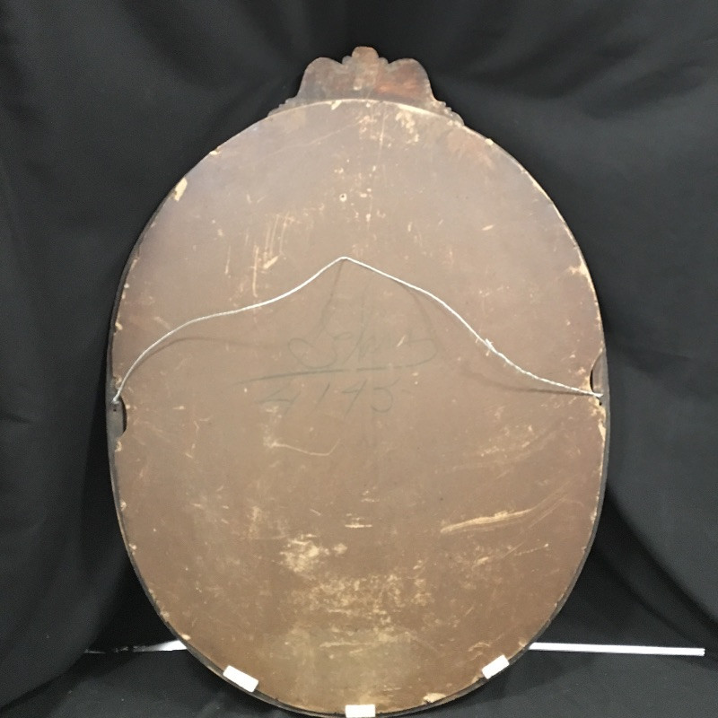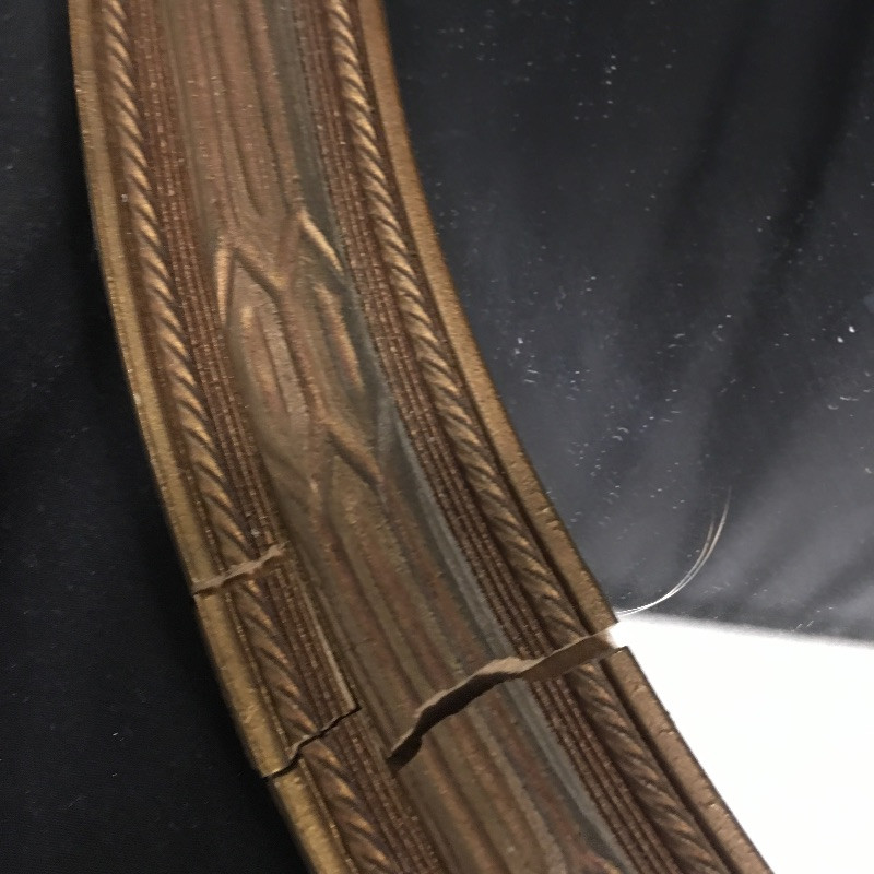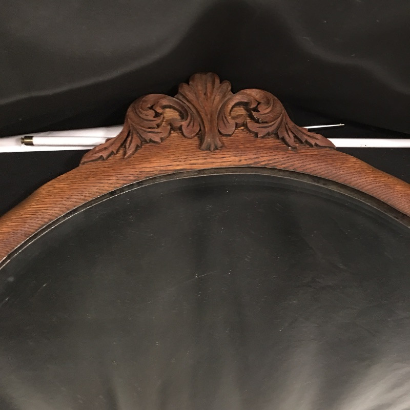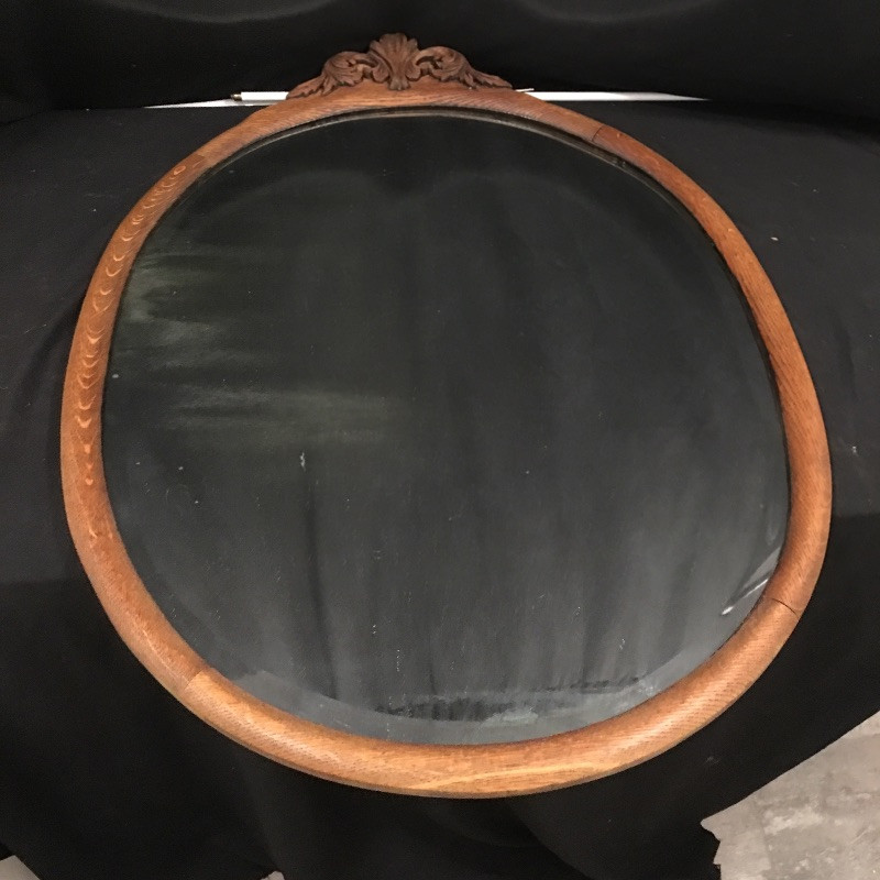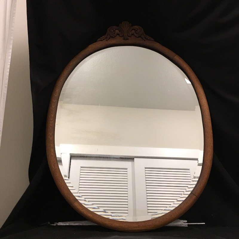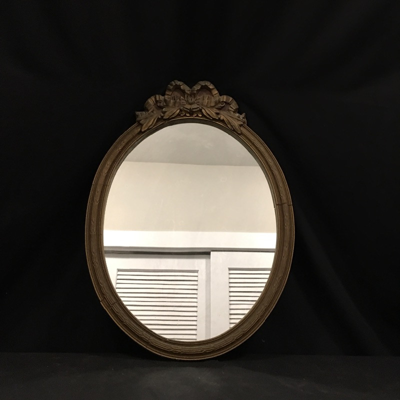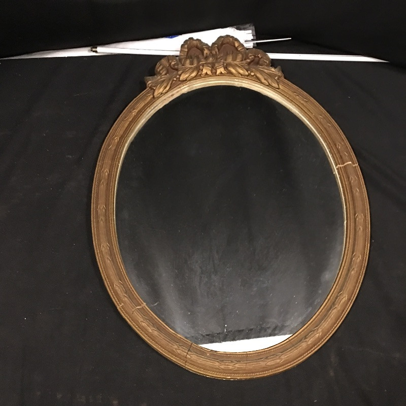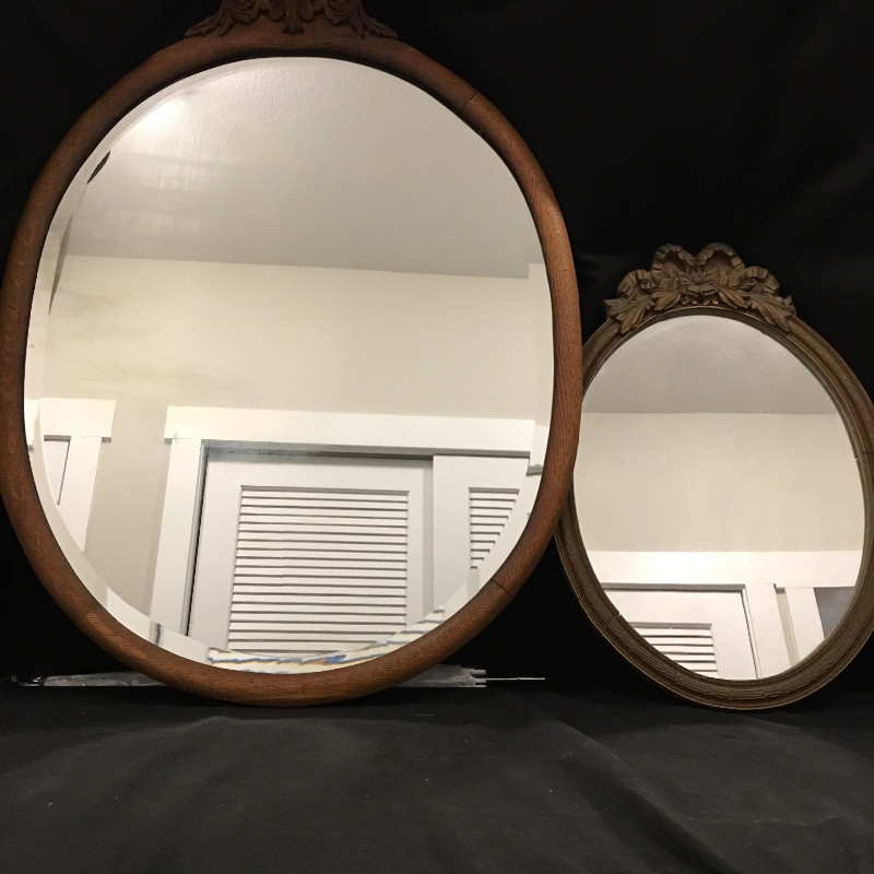 Mirror, mirror on the wall, who is the fairest of them all? Find out with this pair of vintage oval mirrors. Largest mirror is beveled with intricate design on top and smaller mirror has intricate design but also has some cracking on frame,see pictures. Largest mirror measures 26” x 34.5”.