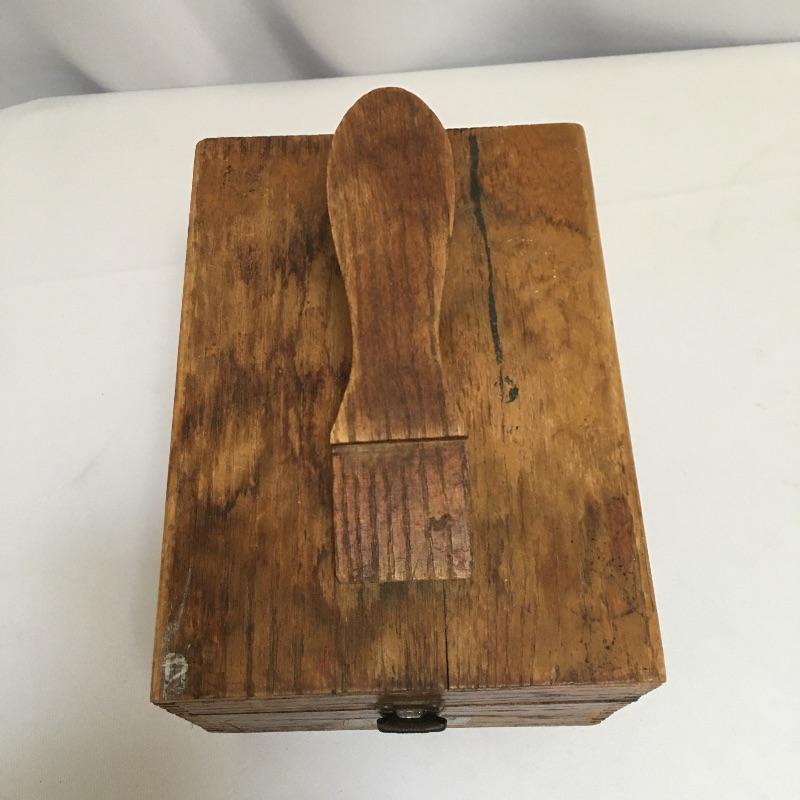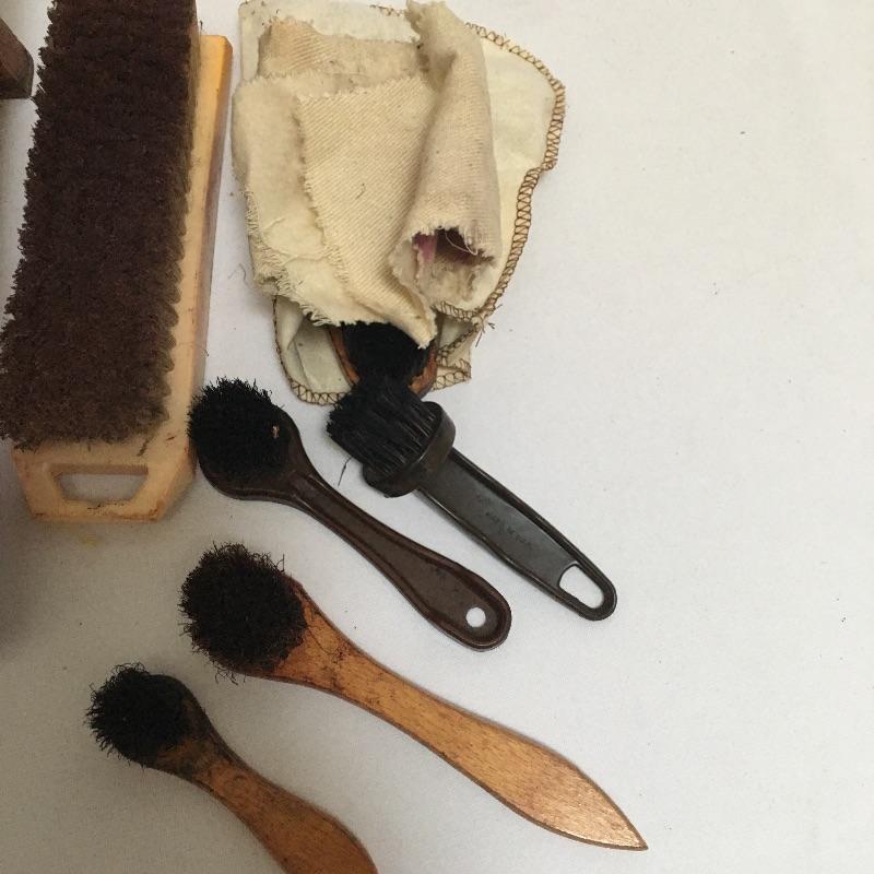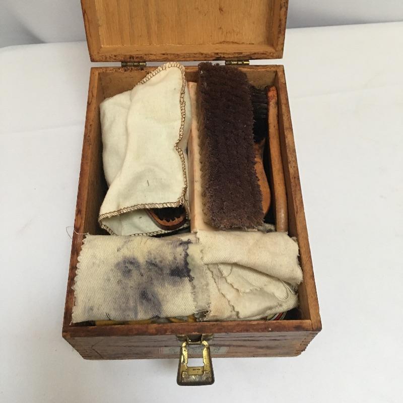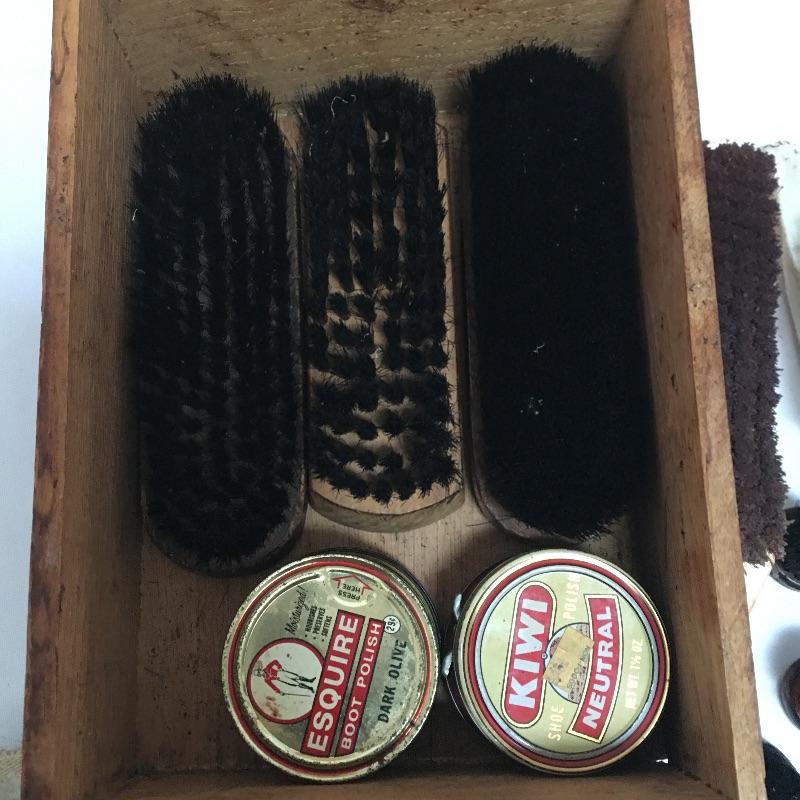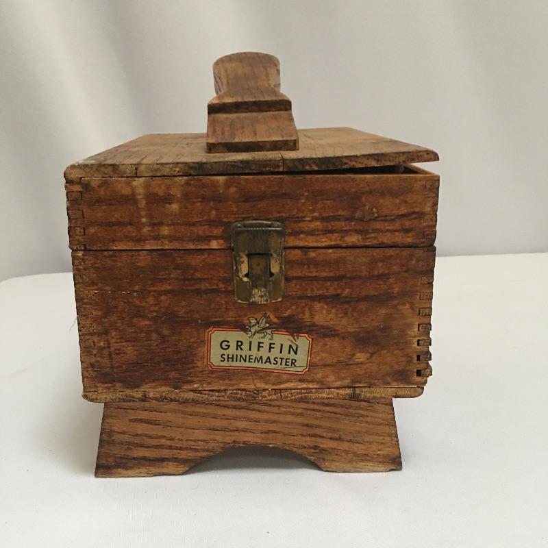 Griffin Shinemaster shoe shine kit includes shoe polish, applicators, brushes and buffing cloths all in a wooden shoe shine box. The wood is coming apart on top, but its nothing a nail and a little glue can fix. Box measures 8” x 10.75” x 10.5”.