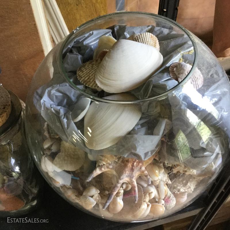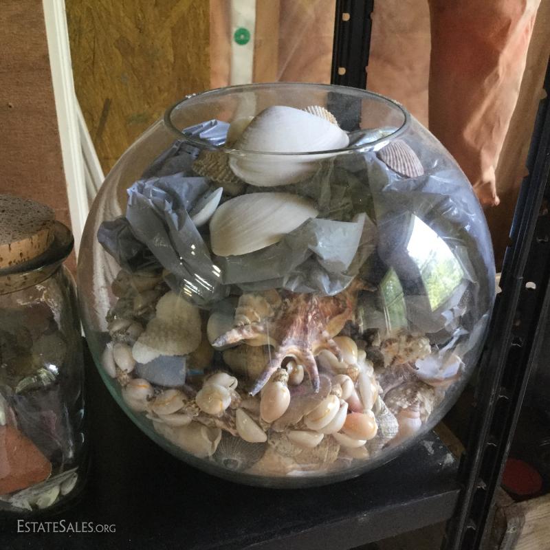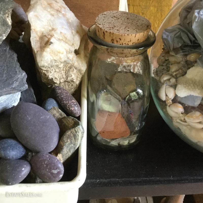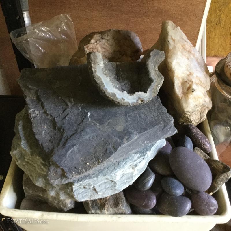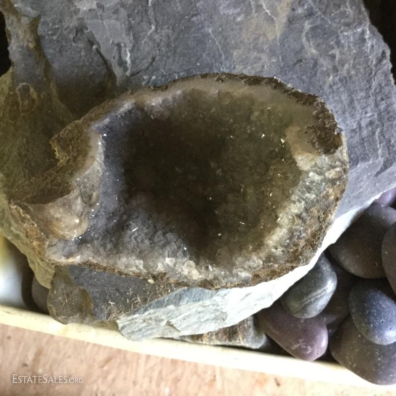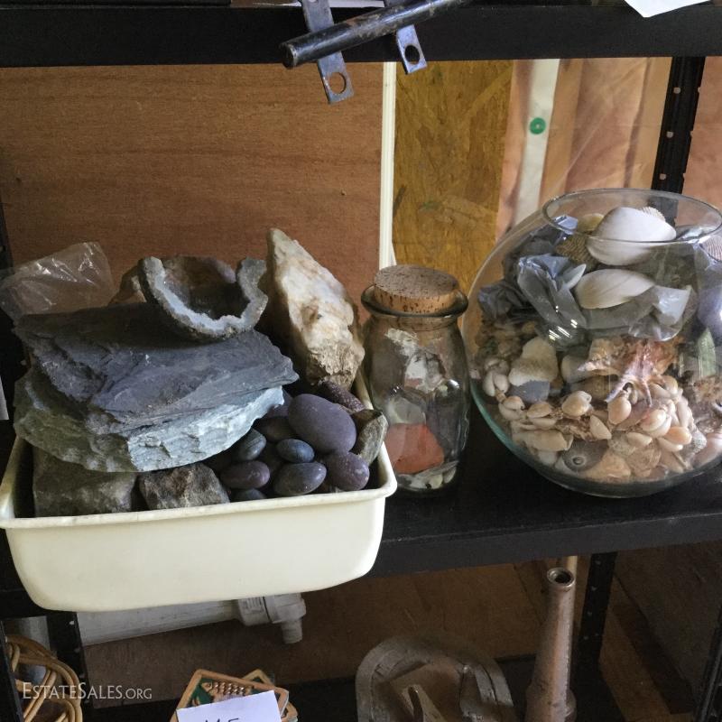 Large lot of rocks, geodes, shells and glass containers. Rocks appear to be a start to a fountain project. Round glass bowl is 9" tall. This lot is available for local pick up in Hendersonville, NC only.