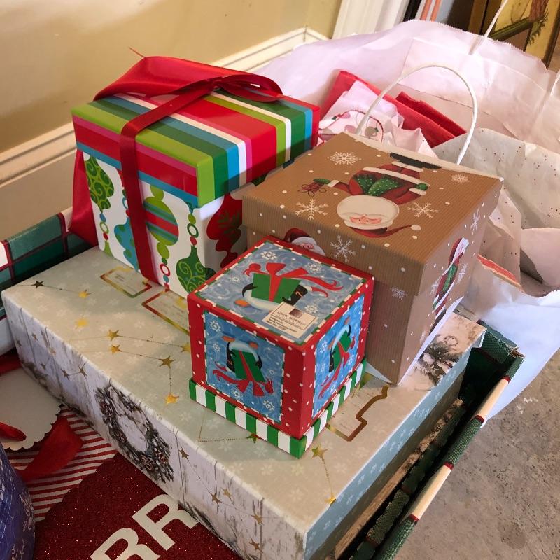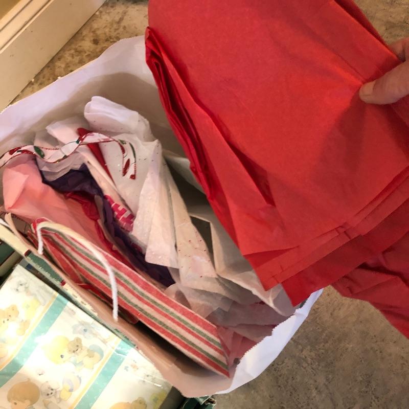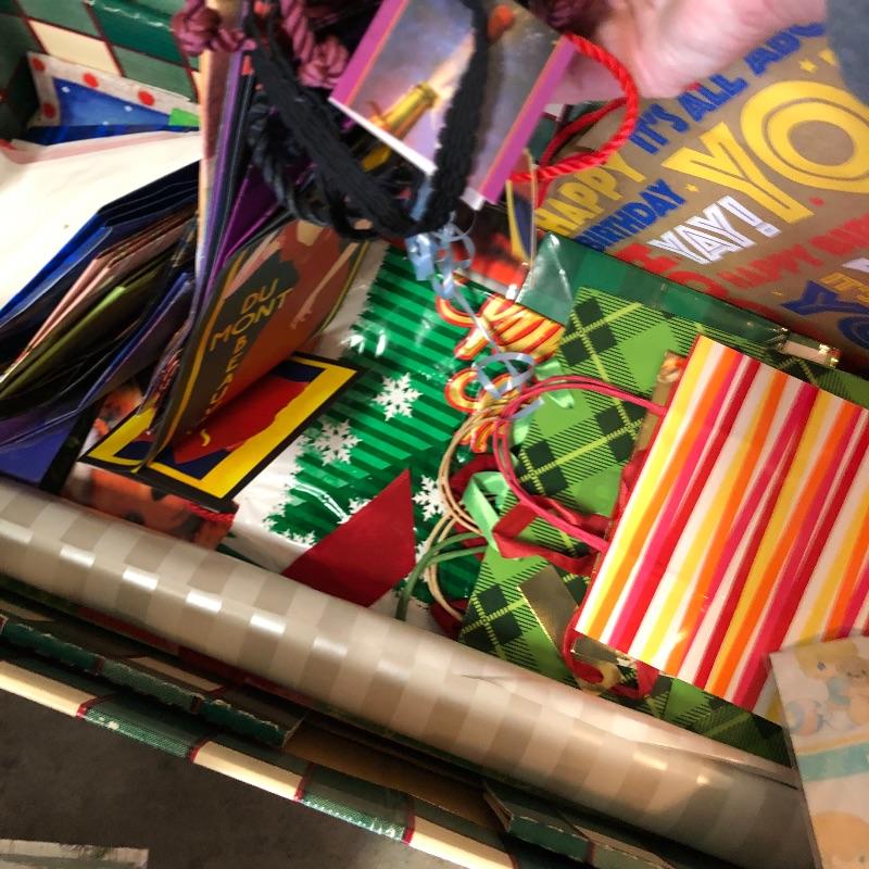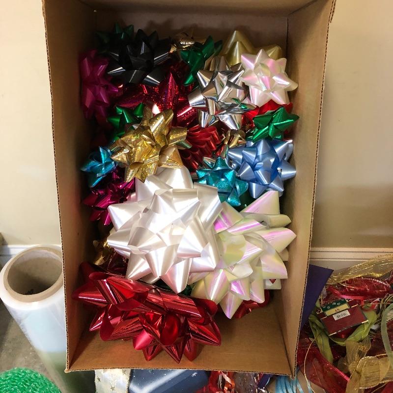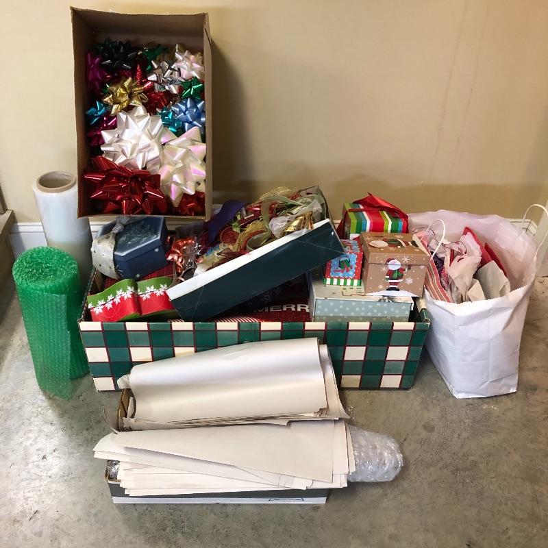 Bows, tissue paper, gift bags and boxes, ribbon, bubble wrap and more make up this good sized lot.