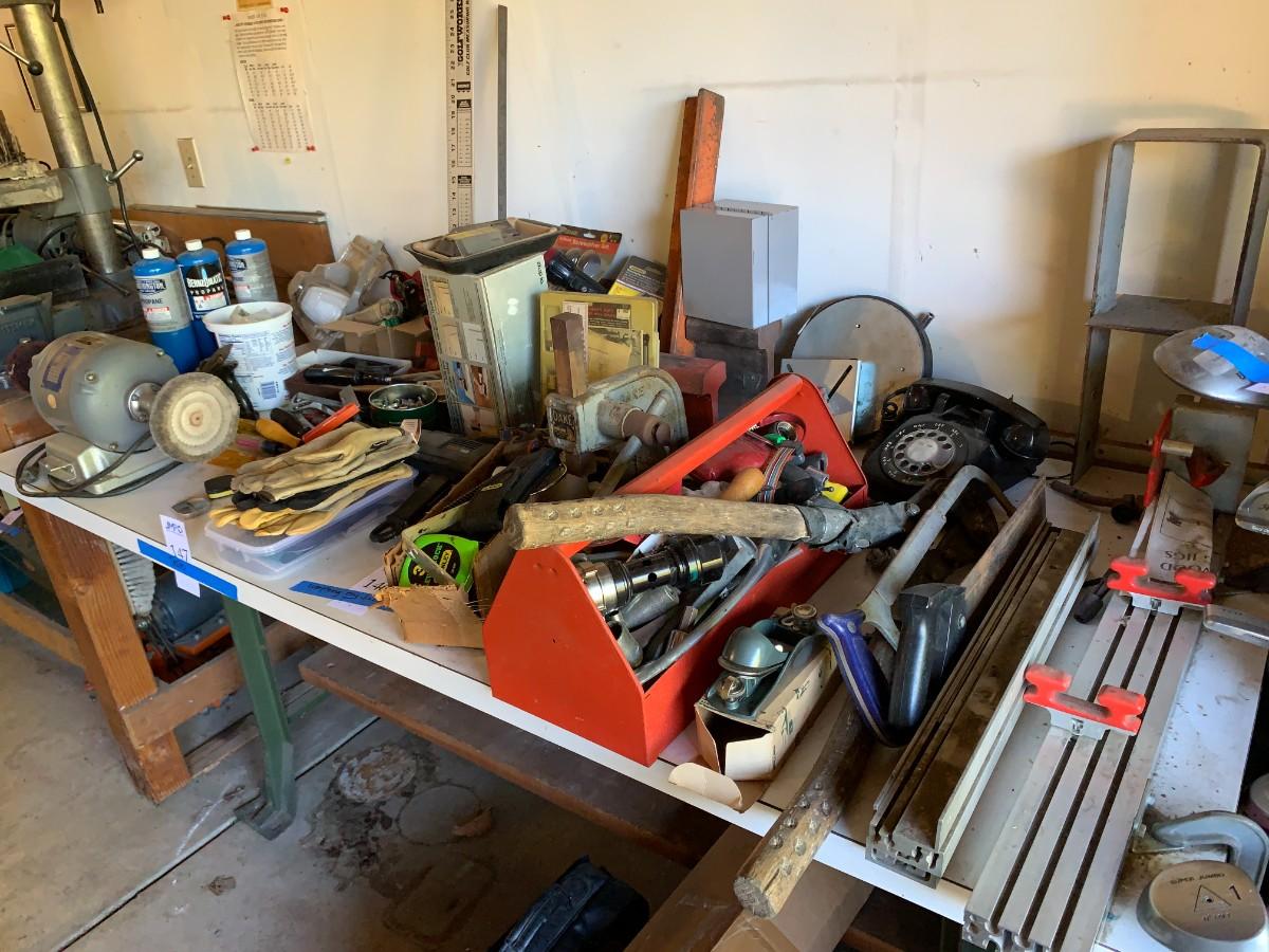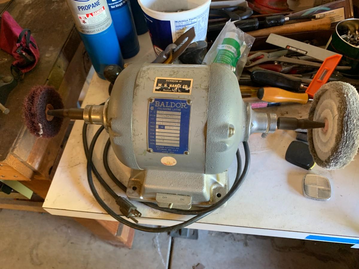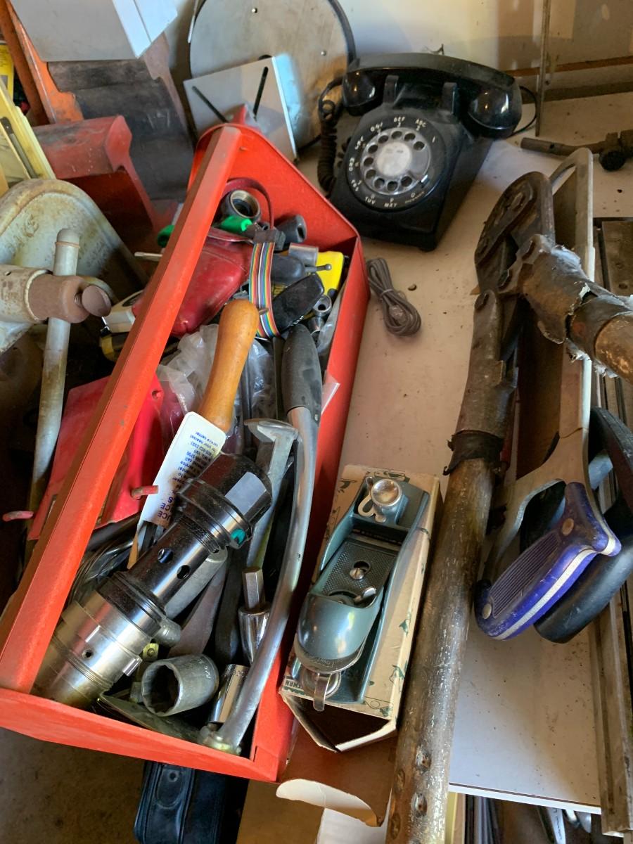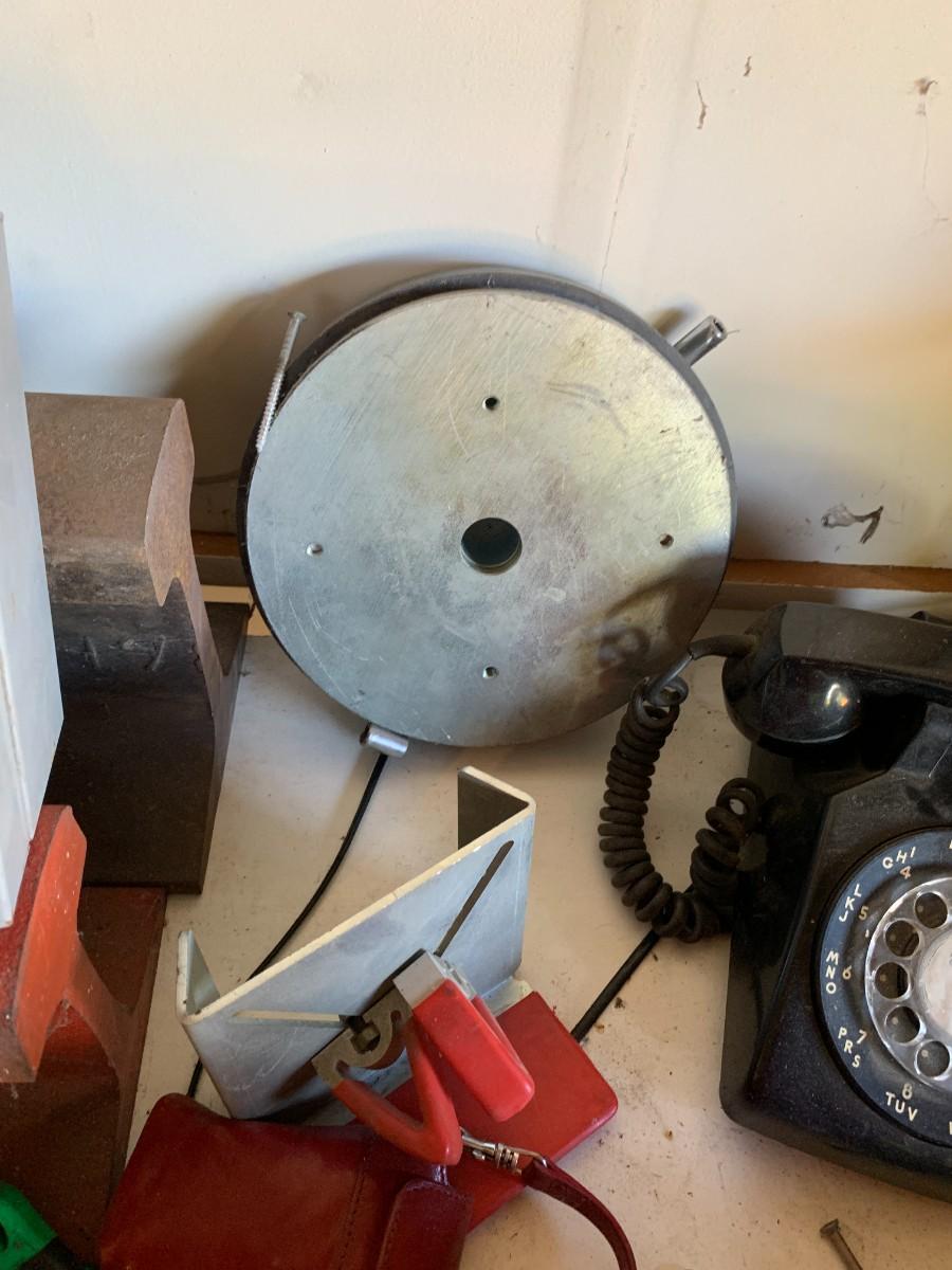Includes everything loose on table: wood cutting jig and guides; large round magnet; vintage telephone. Manual tools. Pad sander. Polishing lathe. 3 canisters of benzene. Tools not tested, not checked for parts or safety.