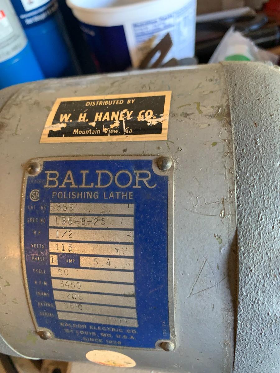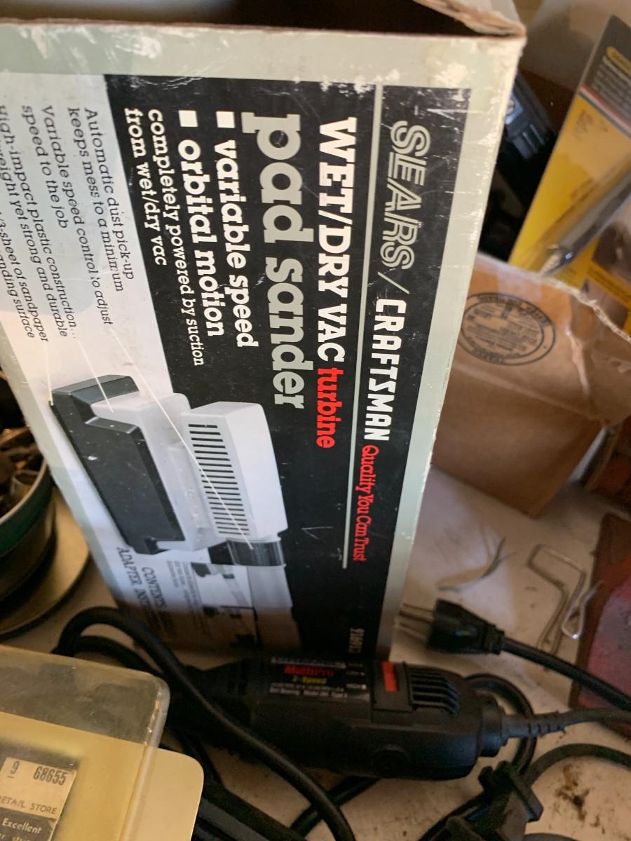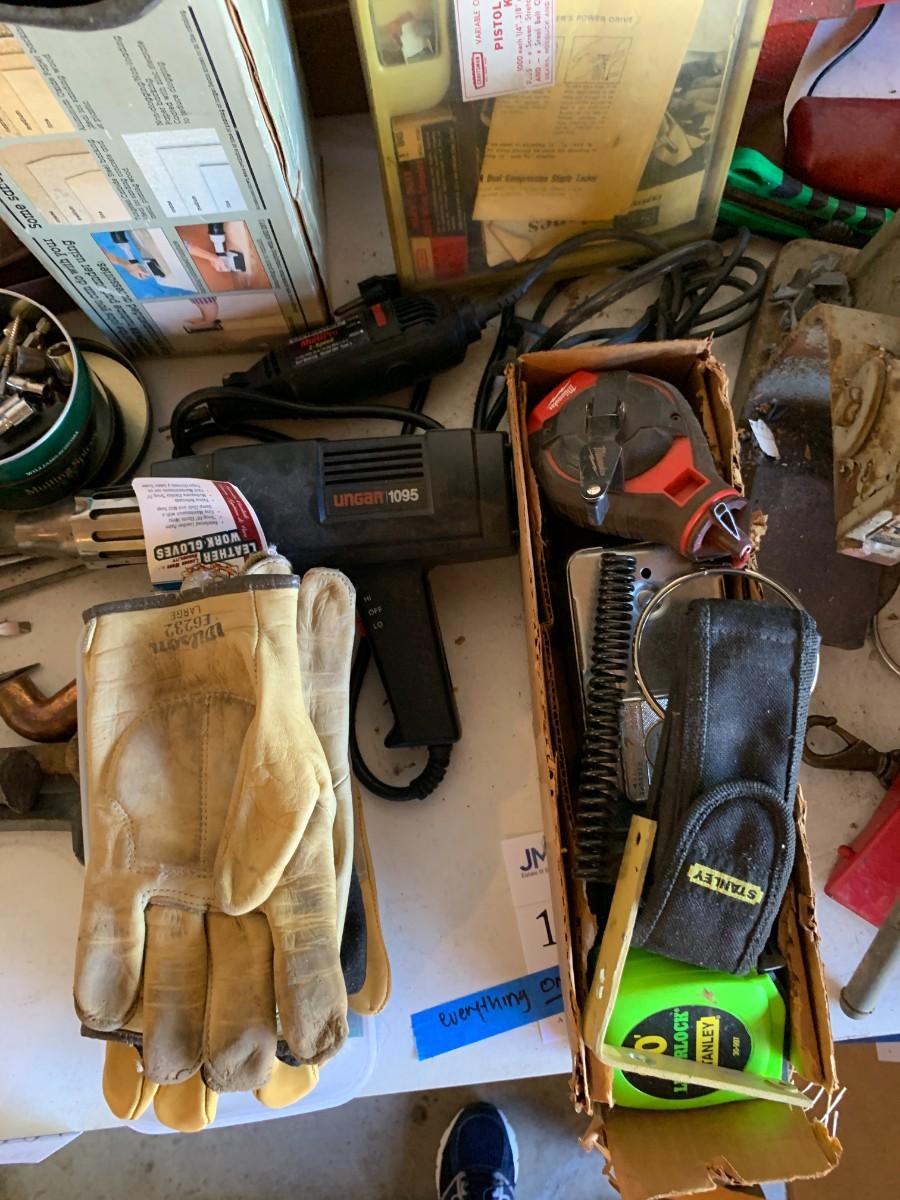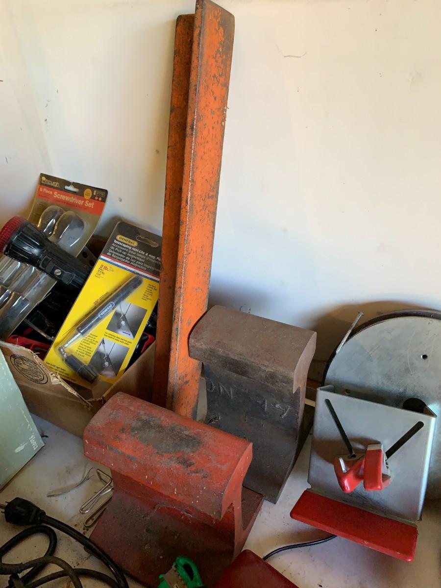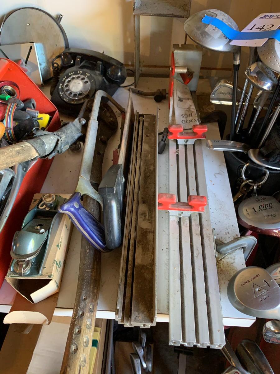 Includes everything loose on table: wood cutting jig and guides; large round magnet; vintage telephone. Manual tools. Pad sander. Polishing lathe. 3 canisters of benzene. Tools not tested, not checked for parts or safety.