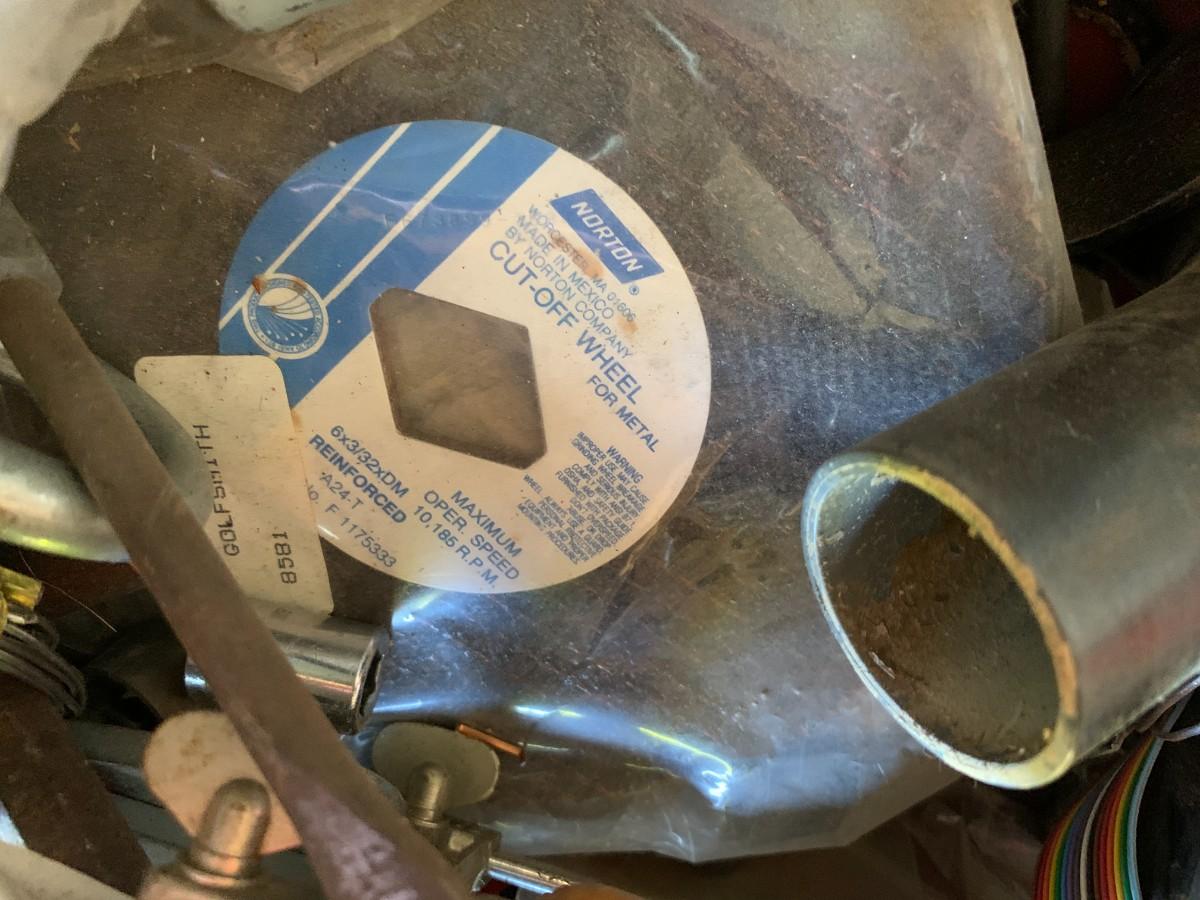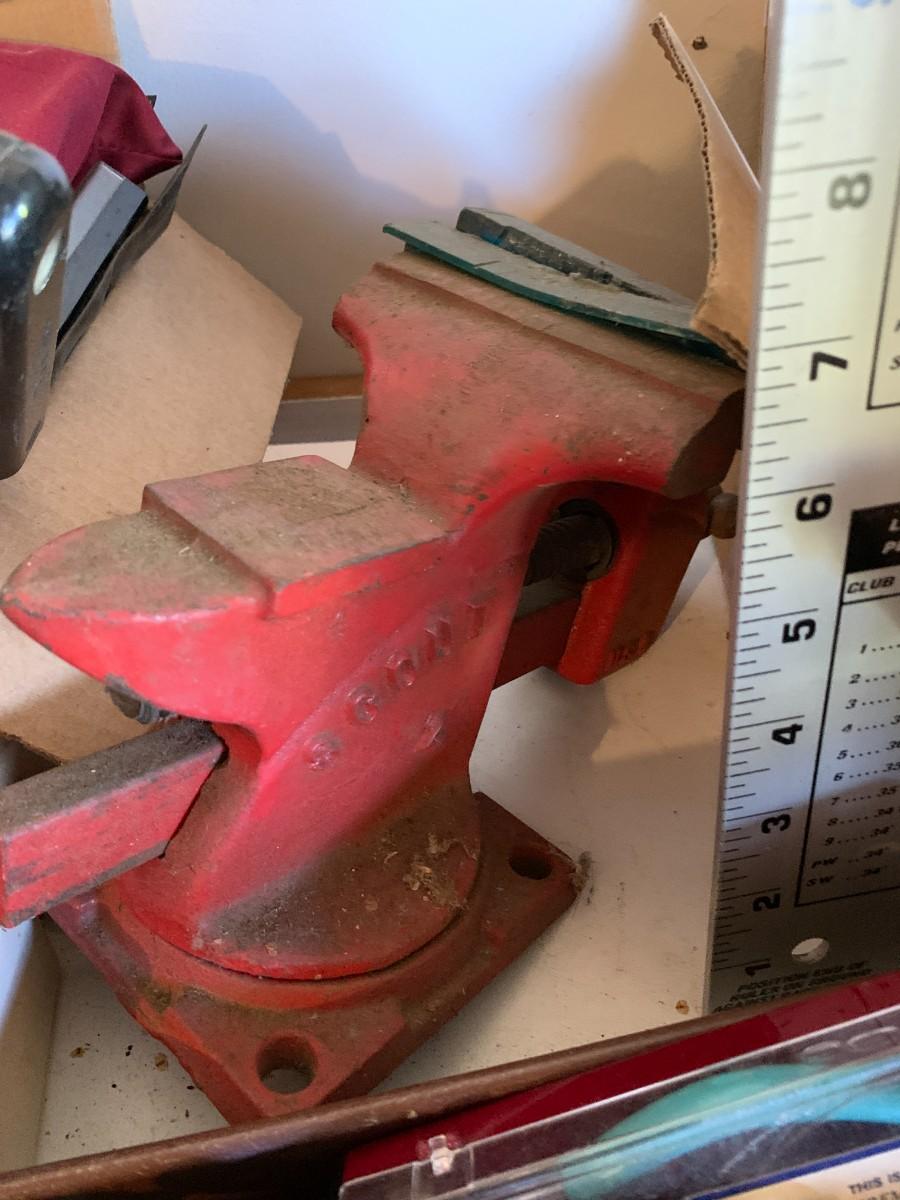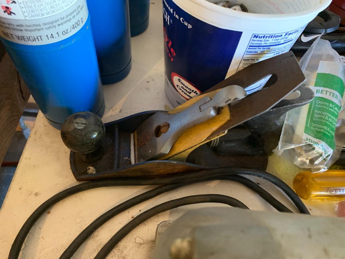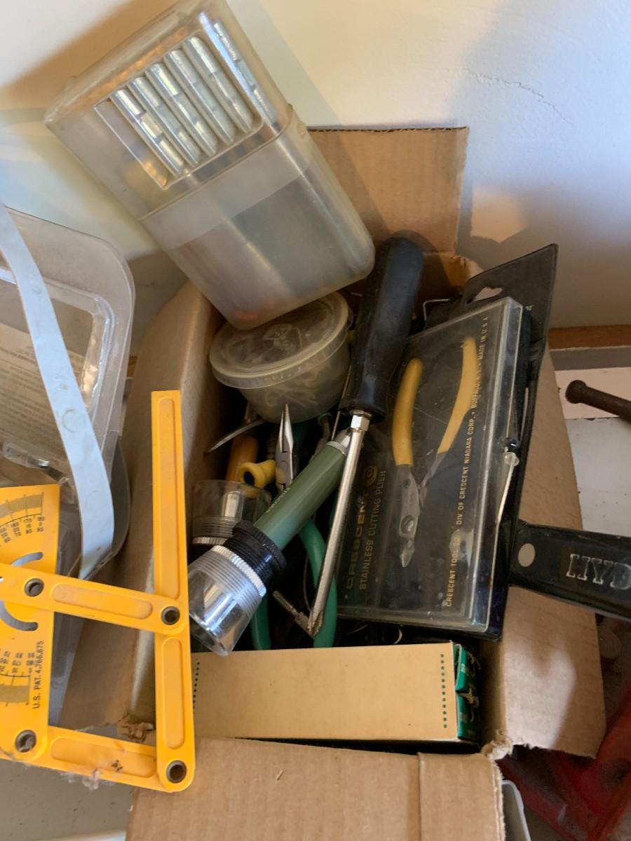 Includes everything loose on table: wood cutting jig and guides; large round magnet; vintage telephone. Manual tools. Pad sander. Polishing lathe. 3 canisters of benzene. Tools not tested, not checked for parts or safety.