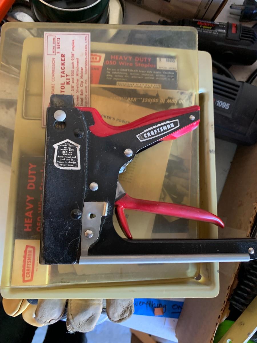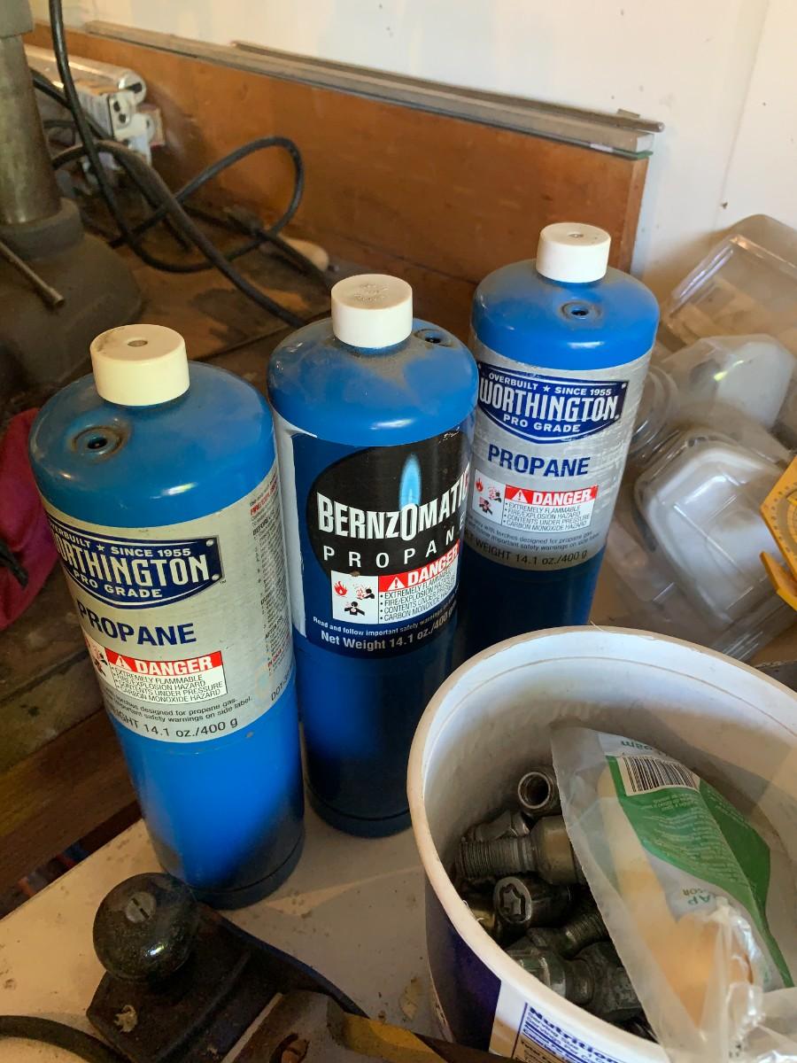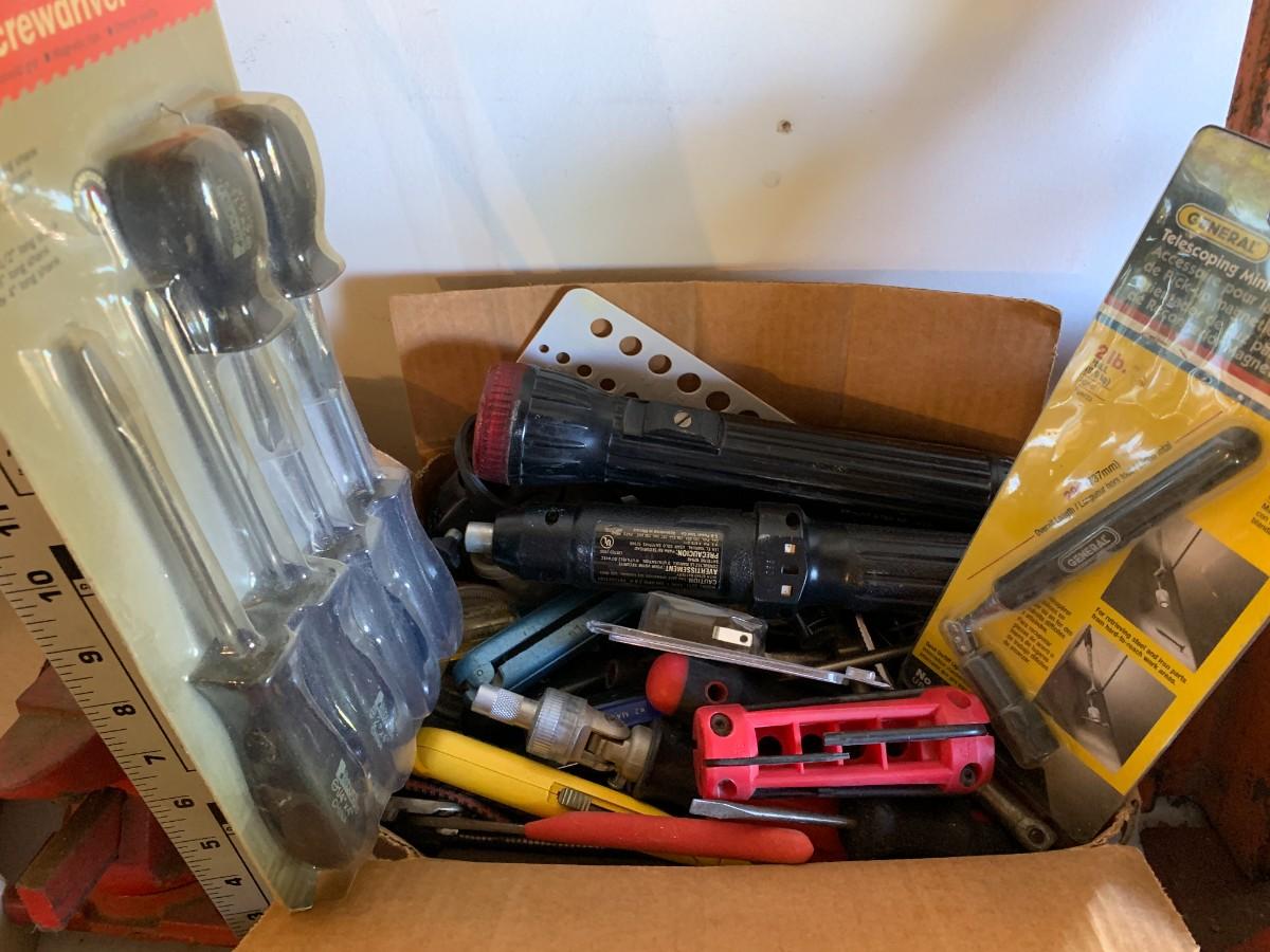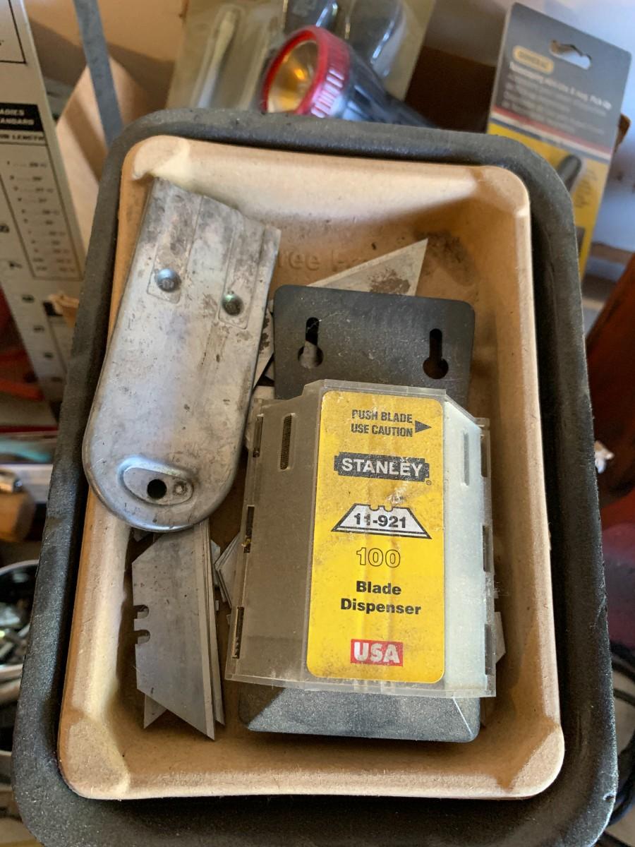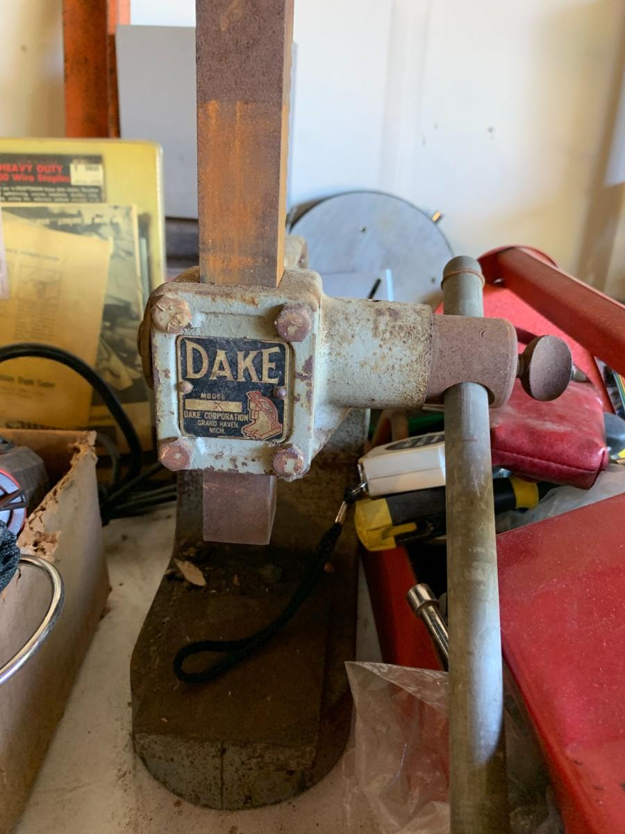 Includes everything loose on table: wood cutting jig and guides; large round magnet; vintage telephone. Manual tools. Pad sander. Polishing lathe. 3 canisters of benzene. Tools not tested, not checked for parts or safety.