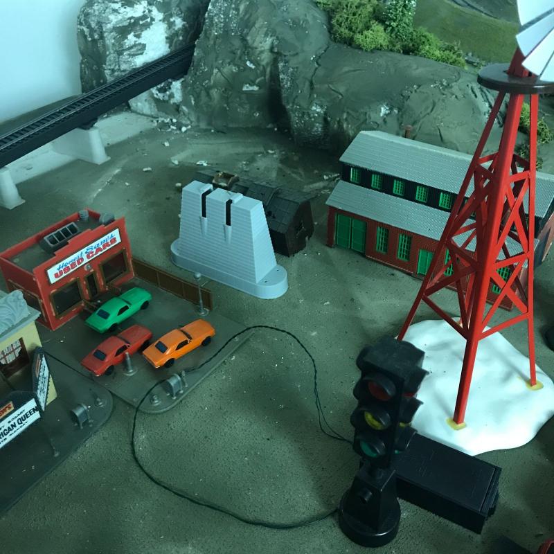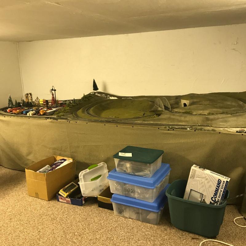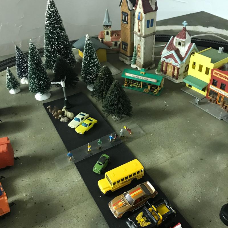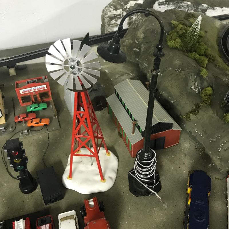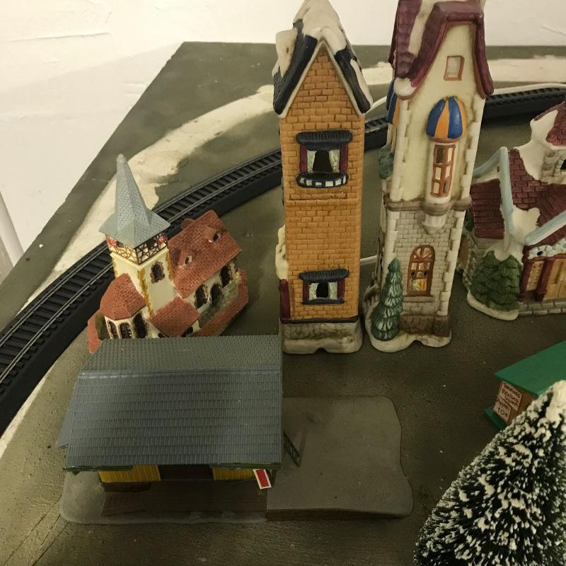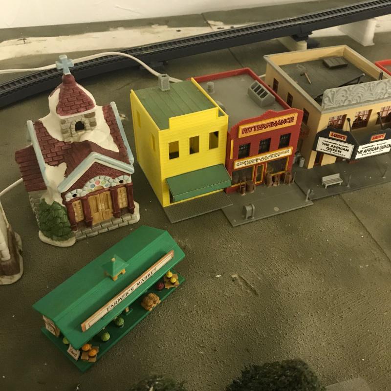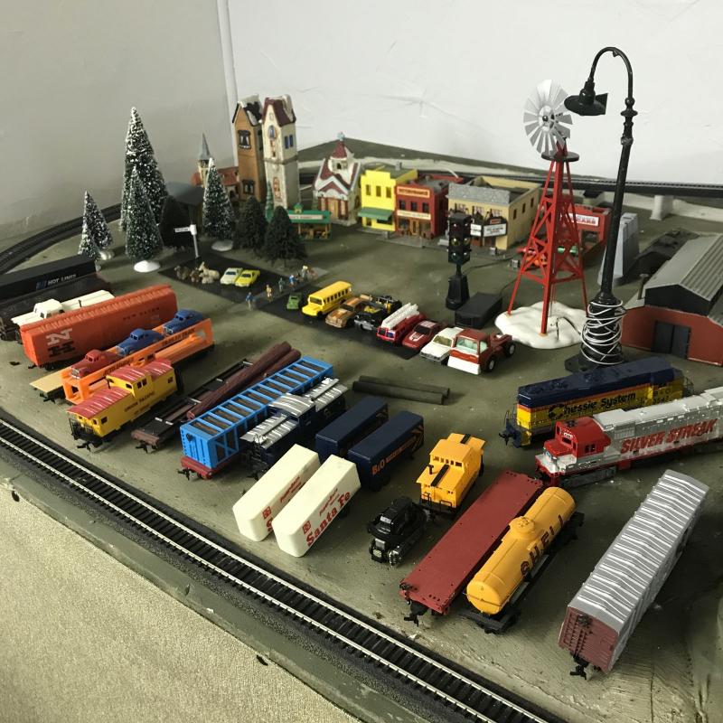 Lot includes large, homemade electronic train table with dozens of train parts, buildings, trees, extra train tracks and everything you need to set up a miniature town. See pics. You may take parts and leave table if you choose. It is made on several large pieces of plywood and set on top of two plastic folding tables. No shipping.