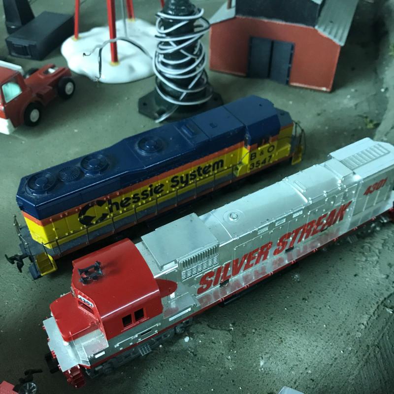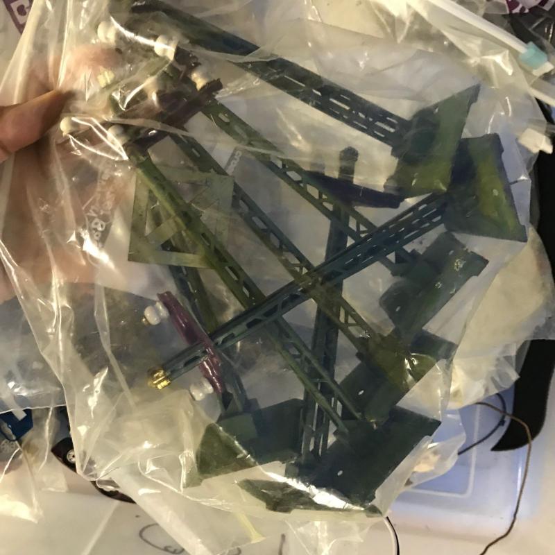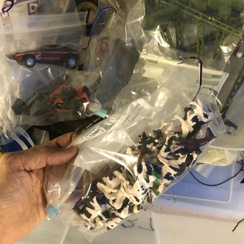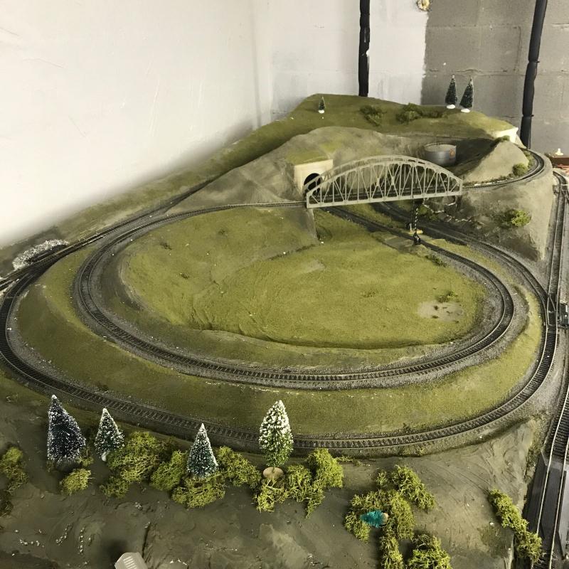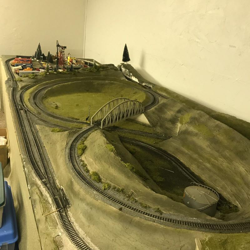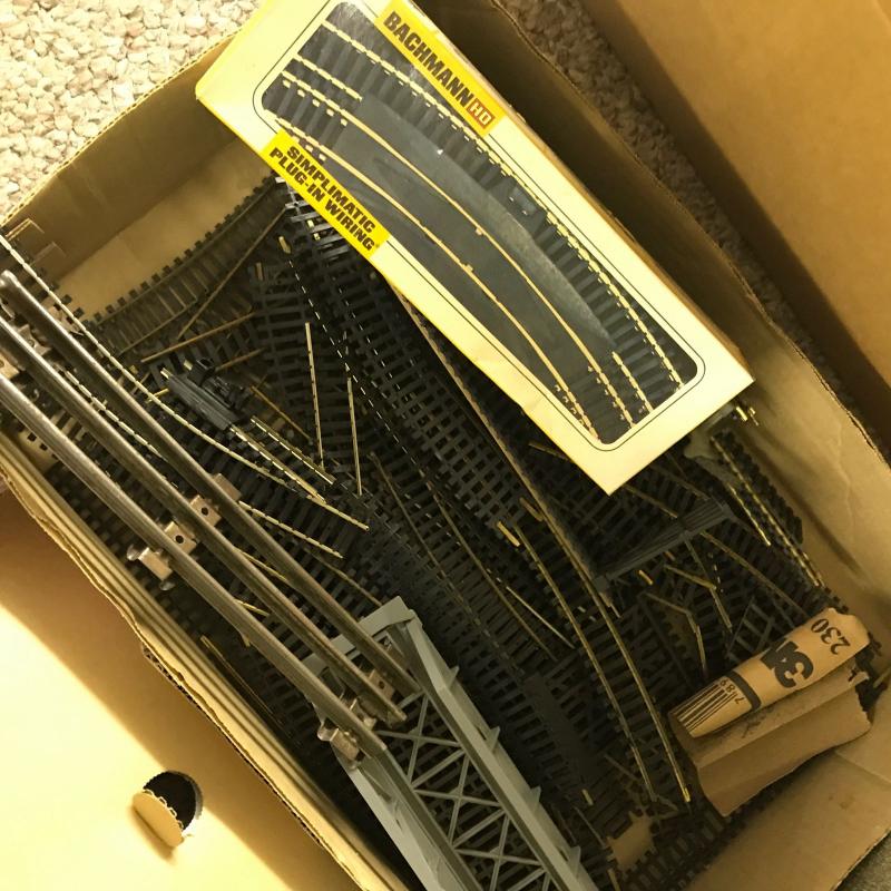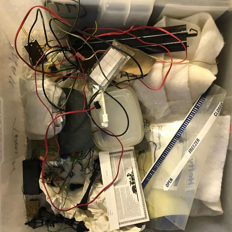 Lot includes large, homemade electronic train table with dozens of train parts, buildings, trees, extra train tracks and everything you need to set up a miniature town. See pics. You may take parts and leave table if you choose. It is made on several large pieces of plywood and set on top of two plastic folding tables. No shipping.
