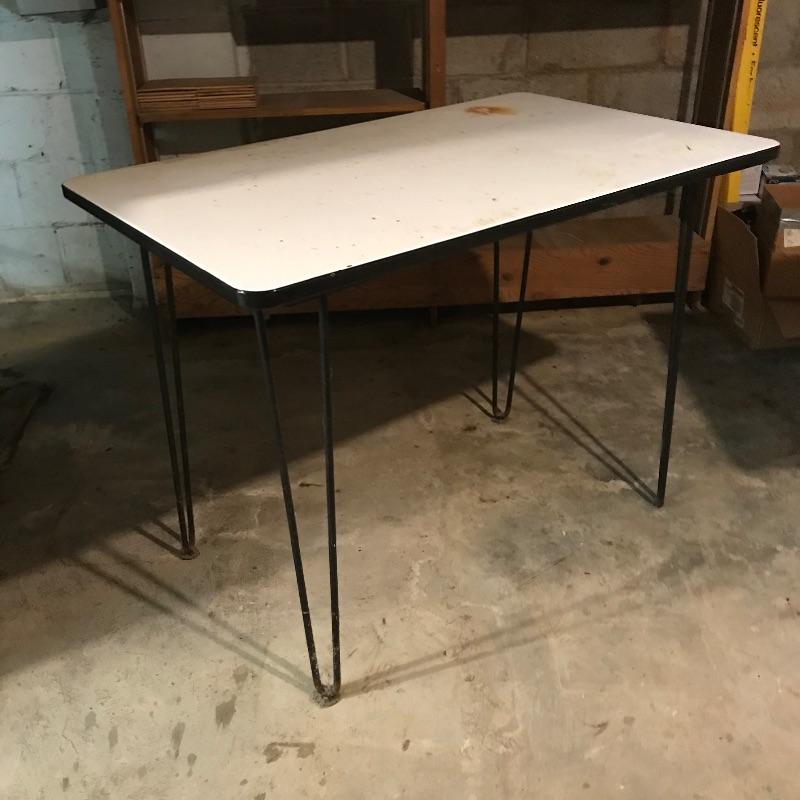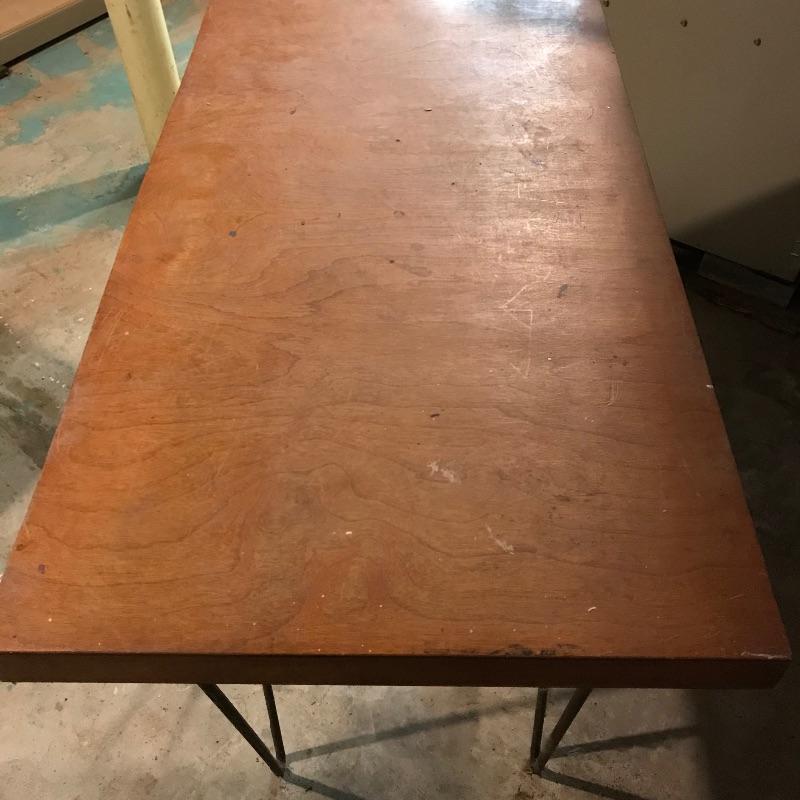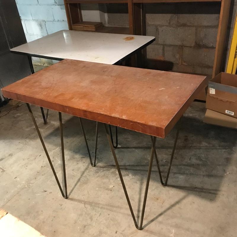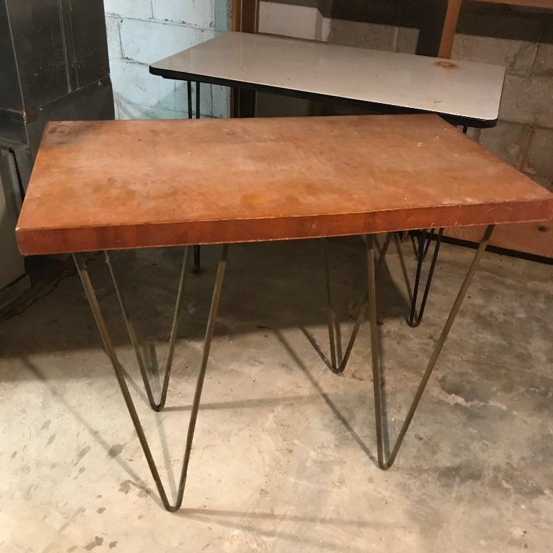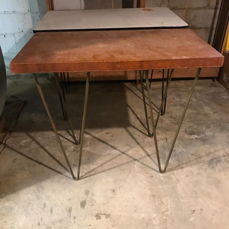 Super cool thick wood table with wide metal legs. This piece would look great with a variety of styles. Table measures 36” x 20” x 30”. It has some wear noticeable on the top, but with a little work, this piece will be the envy of your friends. We’ve paired this beauty with a white metal table with similar style legs. This table also shows wear and would be great in the basement or as a laundry folding table. Both tables have legs fixed in place, neither fold up for storage or transport. Local pick up only. Pieces will need to be moved up one flight of stairs.