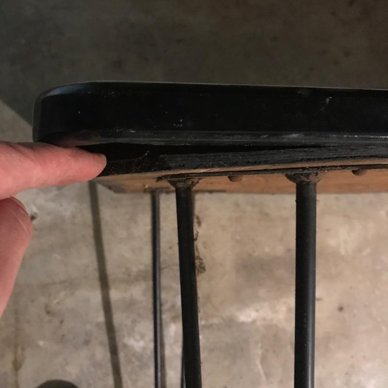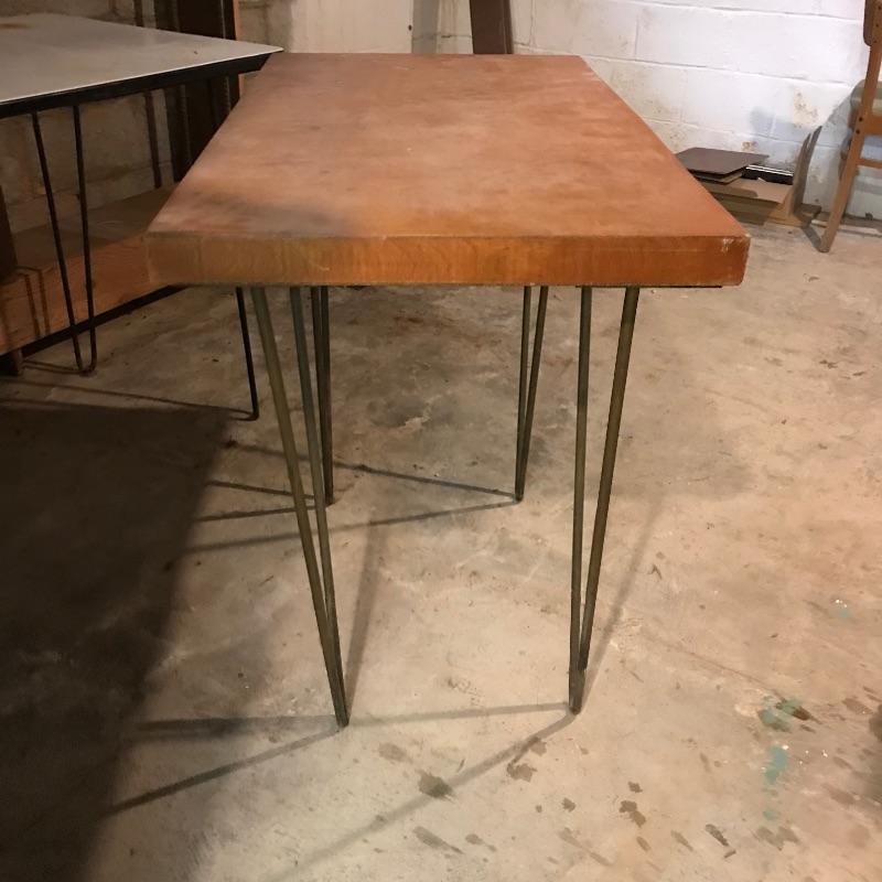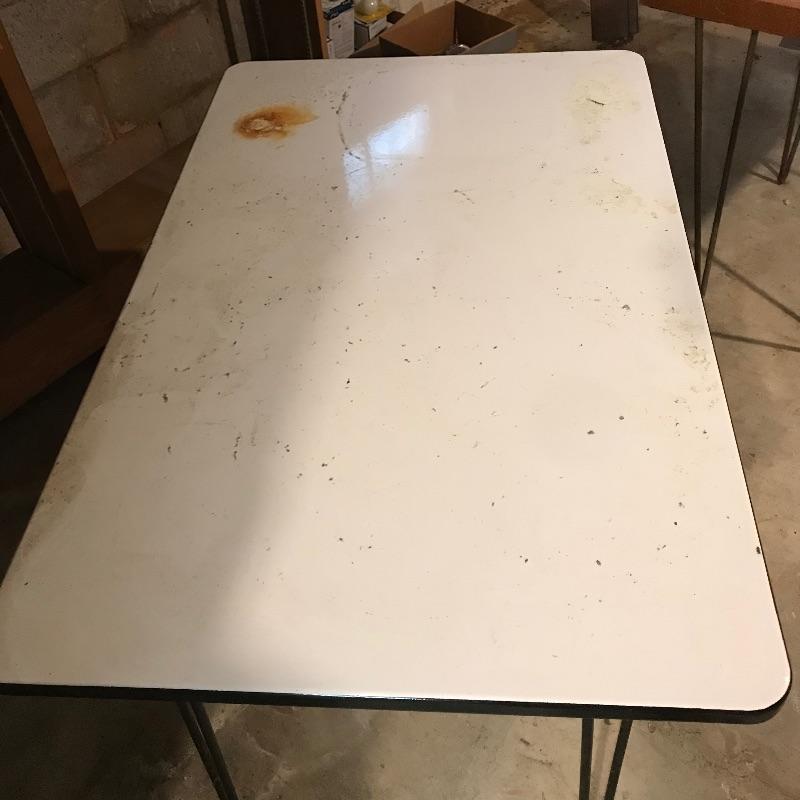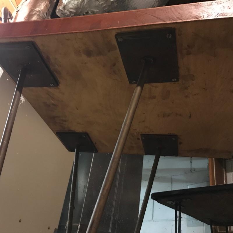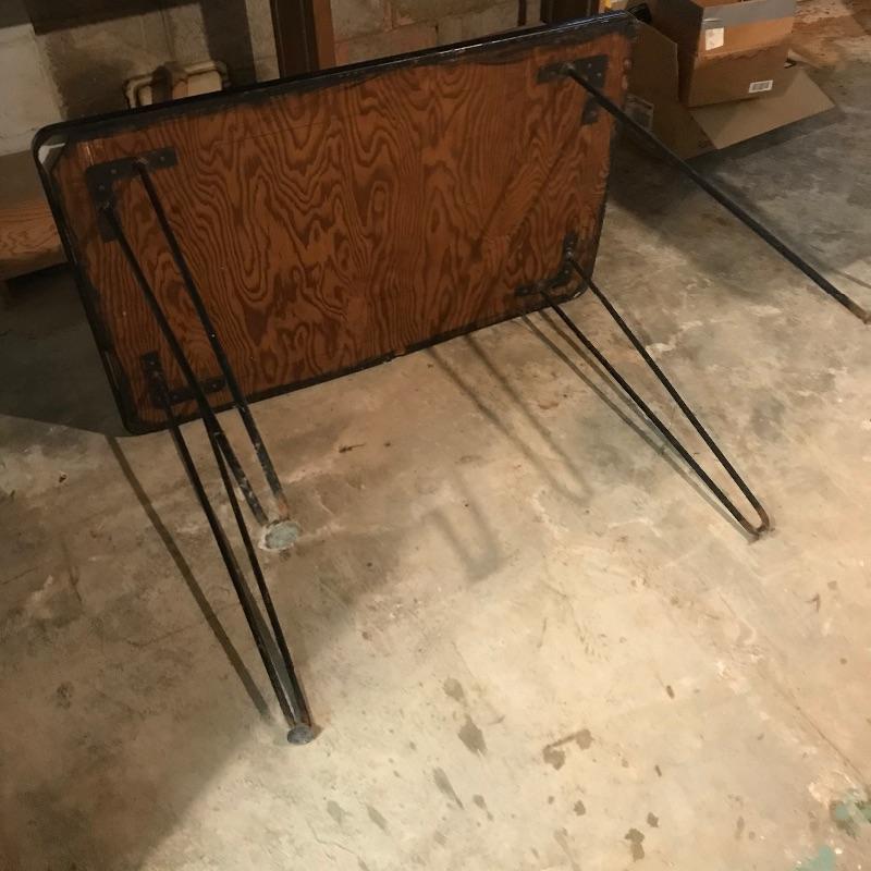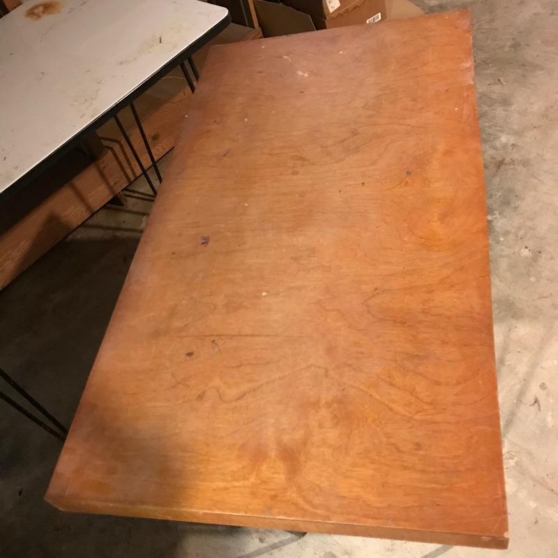 Super cool thick wood table with wide metal legs. This piece would look great with a variety of styles. Table measures 36” x 20” x 30”. It has some wear noticeable on the top, but with a little work, this piece will be the envy of your friends. We’ve paired this beauty with a white metal table with similar style legs. This table also shows wear and would be great in the basement or as a laundry folding table. Both tables have legs fixed in place, neither fold up for storage or transport. Local pick up only. Pieces will need to be moved up one flight of stairs.