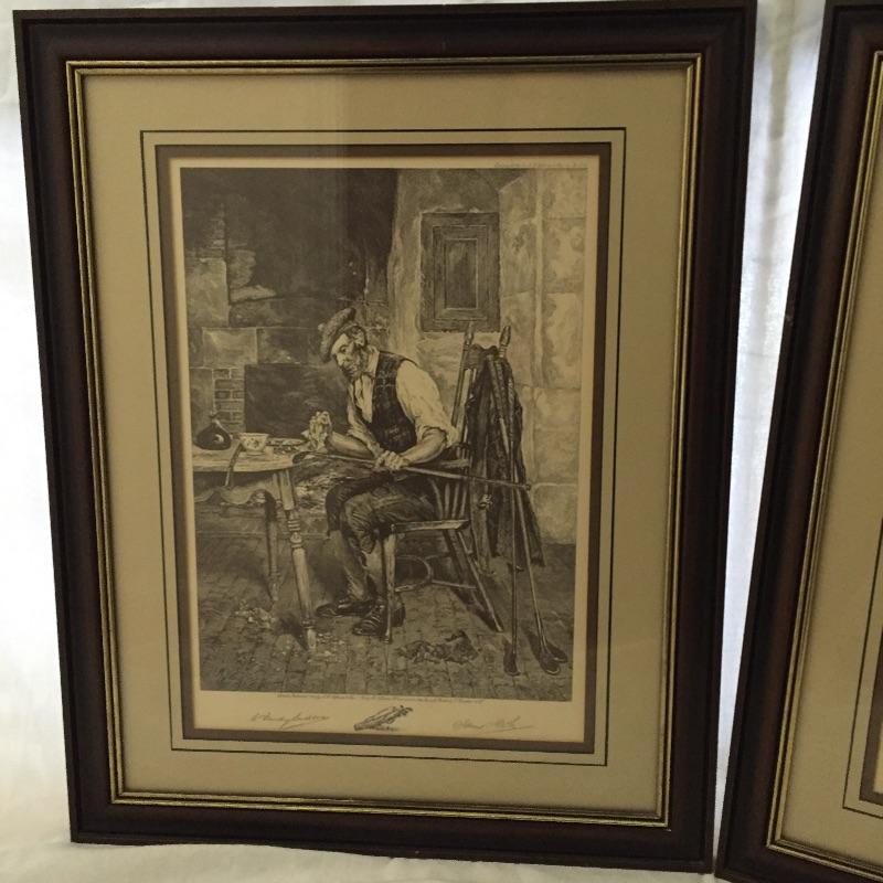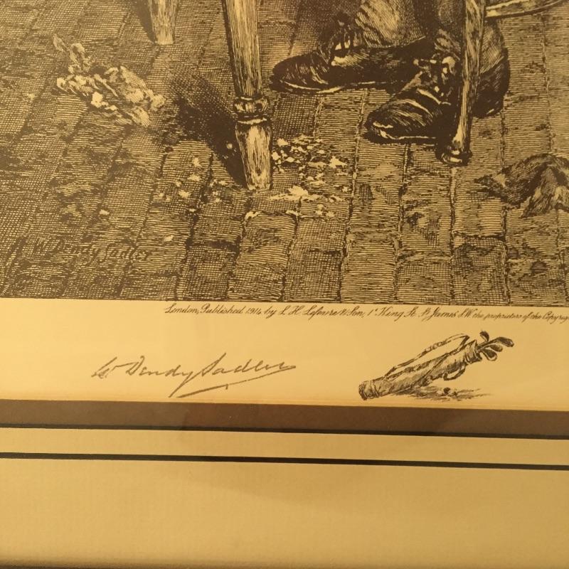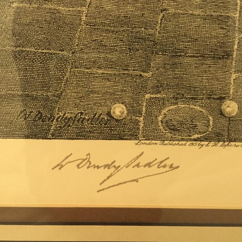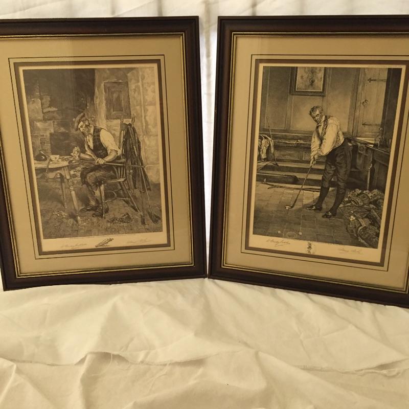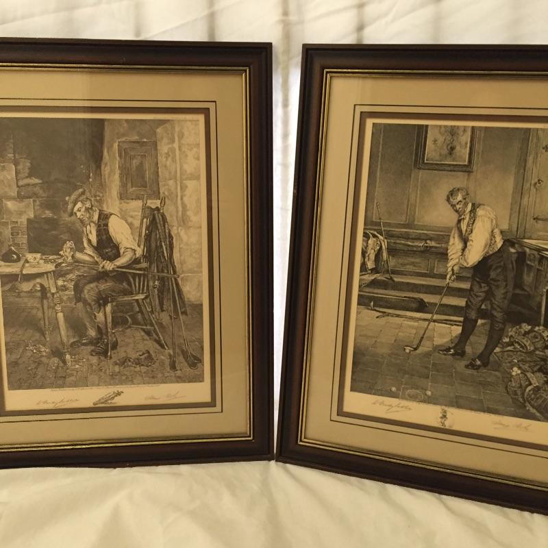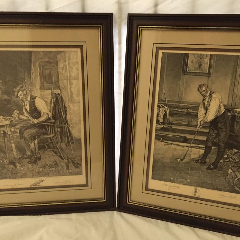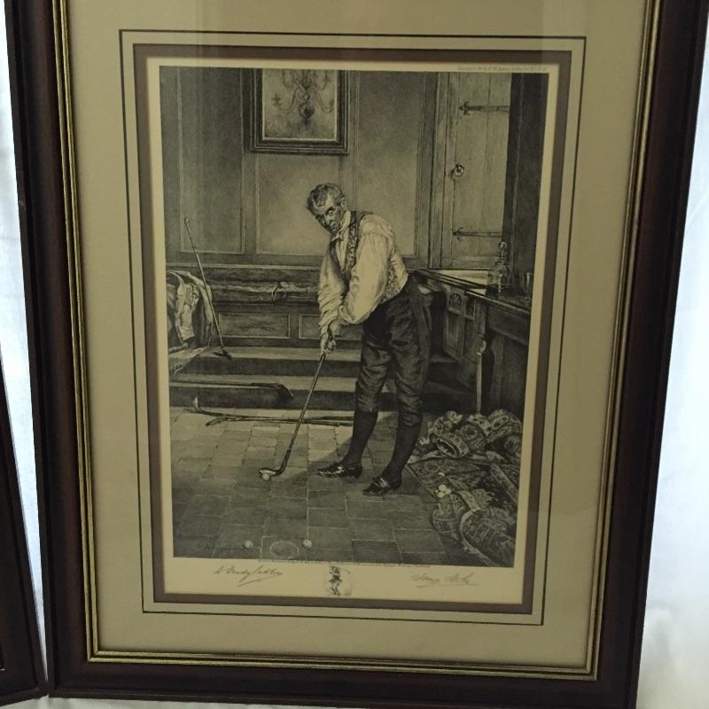 Don’t miss out on these two handsome golf themed etchings by W. Dendy Sadler and James Dobie. This artist was an Englishman from the late 1800’s. Both pieces have signatures and they are titled “London Published 1916” They are framed and double matted.