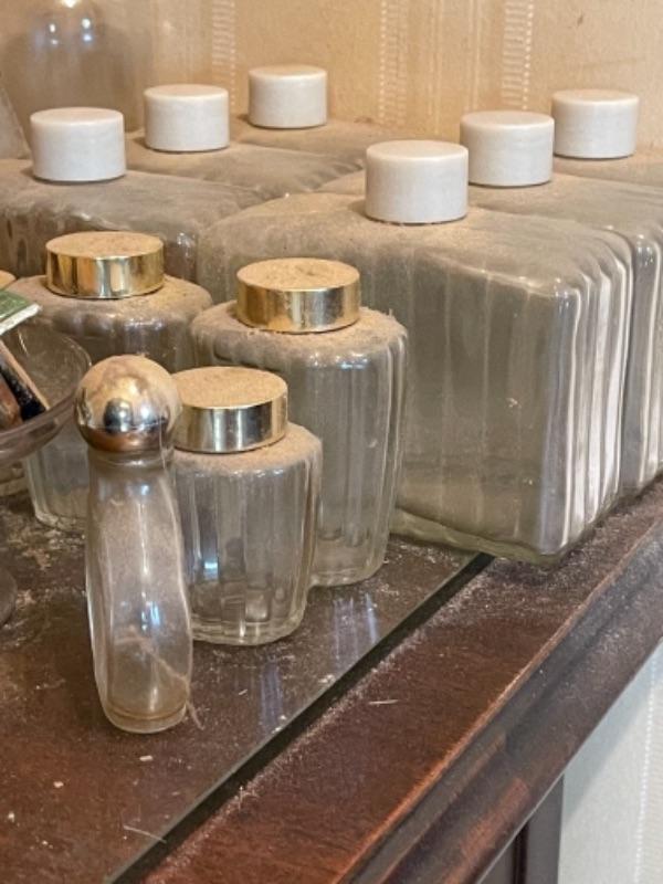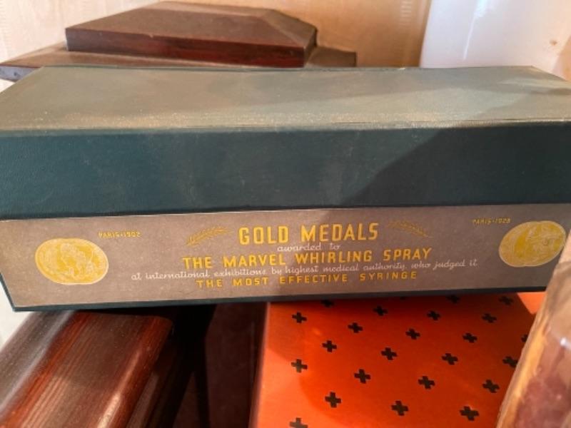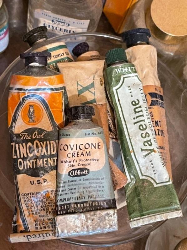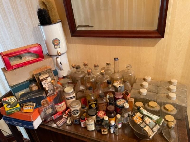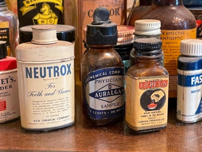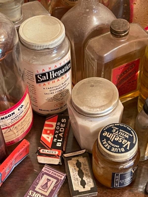 Lot 146F. Large lot of vintage pharmaceuticals samples, bottles, jars, enamel, medicine cabinet smalls, etc.--$85