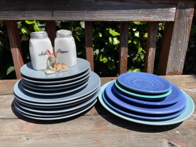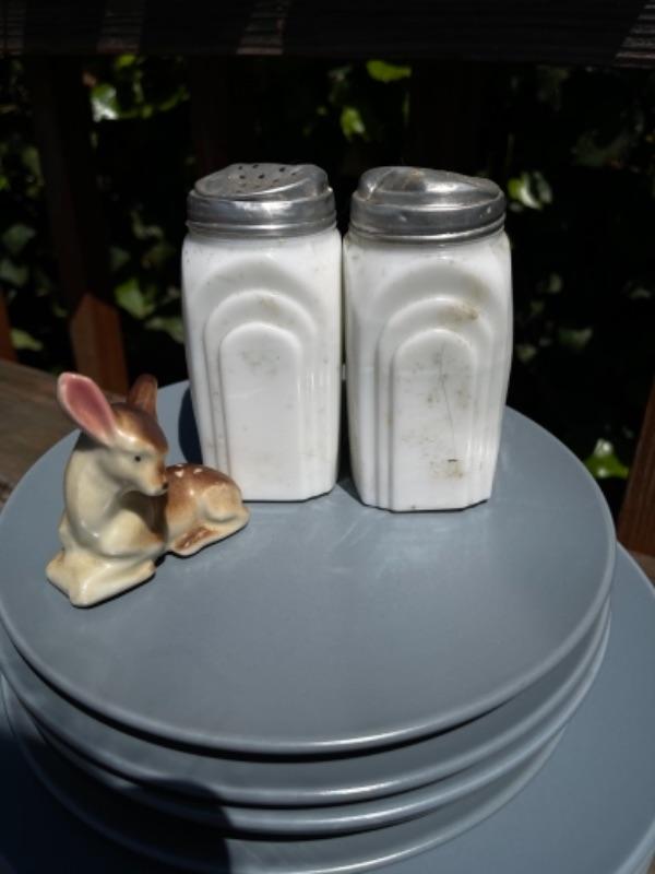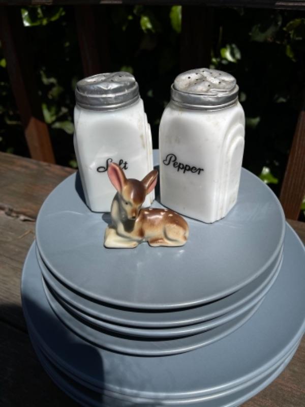 Lot 146G. Collection of pottery dishware and white jadeite salt and pepper shakers--$30