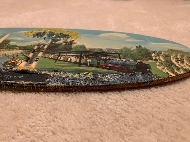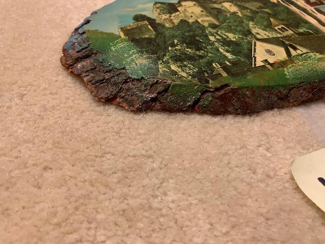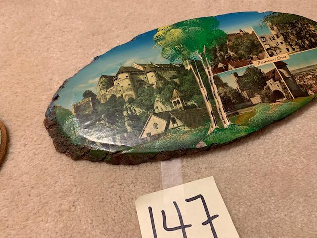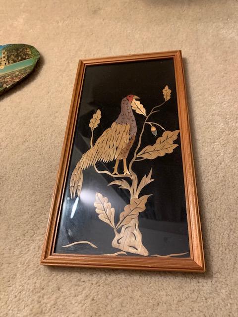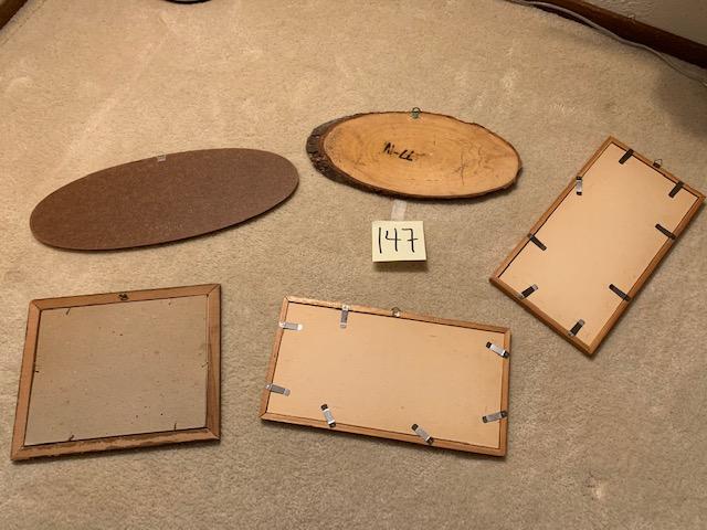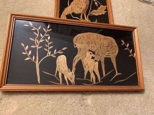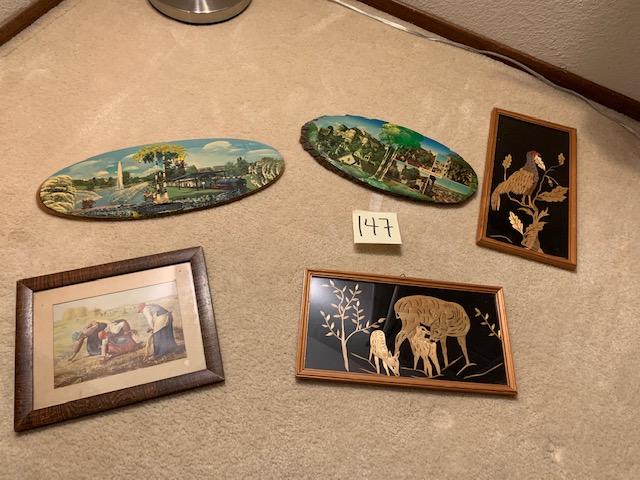 5 collectible pictures, 2 made on wood, 2 straw pics, plus