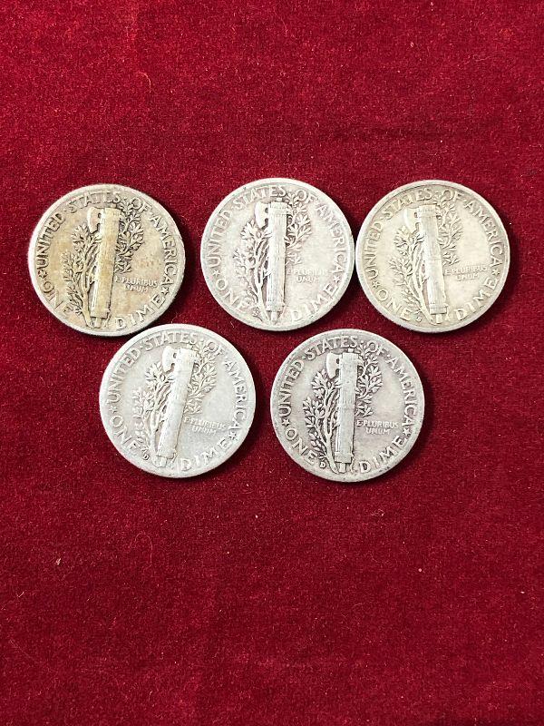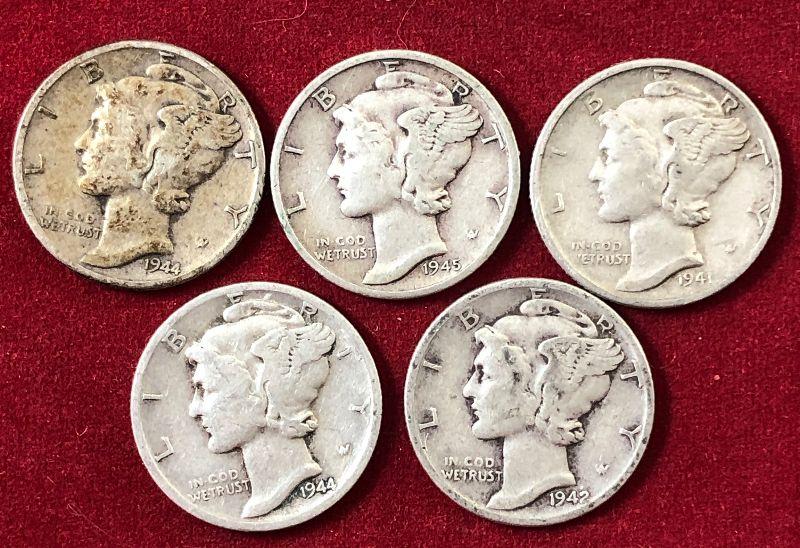Lot# 147 5 Silver Mercury Dimes 90%