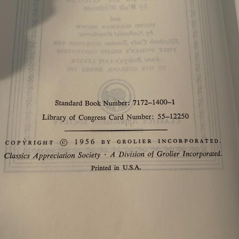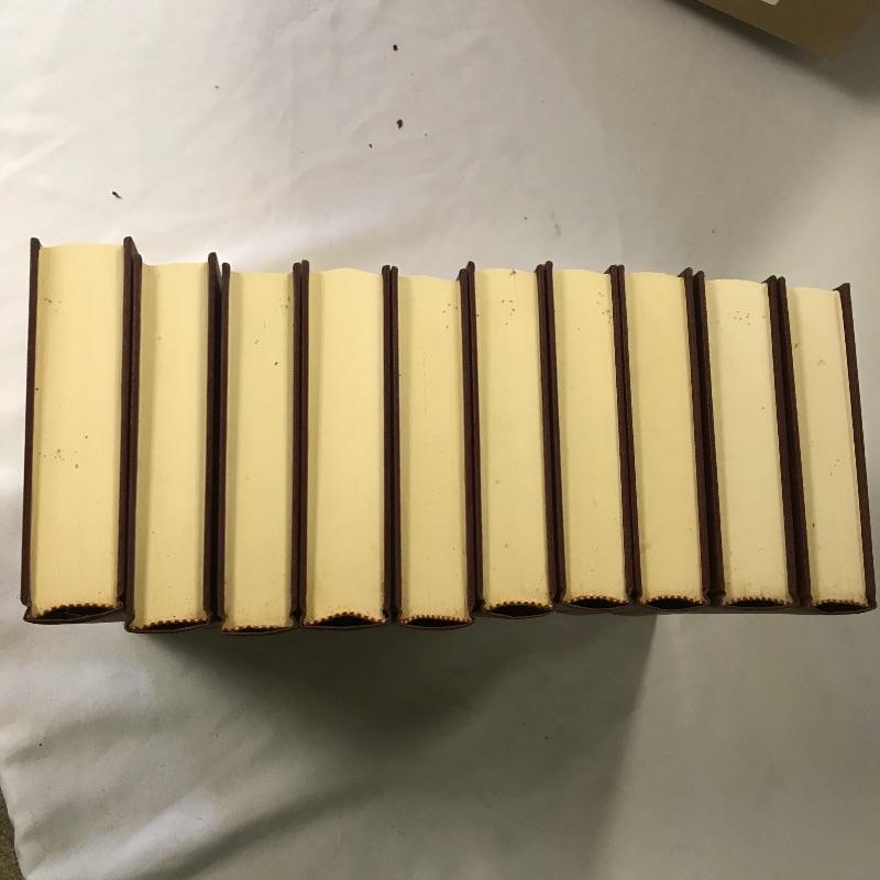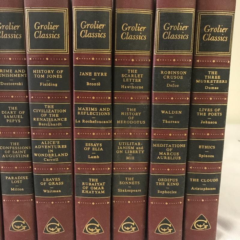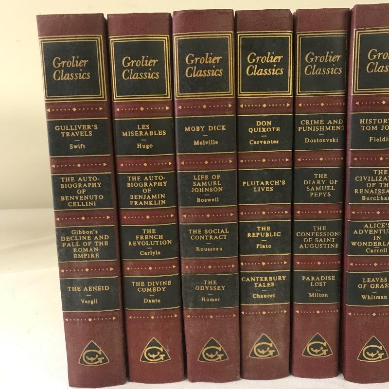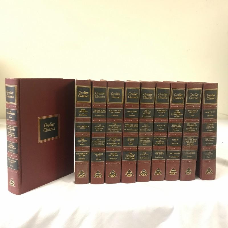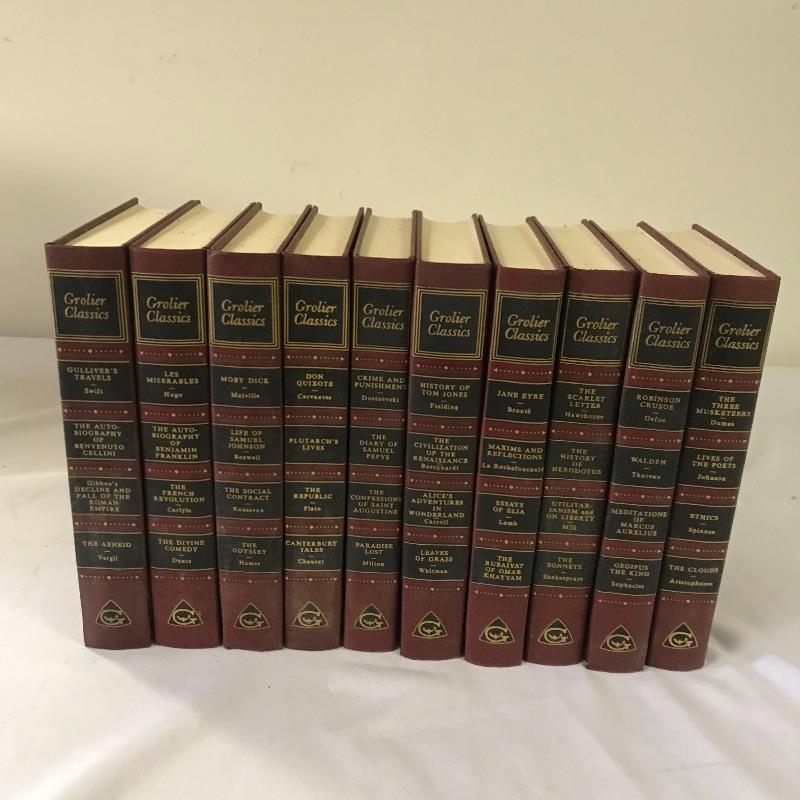 This lot includes one full set of ten Grolier classic books. This set includes The Odyssey, Alice In Wonderland, Crime and Punishment, Moby Dick, Les Miserables, and many more well known titles. Copyright dates range from 1955-1957, the majority are dated 1956. The covers can use a mild cleaning, the bindings all look great for their age!. Standard shipping available via UPS. Please call UPS at 828-252-6930 for a quote prior to bidding.
