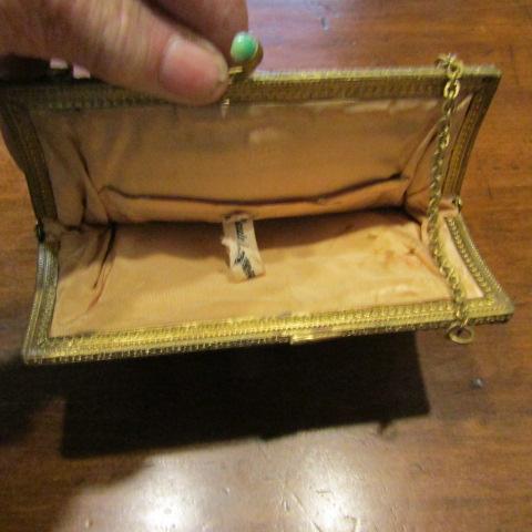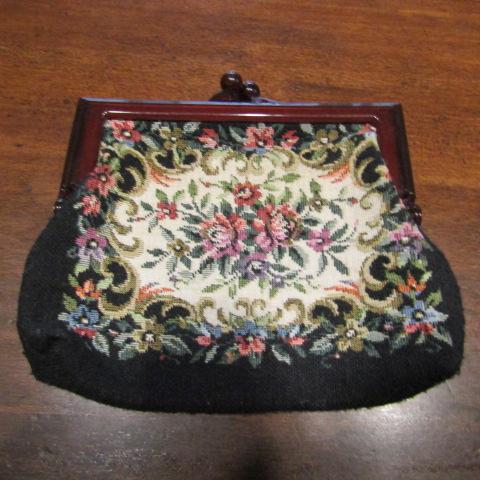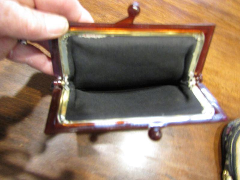 PURSE ON THE LEFT IS ANTIQUE TAPESTRY WITH GLASS SNAP LATCH.IN GOOD CONDITION. MADE IN GERMANY