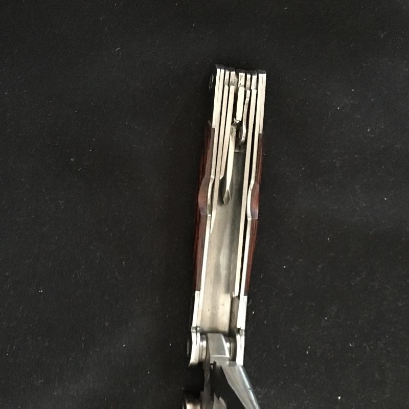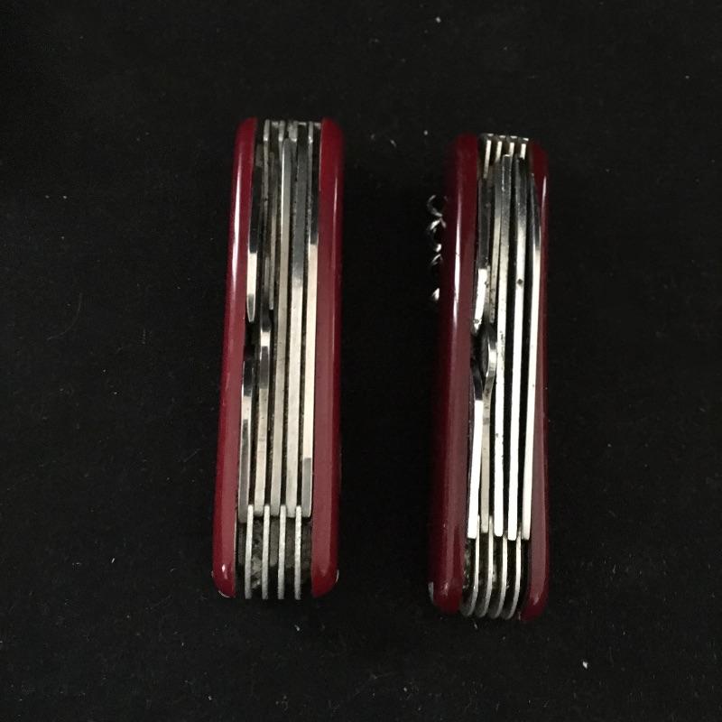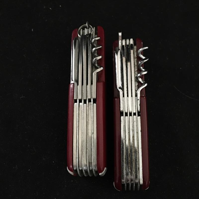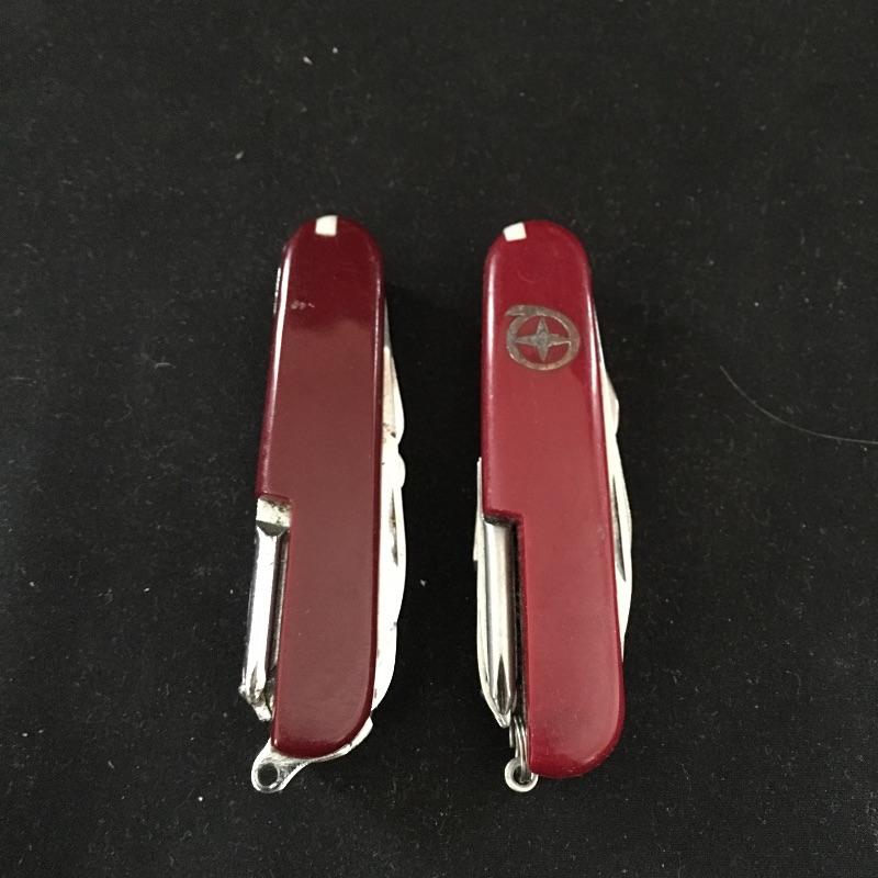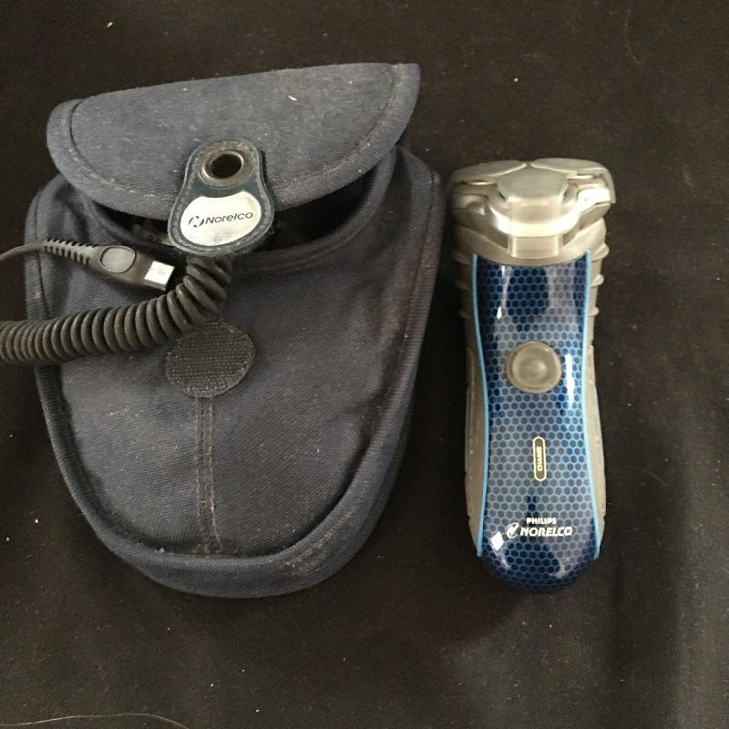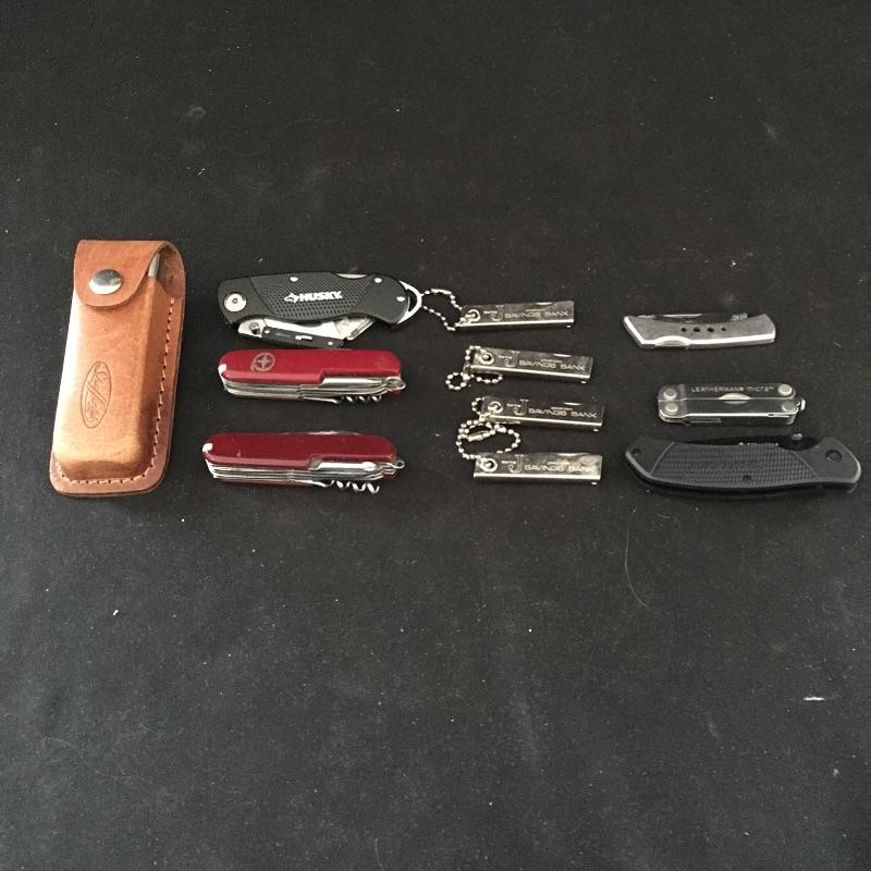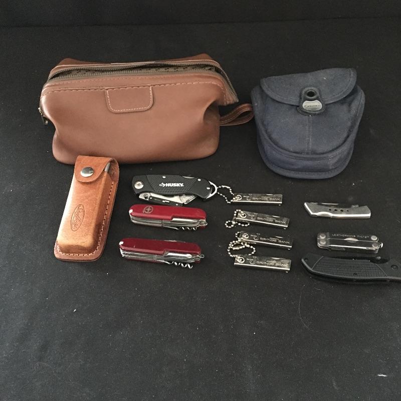 Collection of pocket knives, shaver and accessories. Lot includes Sheffield folding multitool, Leatherman Micra, pair of Husky knives, pair of Swiss Army knives, four keychain knives, Silver Falcon knife. Also includes Norelco electric razor model # 7140 XL and a shaving bag. Razor worked when tested. Sheffield tool measures 7” long when open.