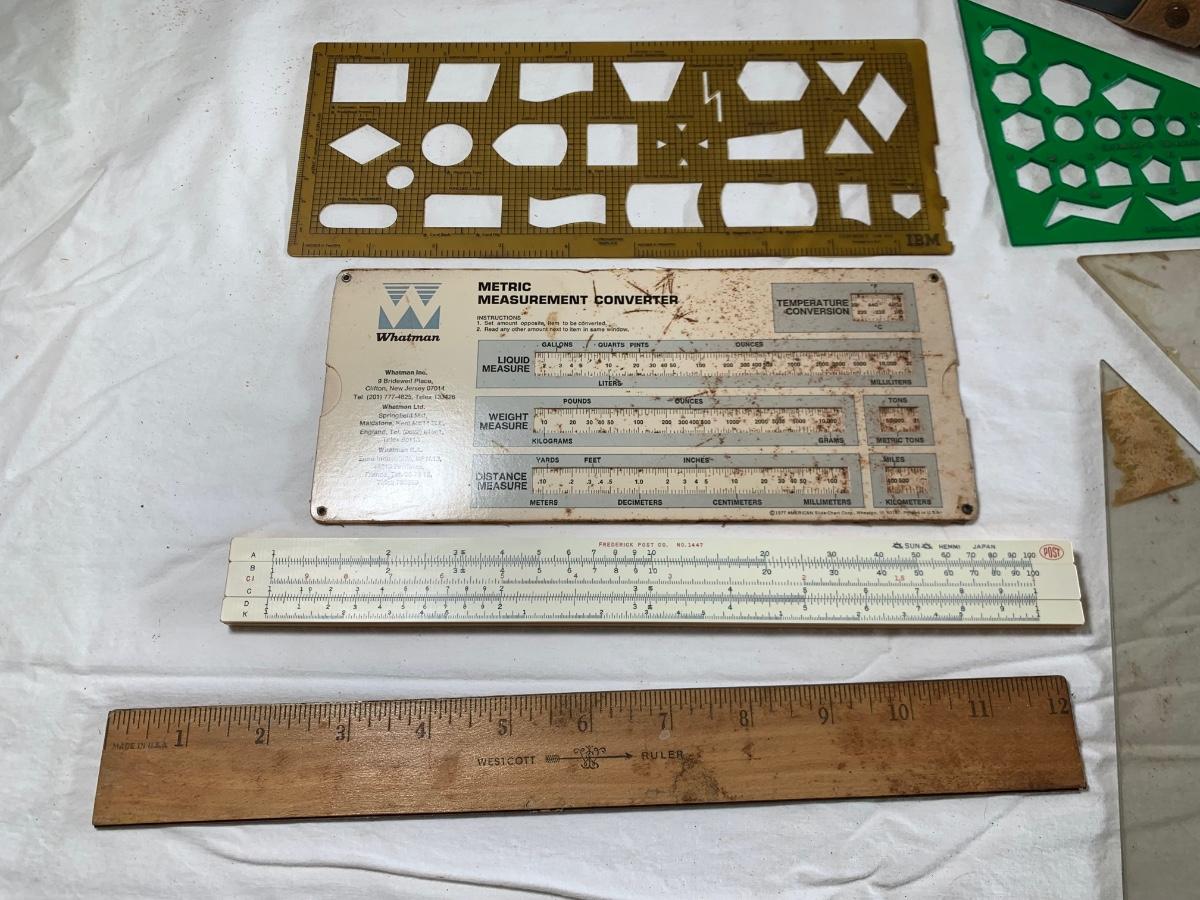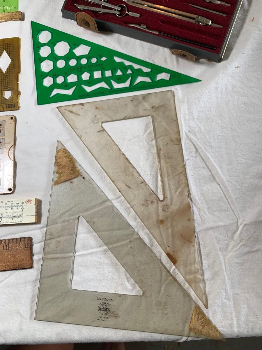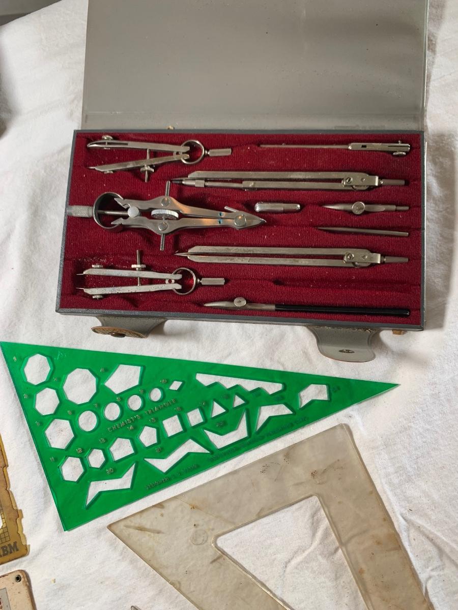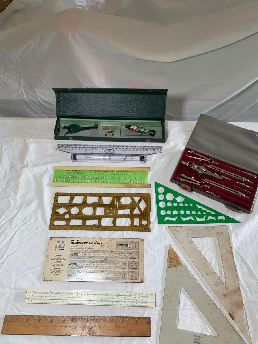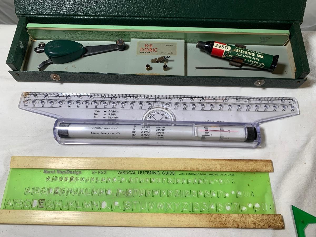Lot includes Vintage Leroy Doric Lettering Set 8915 KE Keuffel Esser Co original case, a rolling ruler, flowcharting template, vertical lettering guide, metric measurement converter, Chemists triangle, metal Compass Set