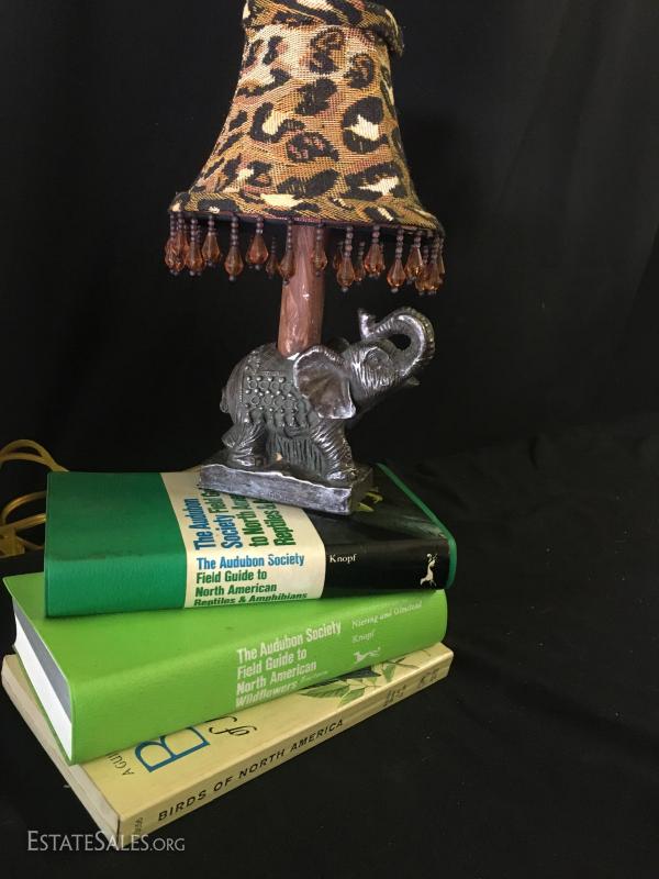 Various books including bird books and Audubon field books. Lamp measures 9.5" tall. This lot is avaiable for local pick up in Waynesville, NC only.