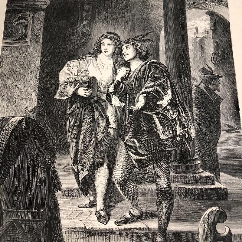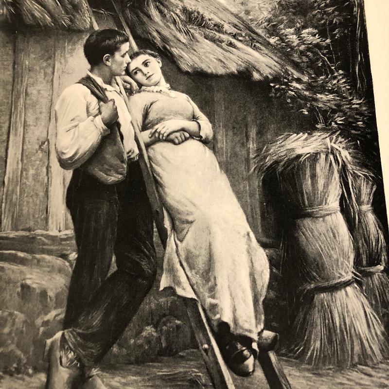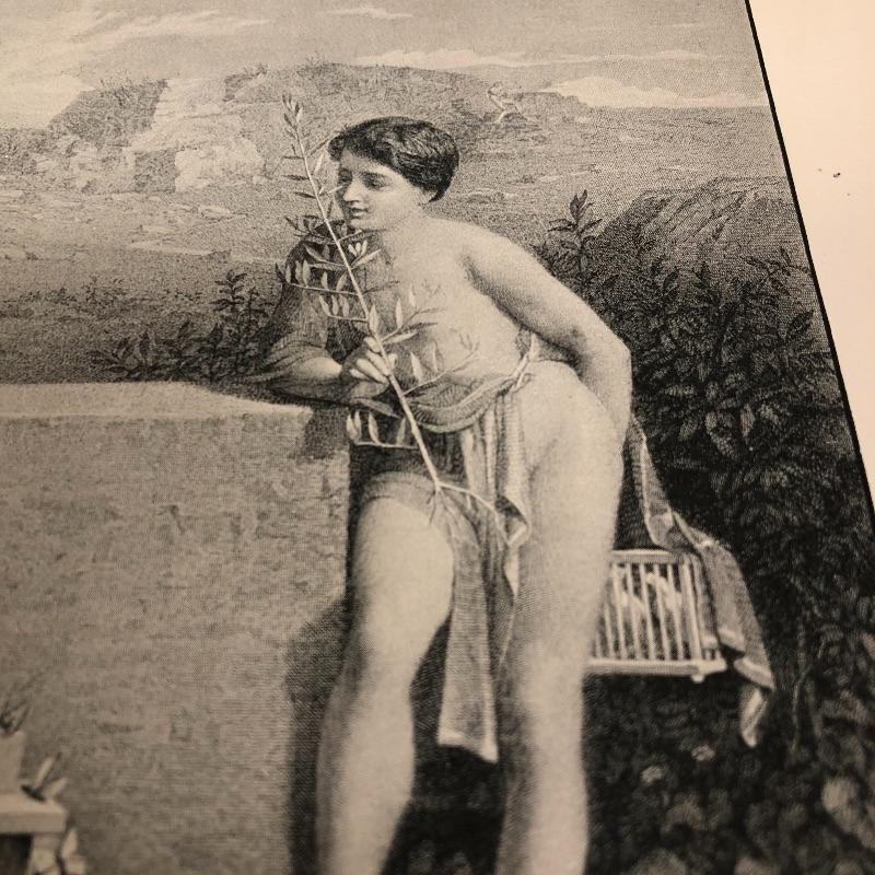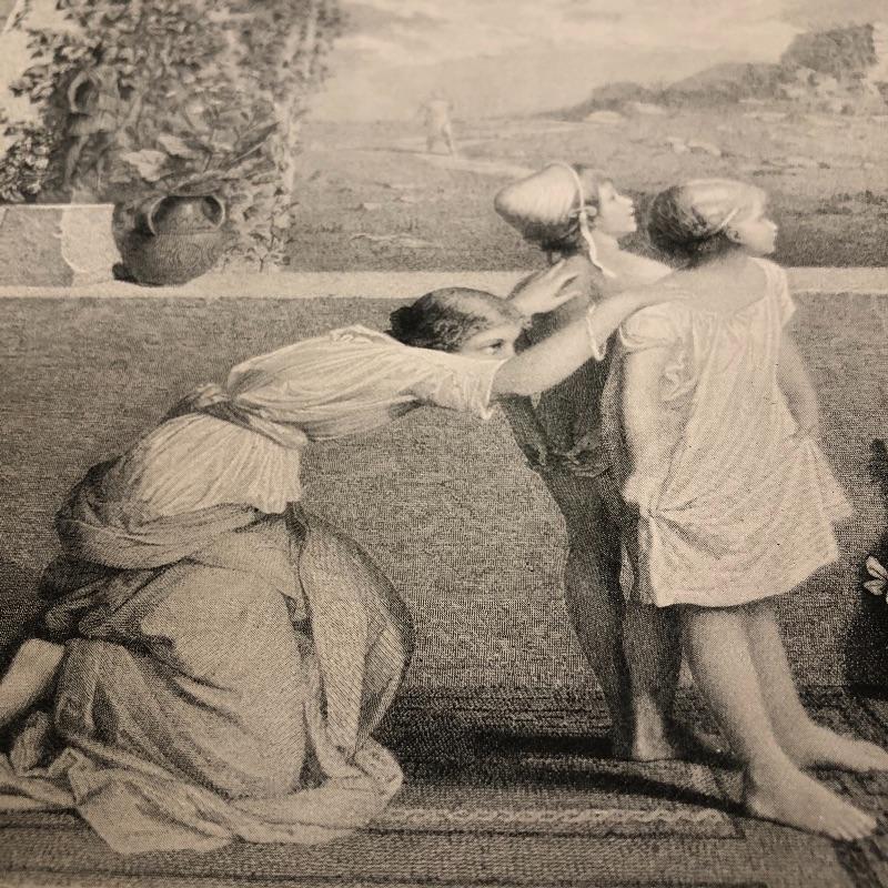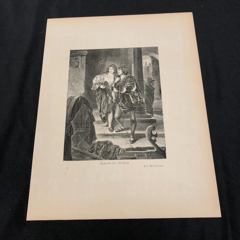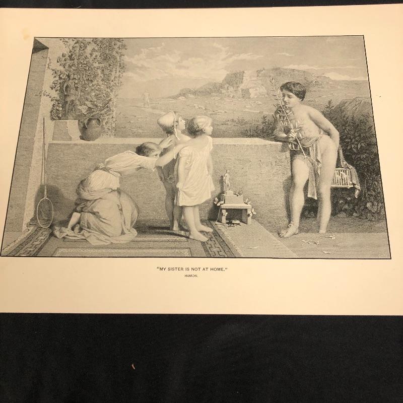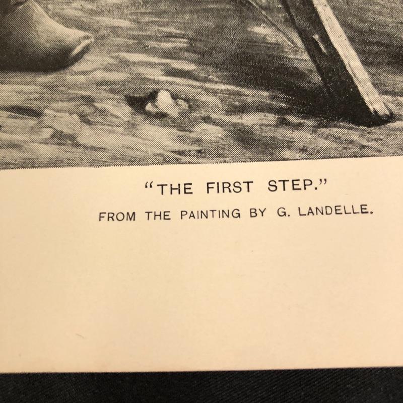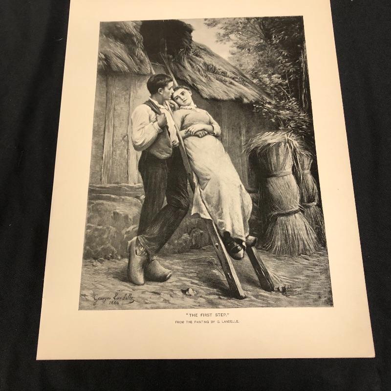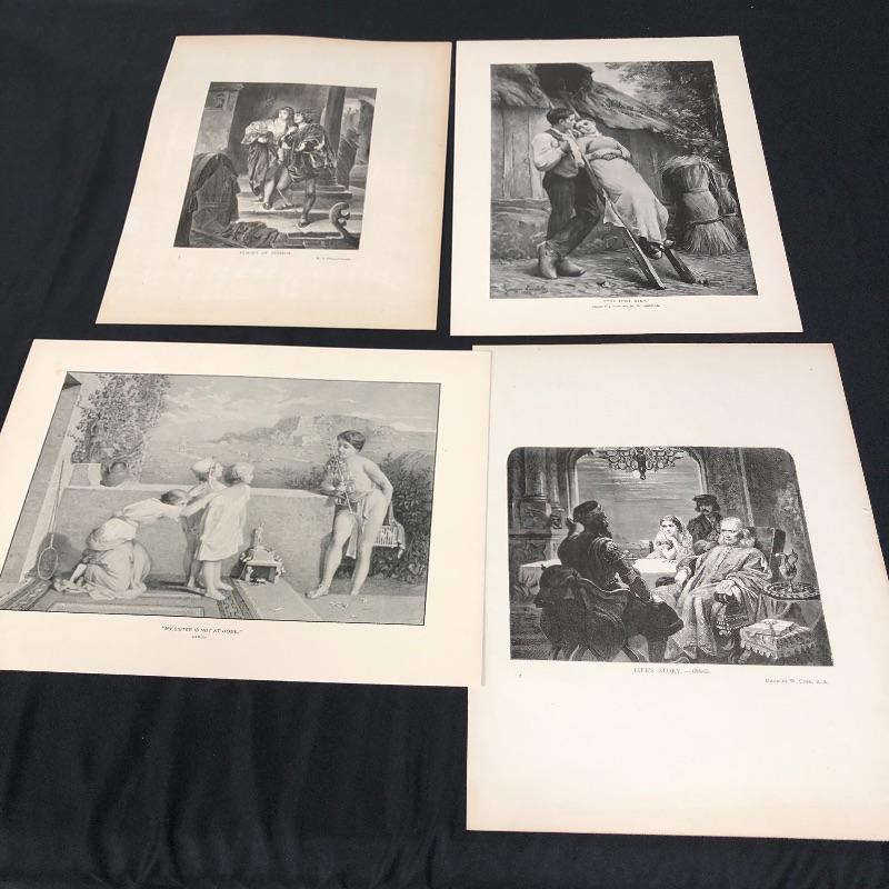 This lot includes a set of four miscellaneous prints. The first (9.5” x 12”) is titled “Life’s Story”. The number “1875” is written in pencil on the back. The second (9.5” x 12.5”) is titled “The First Step” and has a signature on it. The third (9.5” x 12.25”) is called “Flight of Jessica” and has very minimal staining around the edges. The fourth (12.5” x 9.5”) and final print is called “My Sister is Not at Home.” Unknown medium on these. Two seem like photogravures and the other two print copies on shiny paper.
