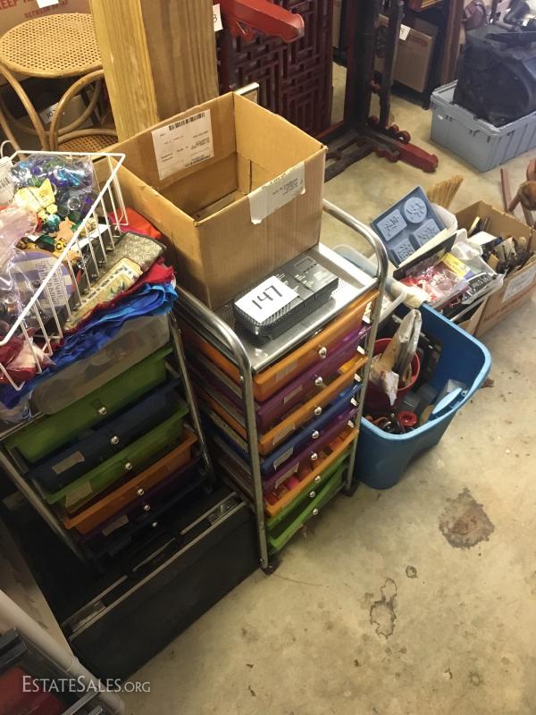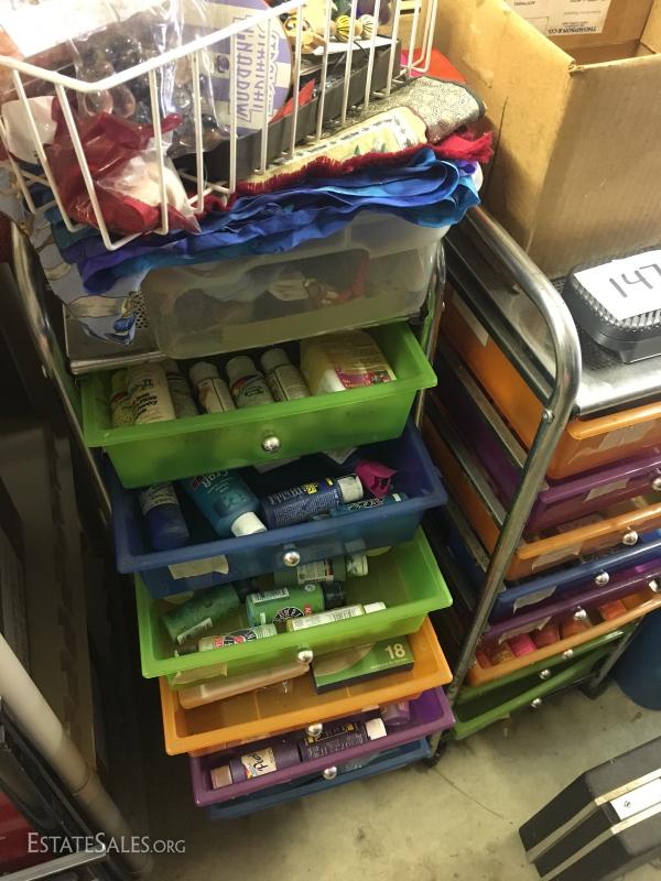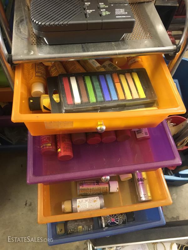 Rubber stamps, paints, brushes, scrap booking, and much more including two-wheeled storage carts measuring 37.5" tall. This lot is available for local pick up in Waynesville, NC only.