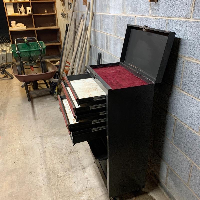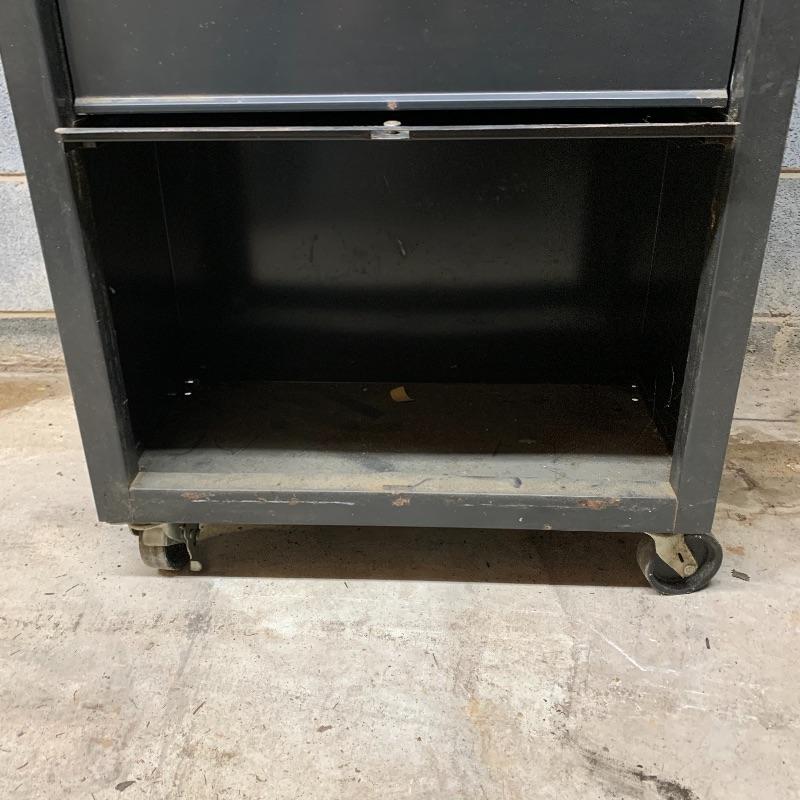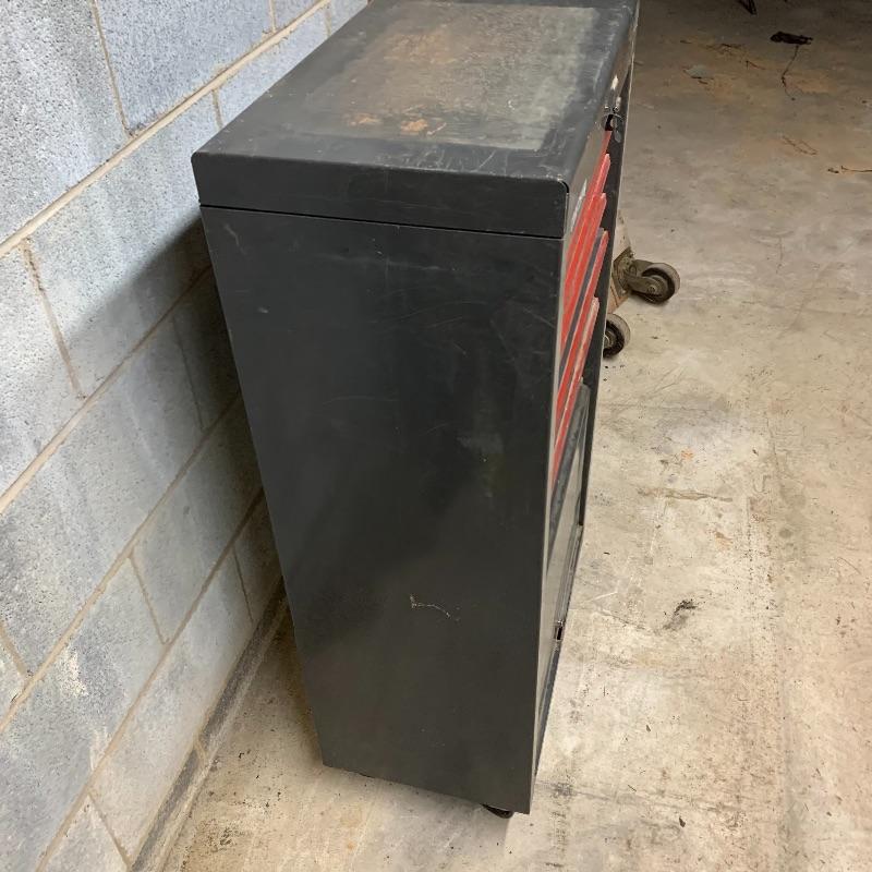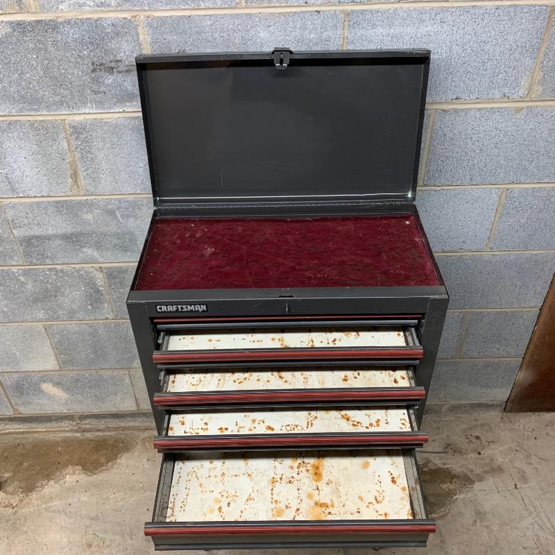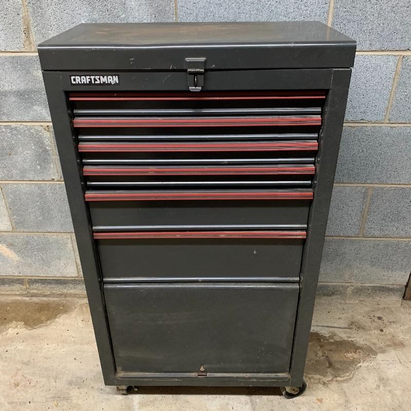 Increase storage space in your workshop or garage. This sturdy Craftsman tool chest has a lid that opens, 6 drawers, and a large storage area on the bottom with its own door. This chest measures 22" wide x 40” tall x 12” deep. There is some surface rust and a few scratches as this chest has been functional in a wood shop. The casters also need to be oiled or fixed. The locking bar is also included. but not pictured. Local pickup only.