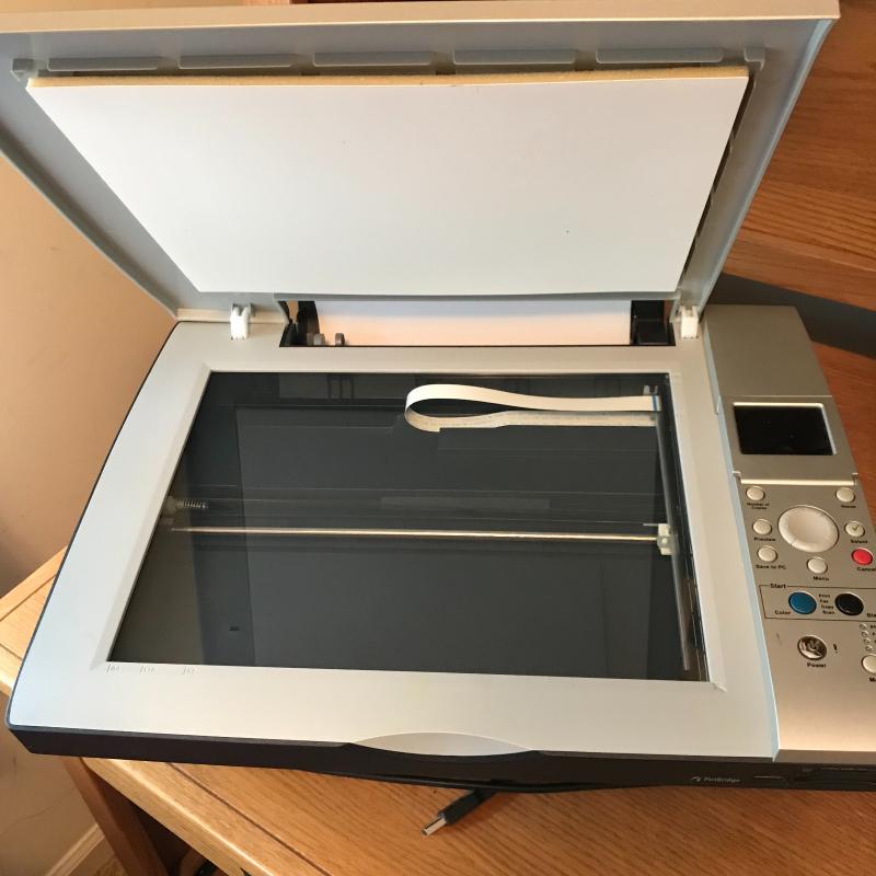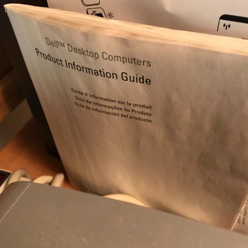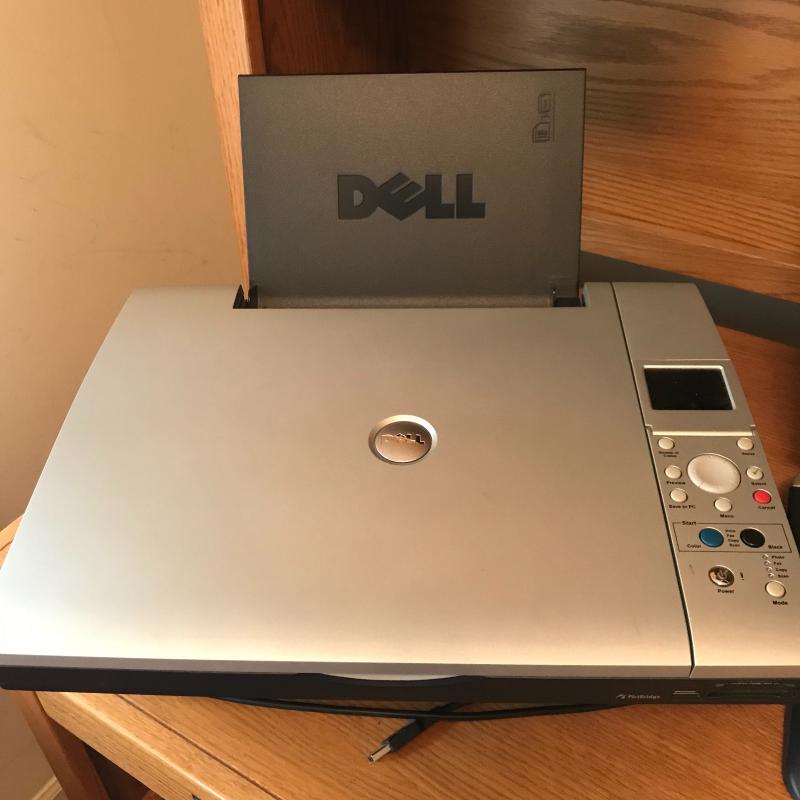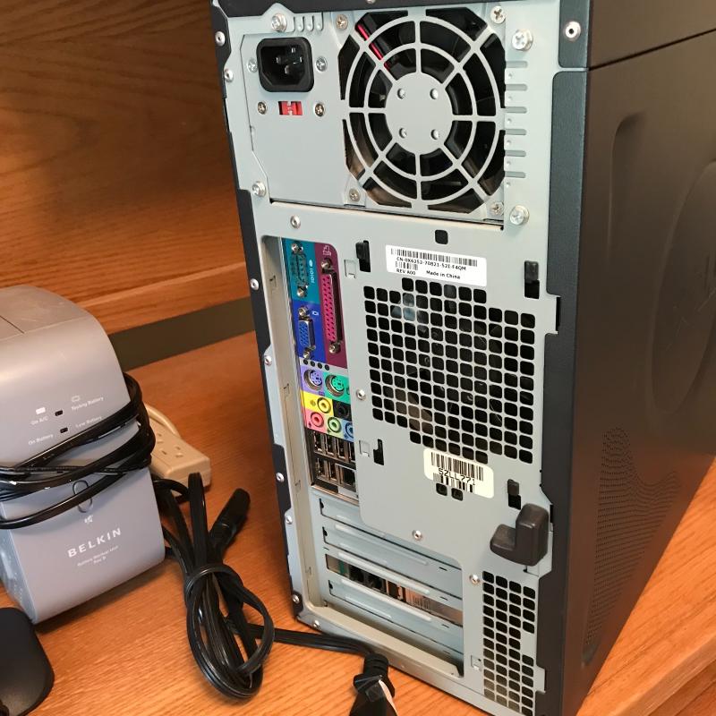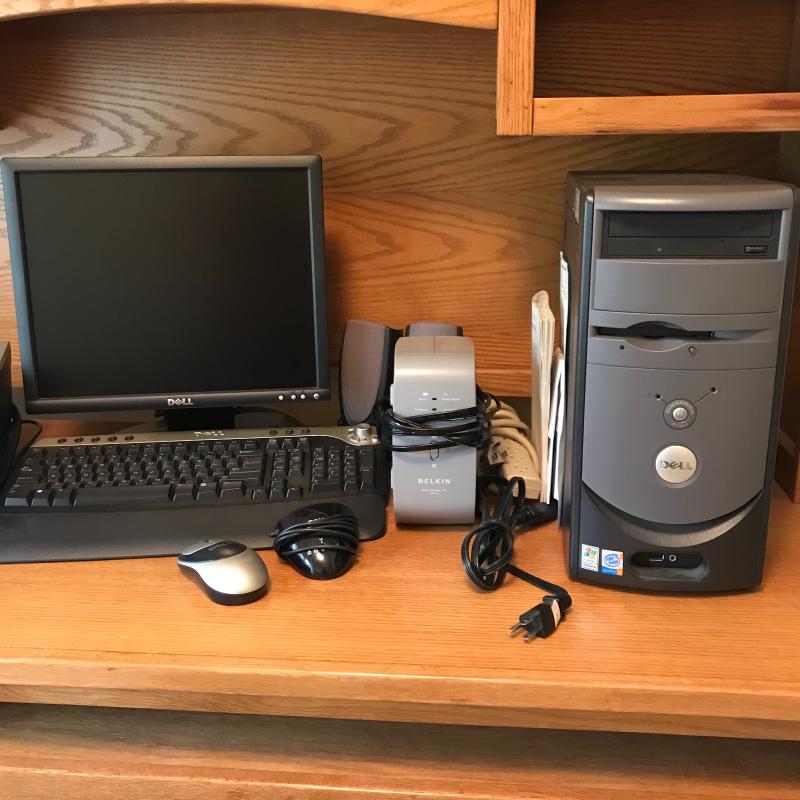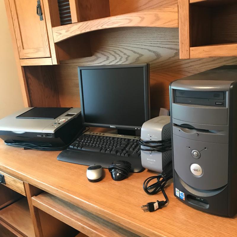 Complete Dell PC lot with printer/scanner combo, wireless mouse, keyboard with detachable ergonomic rest, speakers, 17” monitor, Dell wireless, surge protector and a Belkin backup battery. Hard drive has been removed from desktop. Local pick up only.