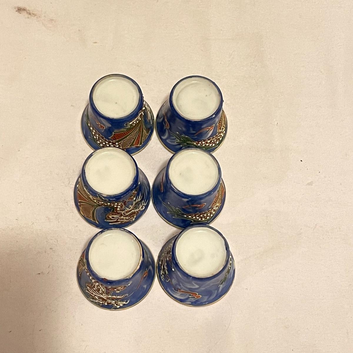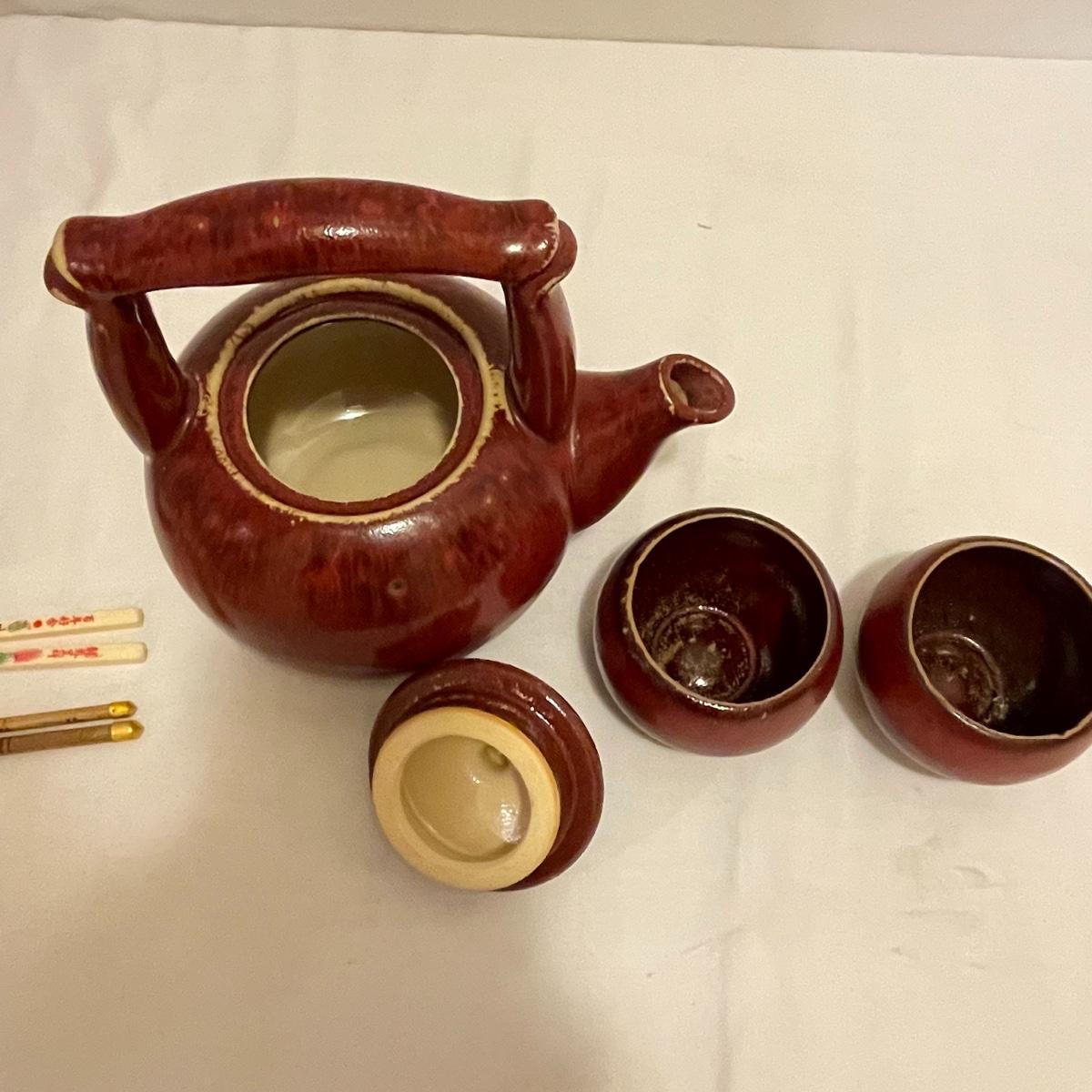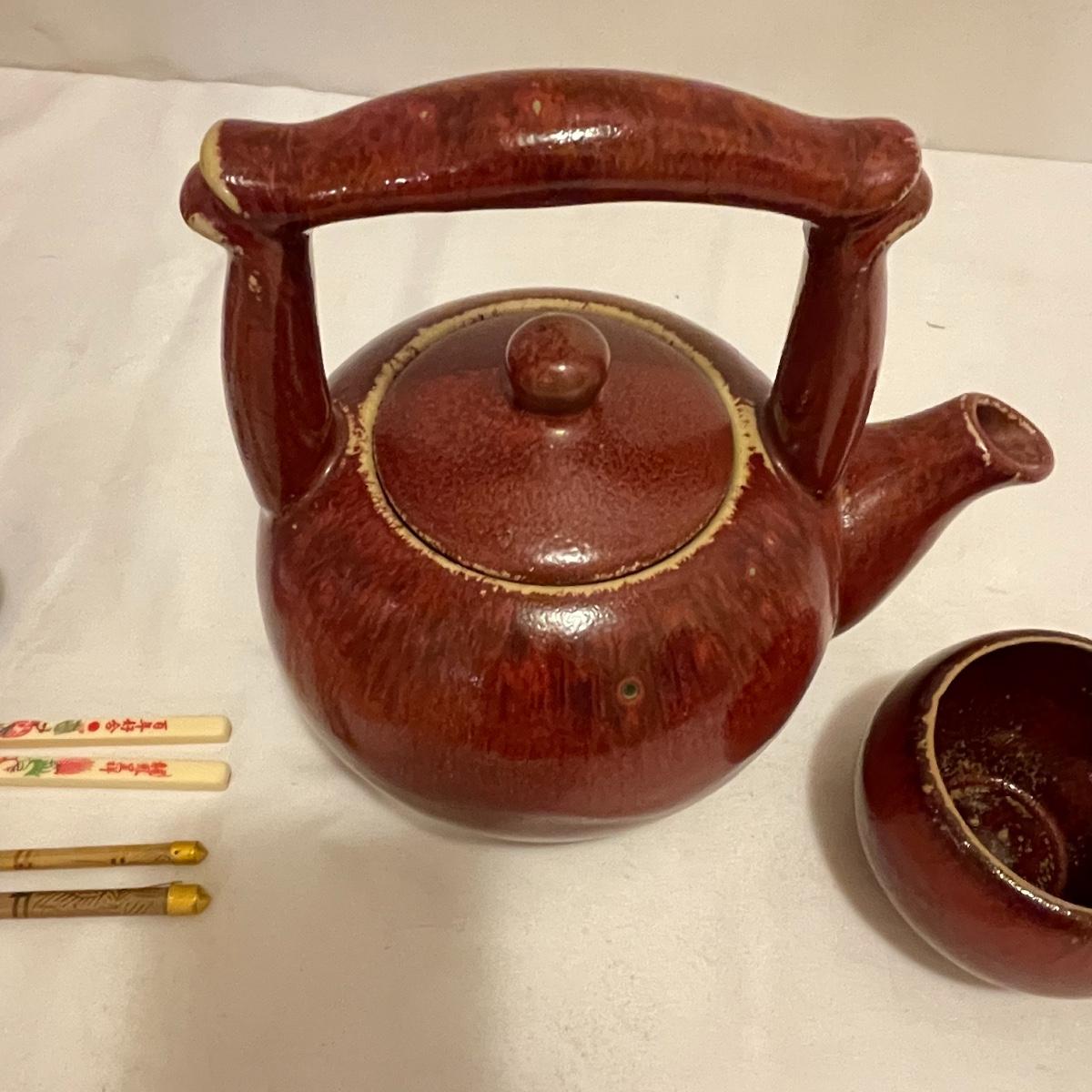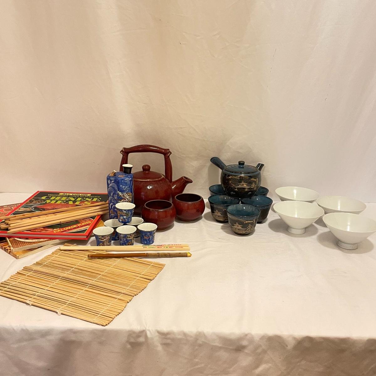 What a beautiful collection of East Asian Pottery and more! Lot features a deep blue teapot with strainer and five matching gold designed cups. Next in images you’ll find a dark maroon tea pot with two globe like cups. A stunning collection of a Sake pitcher and six cups with what appears to be hand painted matching dragons. Lot also includes a sushi roll mat, red marked bamboo chopsticks with two other pairs and three cookbooks. The sake pitcher is about 2.25” x 2.25” x 6”. See images. Shipping available.