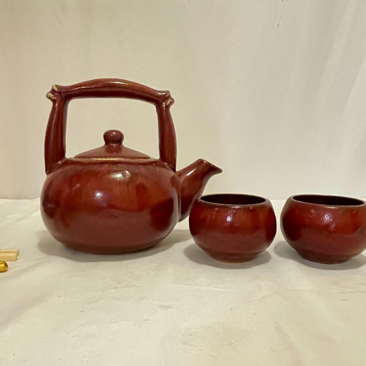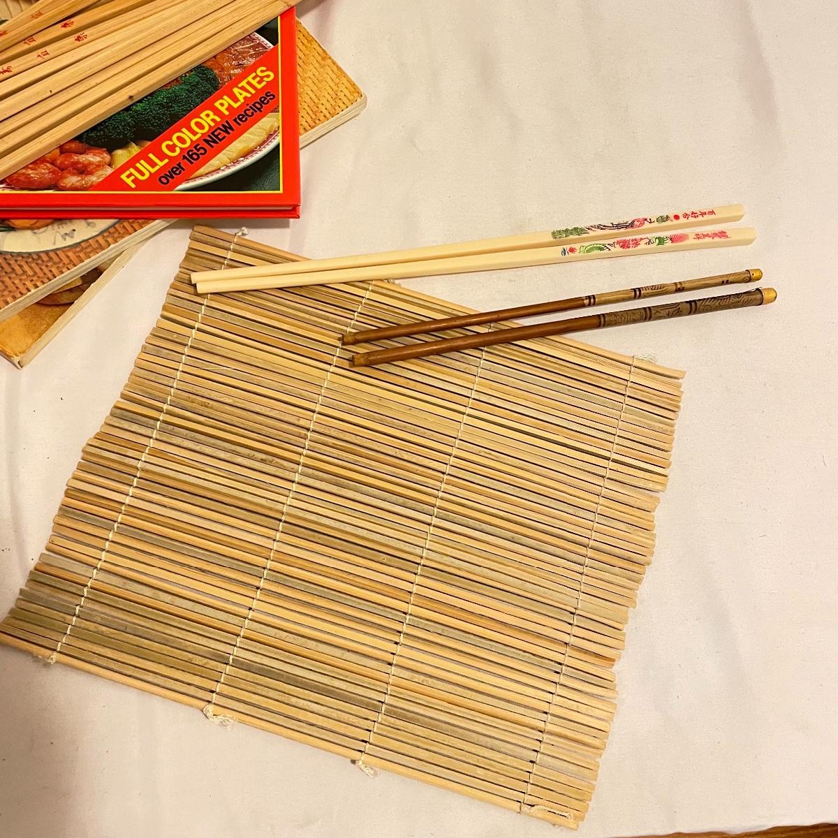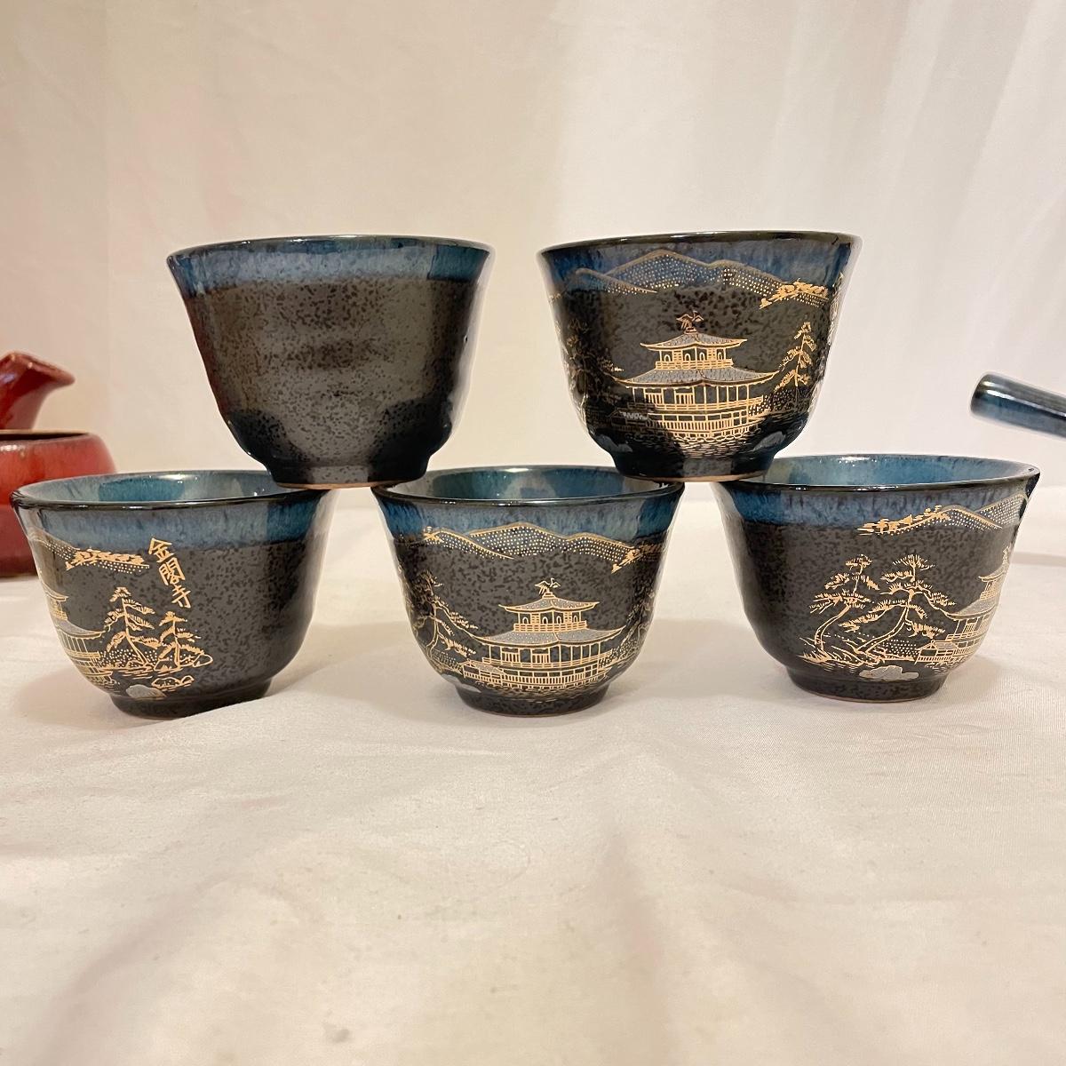 What a beautiful collection of East Asian Pottery and more! Lot features a deep blue teapot with strainer and five matching gold designed cups. Next in images you’ll find a dark maroon tea pot with two globe like cups. A stunning collection of a Sake pitcher and six cups with what appears to be hand painted matching dragons. Lot also includes a sushi roll mat, red marked bamboo chopsticks with two other pairs and three cookbooks. The sake pitcher is about 2.25” x 2.25” x 6”. See images. Shipping available.