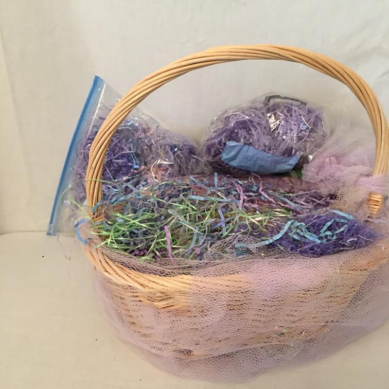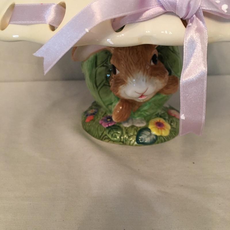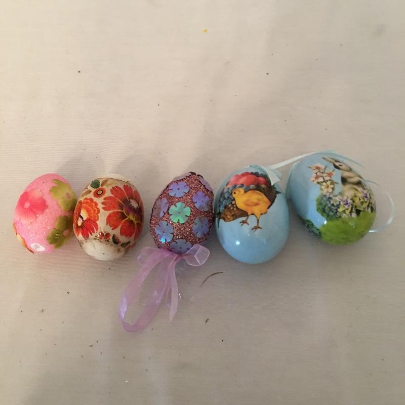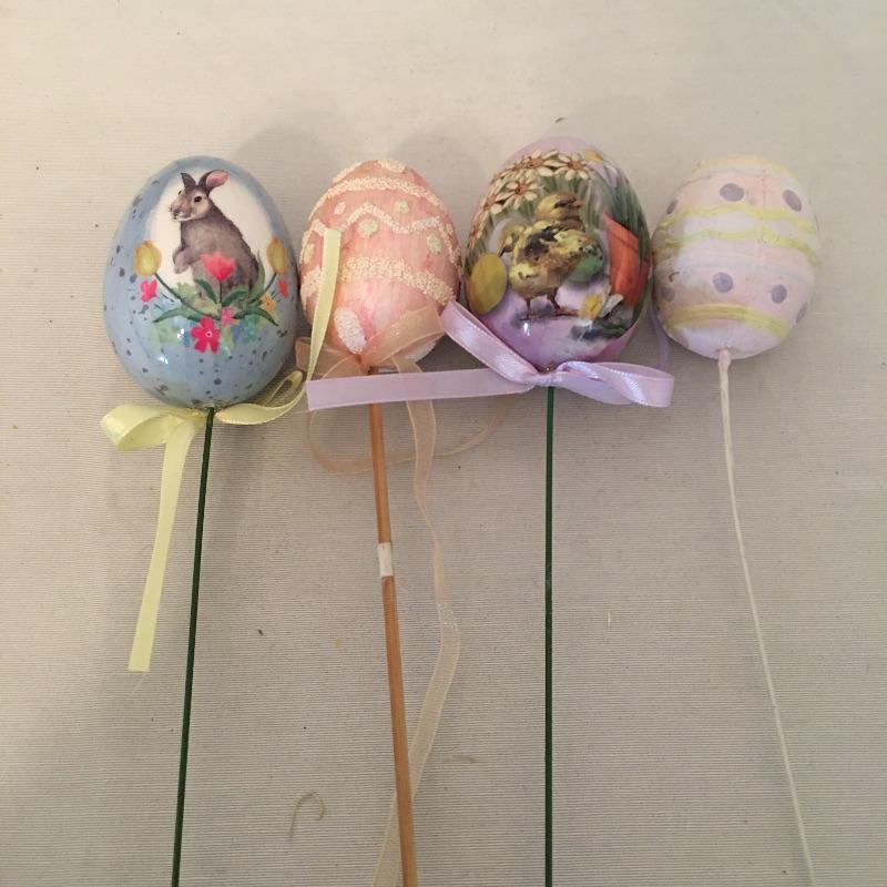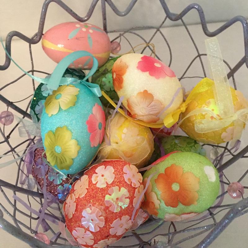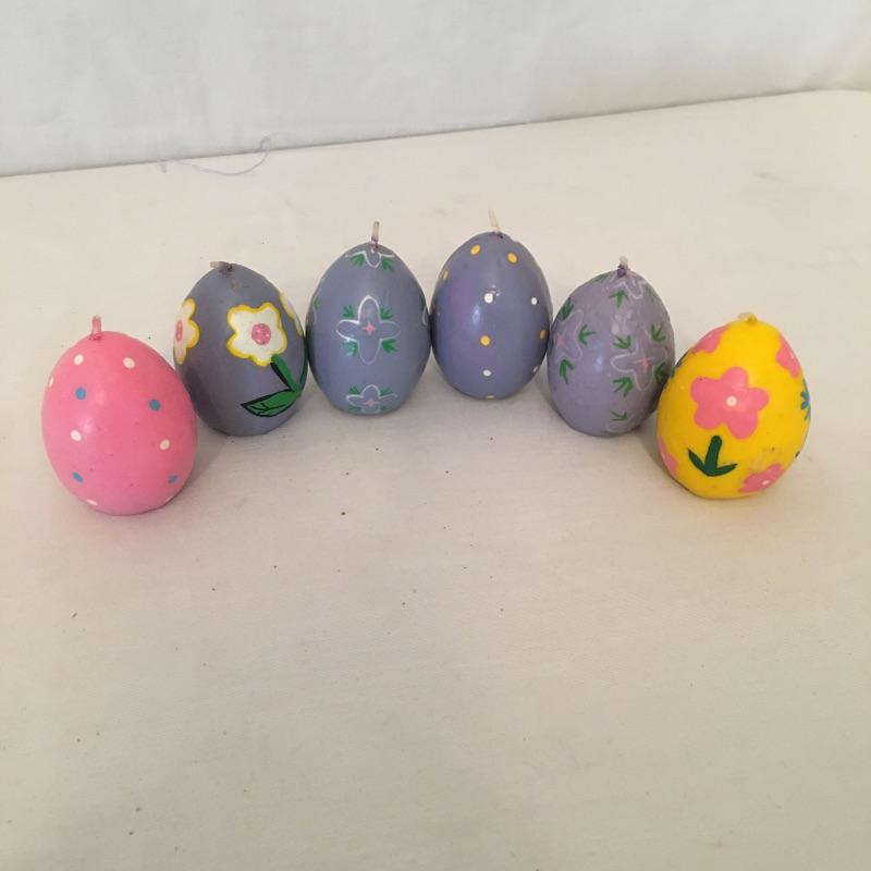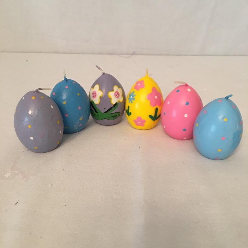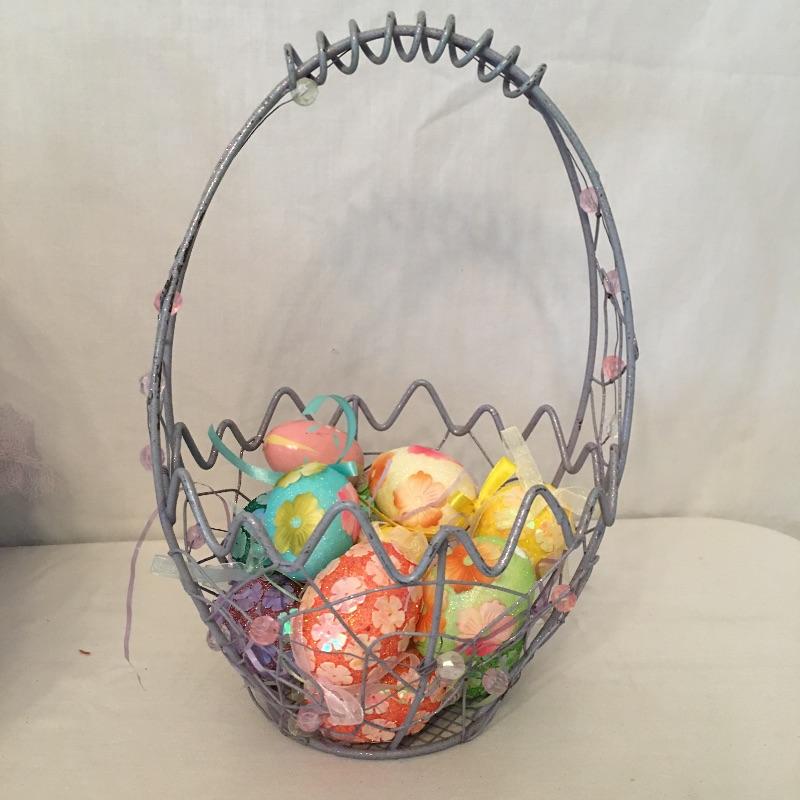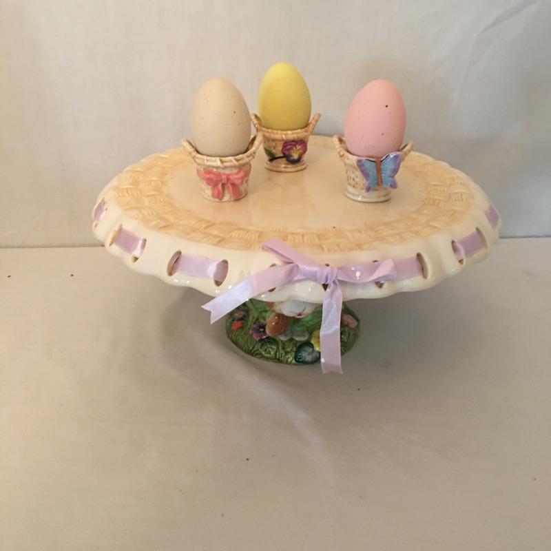 This very sweet, quaint Easter egg collection includes cake display stand, twelve candle eggs, metal basket, decorative eggs, wicker basket and more.