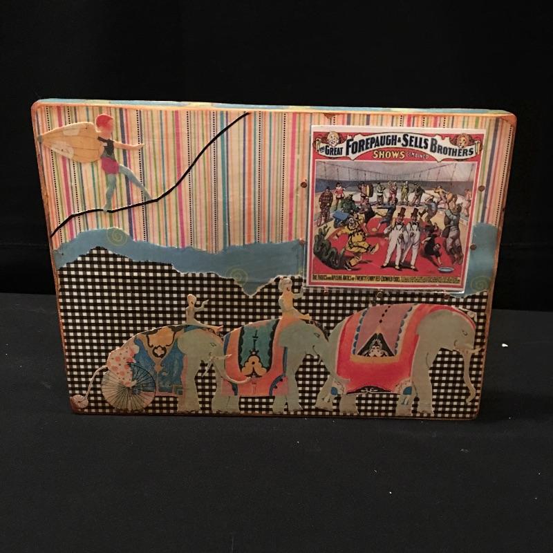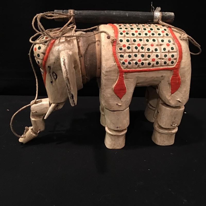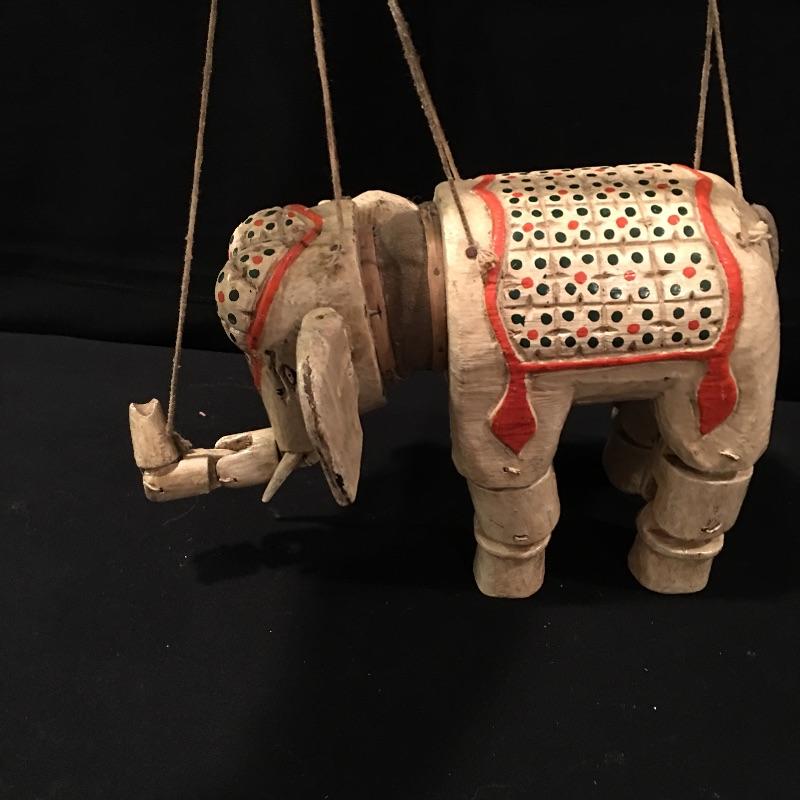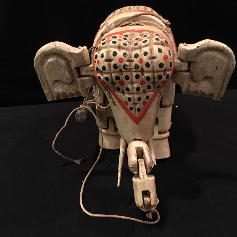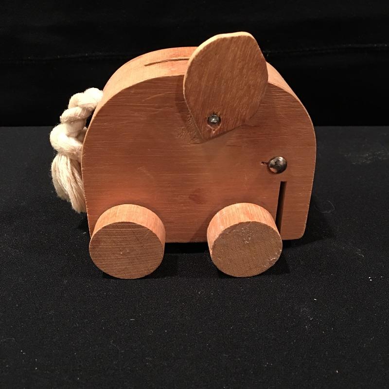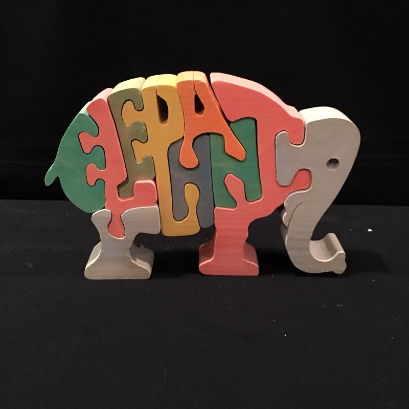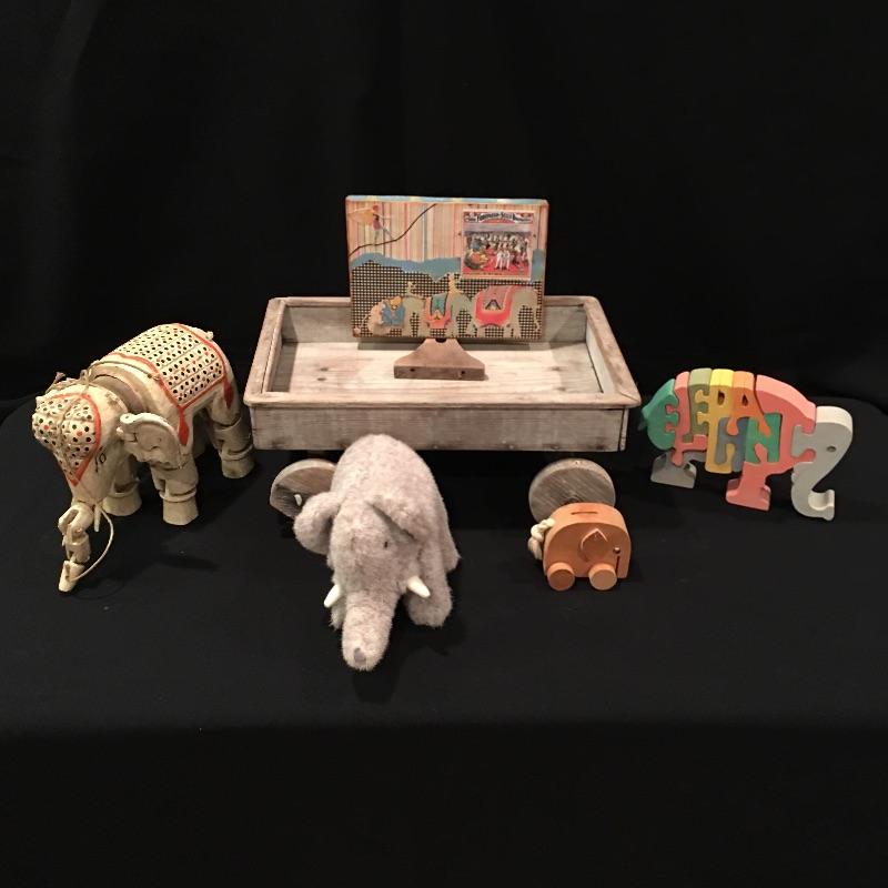 Whimsical array of elephant toys including elephant spelling puzzle, stuffed elephant, wooden elephant on string and small wooden wagon. Wagon measures 11” x 17” x 6.5”. Great gift for the young and young at heart.