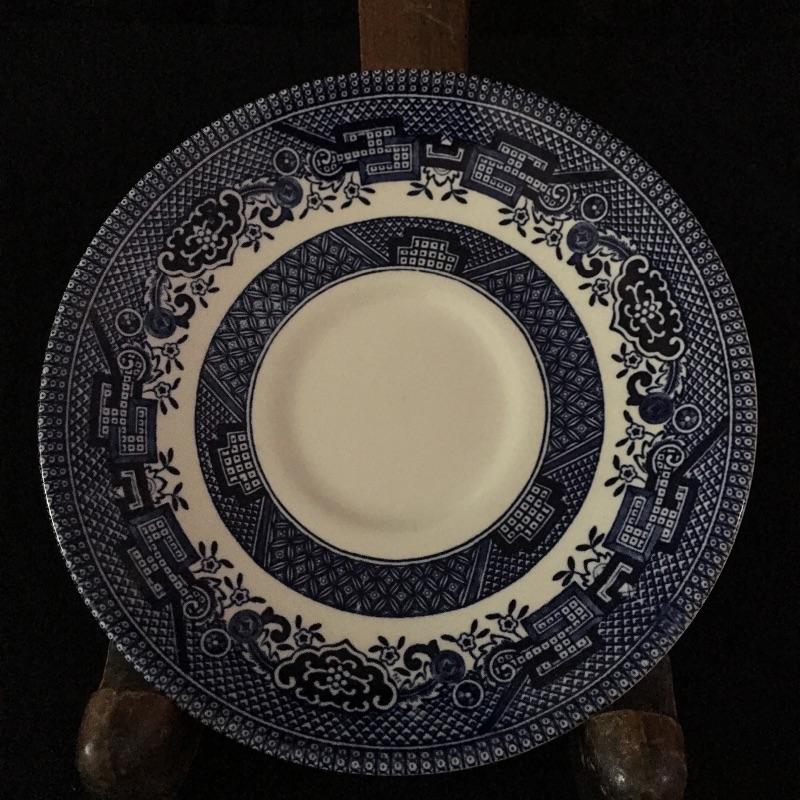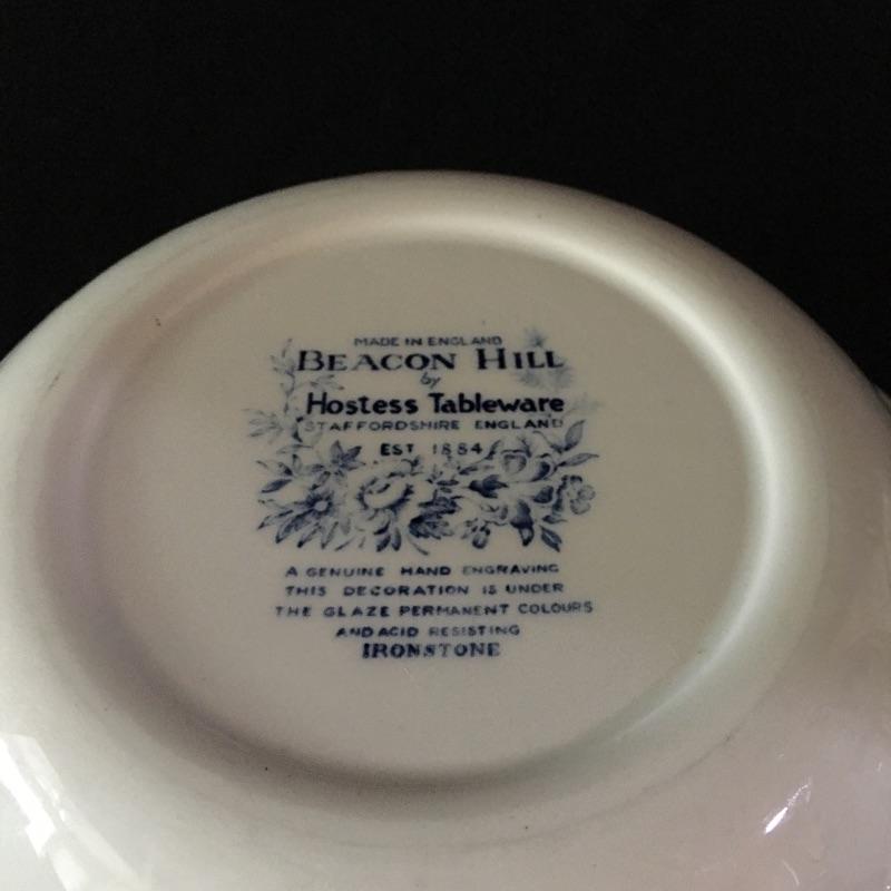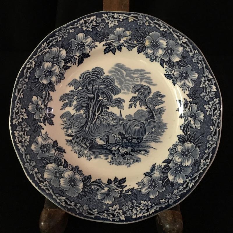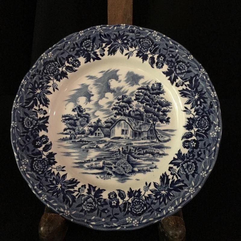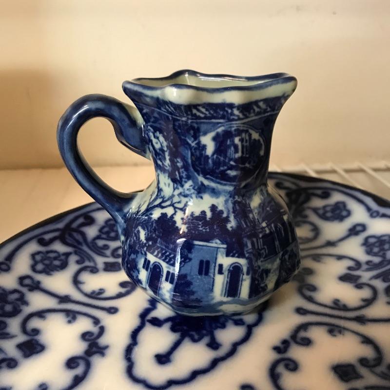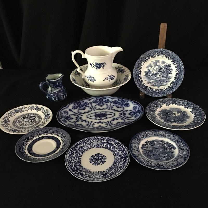 Great assortment of blue and white English China that includes six small plates, platter, bowl, pitcher and small pitcher. See images for more details on each piece. Platter measures 8” x 10.75”.